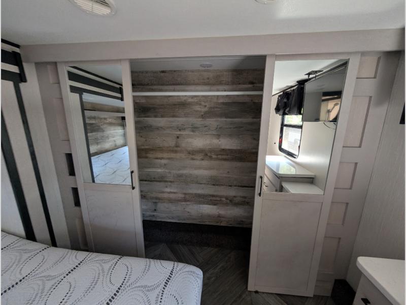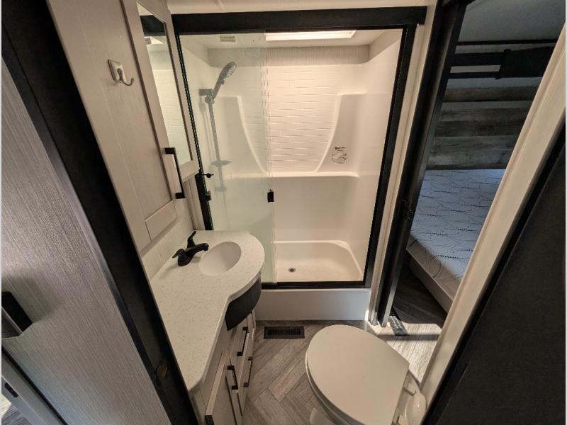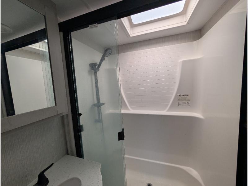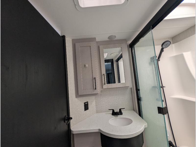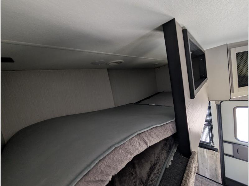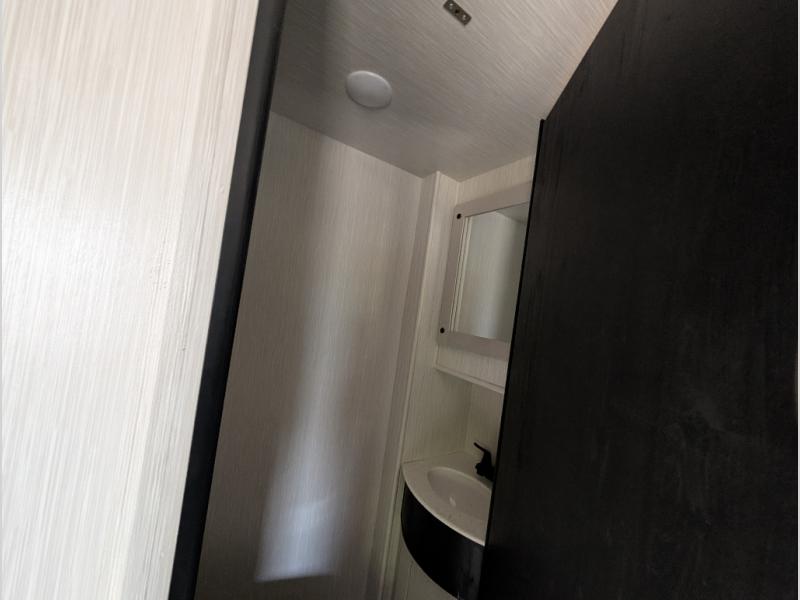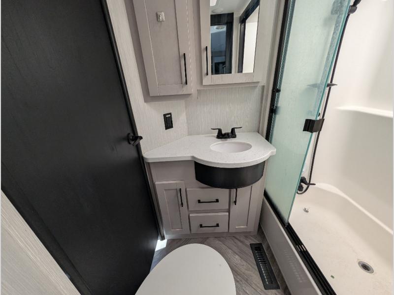 Everyone will have a comfortable place to sit in this toy hauler with the dual opposing theater seating slides and the third theater seating across from the 50" LCD HDTV! The 3,000 lb. weather resistant 8' ramp door makes it easy to load your toys into the 13' garage, and your guest can make this their bedroom at night. Here, you'll find an electric queen bed with a split bench seat/bed underneath, a half bath, plus a loft. There is even washer and dryer prep for wash day! The kitchen includes plenty of countertop space to prepare your best home cooked meals, or you can head outside to cook on the outdoor Grill N Chill three burner griddle combo!