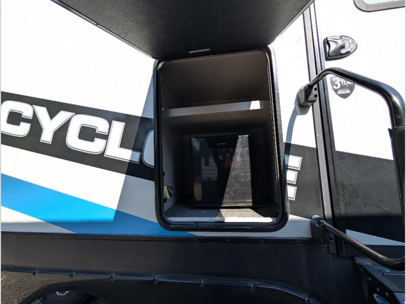 Satisfy your wanderlust with a Heartland Cyclone fifth wheel toy hauler! You won't have to sacrifice any luxury either with indulgent features like the king bedroom suite with an exclusive East to West bed tilt system with 30% more floor space, Stor-Mor three-sided access to the basement with 30% more storage capacity, and Step Caddy folding patio step for better stability as you enter or exit the patio. The industry first Grill and Go 25" residential pull out 3 burner griddle combo comes on models with an exterior kitchen for an easier cooking experience. Full height shaker cabinetry provides 25% more storage space so you can bring more camping necessities with you. If you like to dry camp longer then you will appreciate the industry's largest 150 gallons fresh water tanks. Come find the perfect model for you today!