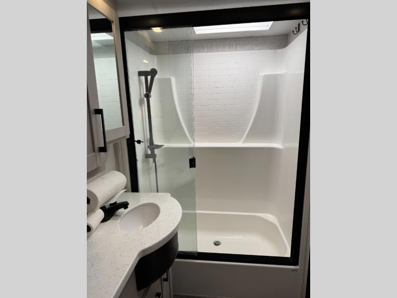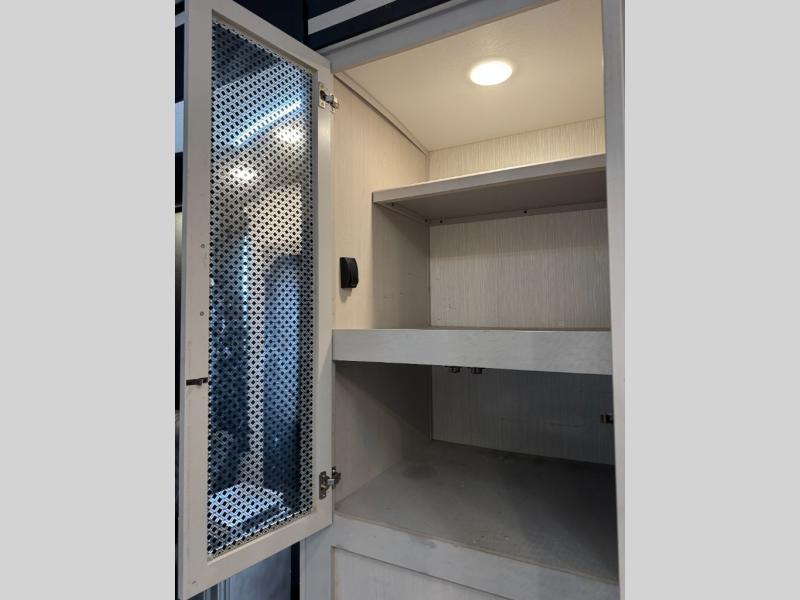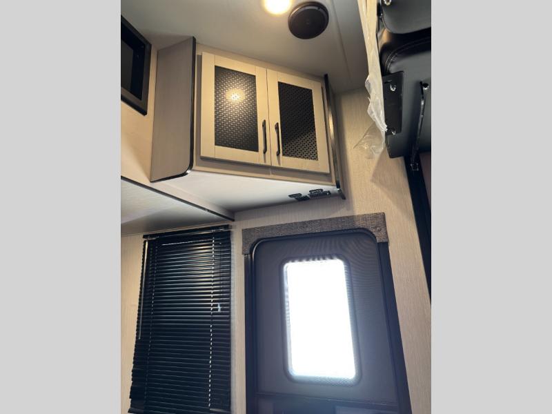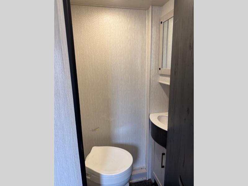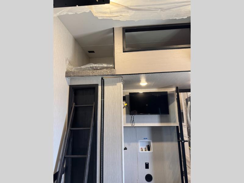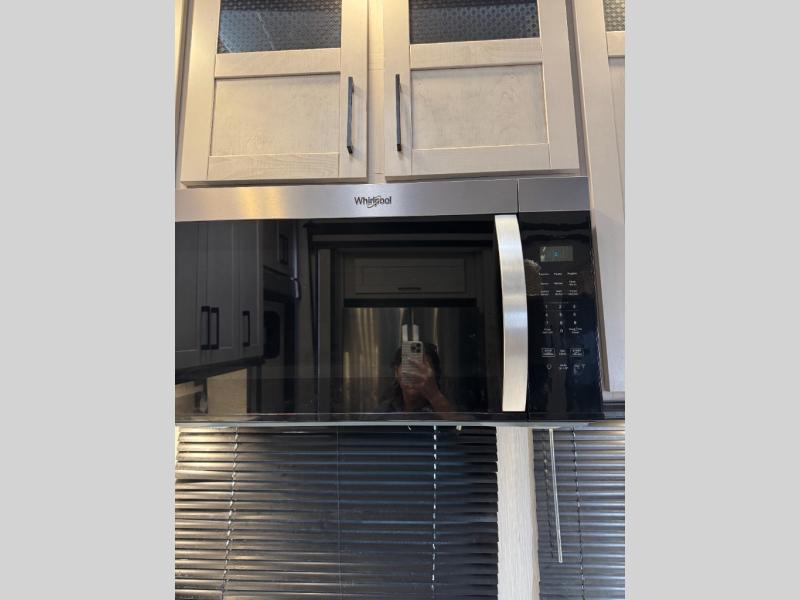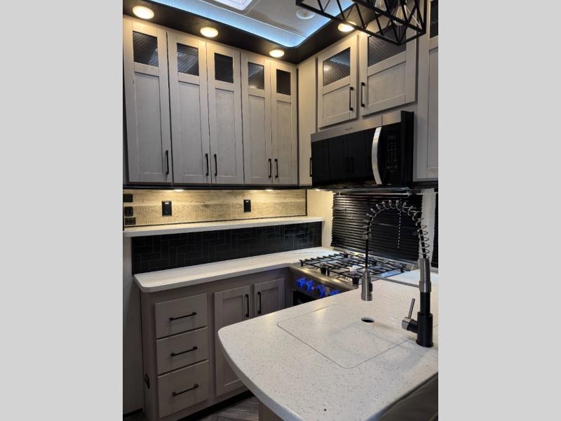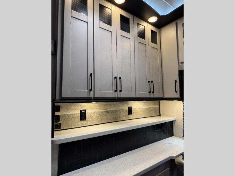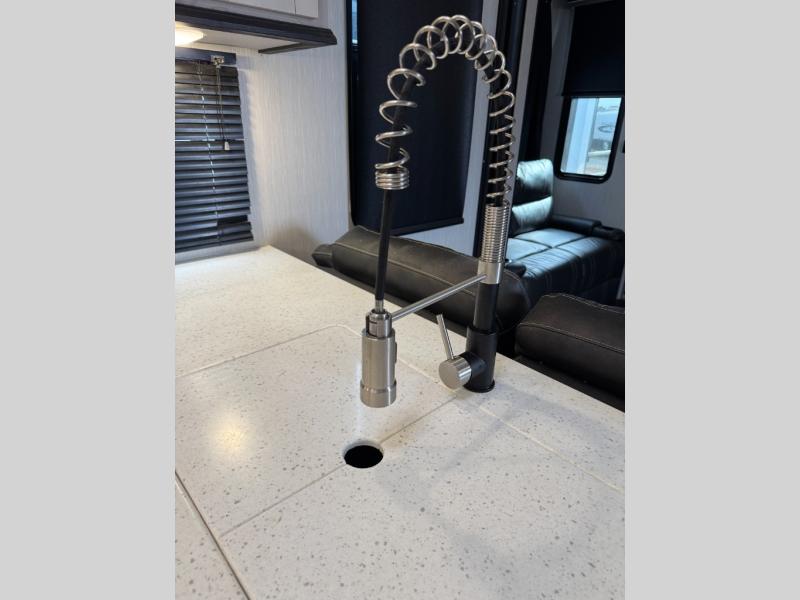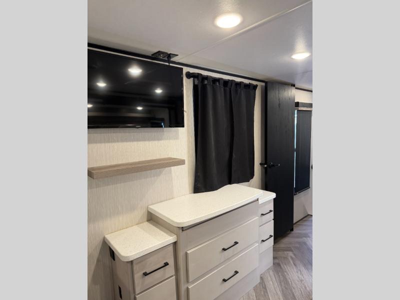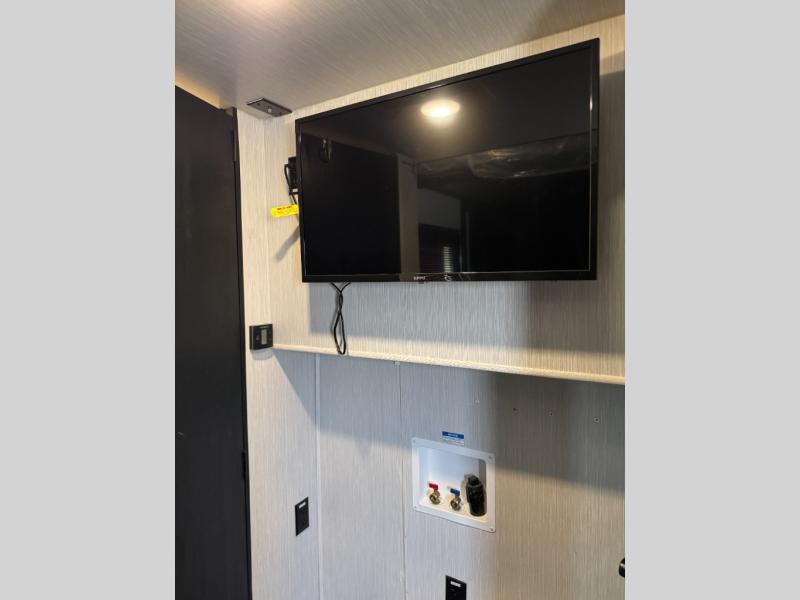 Everyone will have a comfortable place to sit in this toy hauler with the dual opposing theater seating slides and the third theater seating across from the 50" LCD HDTV! The 3,000 lb. weather resistant 8' ramp door makes it easy to load your toys into the 13' garage, and your guest can make this their bedroom at night. Here, you'll find an electric queen bed with a split bench seat/bed underneath, a half bath, plus a loft. There is even washer and dryer prep for wash day! The kitchen includes plenty of countertop space to prepare your best home cooked meals, or you can head outside to cook on the outdoor Grill N Chill three burner griddle combo!