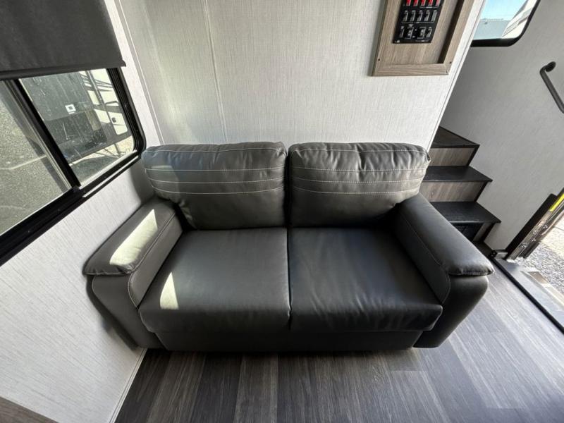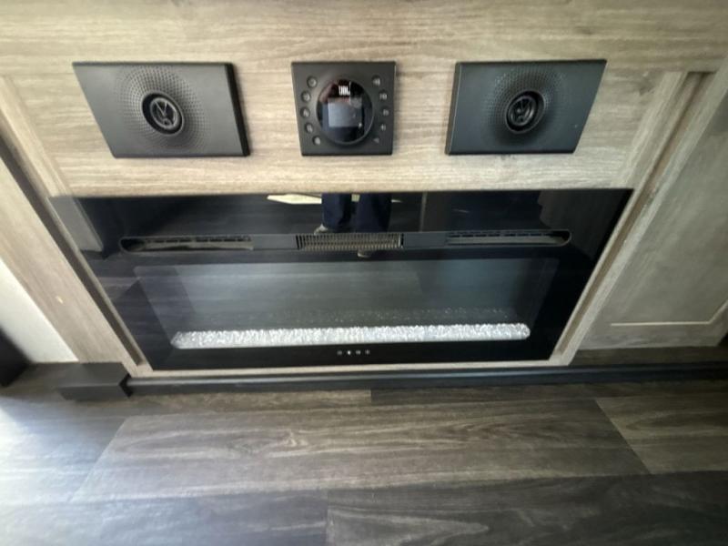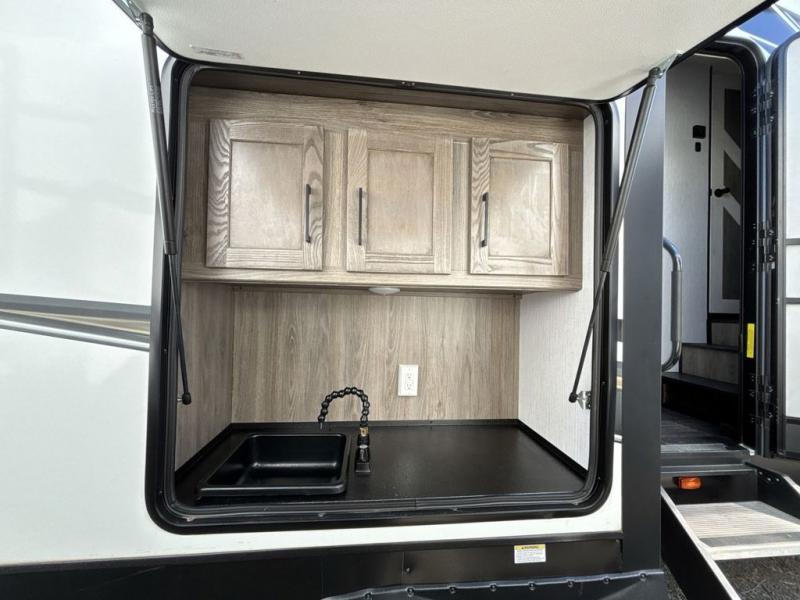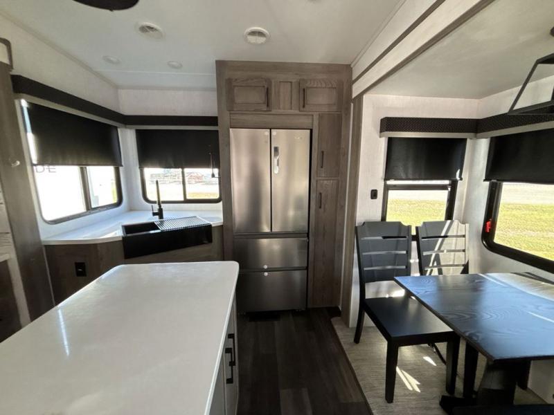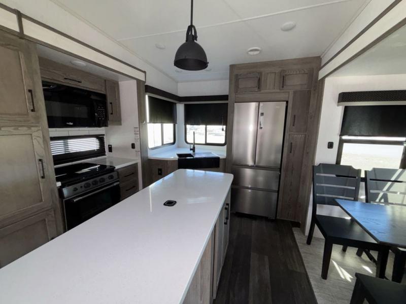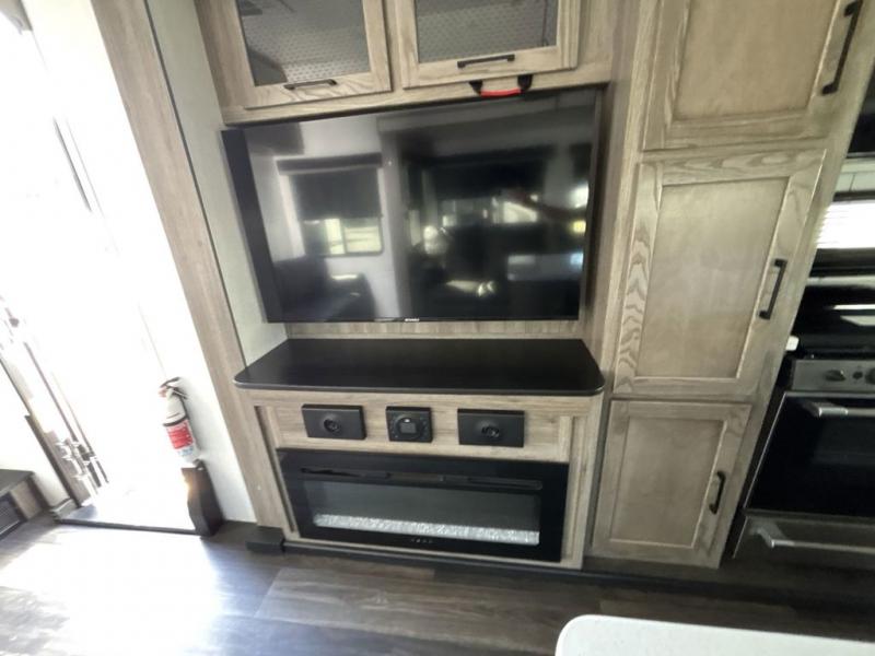 Start camping in true luxury with this fifth wheel! The chef will love cooking in the rear kitchen with a three burner cooktop, 22" stainless steel oven, residential French door 14.9 cu. ft. refrigerator, and a kitchen island. You could even prepare your delicious meals while breathing in some fresh air at the outdoor kitchen and stay protected by the 18' electric awning. Enjoy your meals at the free standing table then relax on one of the two sofas while the fire goes in the 40" electric fireplace with accent lighting. Clean up after a fun day at the beach in the full bathroom, then rest up on the king bed slide in the front private bedroom!