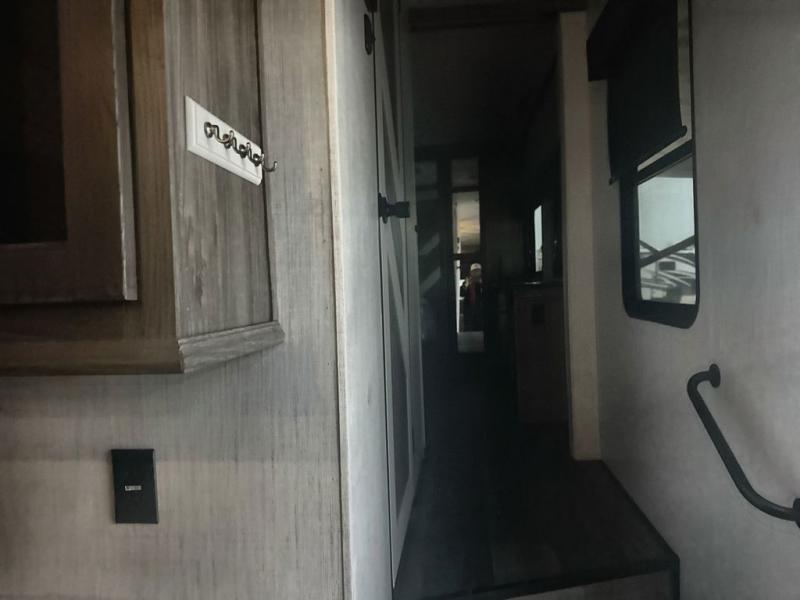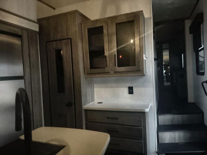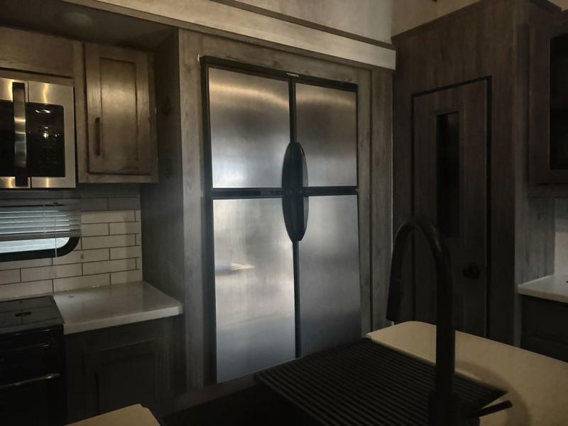 Take your best camping trip in this fifth wheel! When mother nature rains on your parade, you can relax in the rear living area on either the rear sofa or the theater seating across from the entertainment center with a 40" electric fireplace. Prepare your best home cooked meals with the three burner cooktop and 22" stainless steel oven, and the kitchen island will make your meal prepping much easier. You can play games and eat your meals at the free standing table and chairs, and store your favorite snacks in the pantry. Take a nice, hot shower in the full bathroom, then head to the front private bedroom to change into your pajamas stored in the front closet or dresser then lay down on the king bed slide. The front closet even has an area prepped to add an optional washer and dryer!
