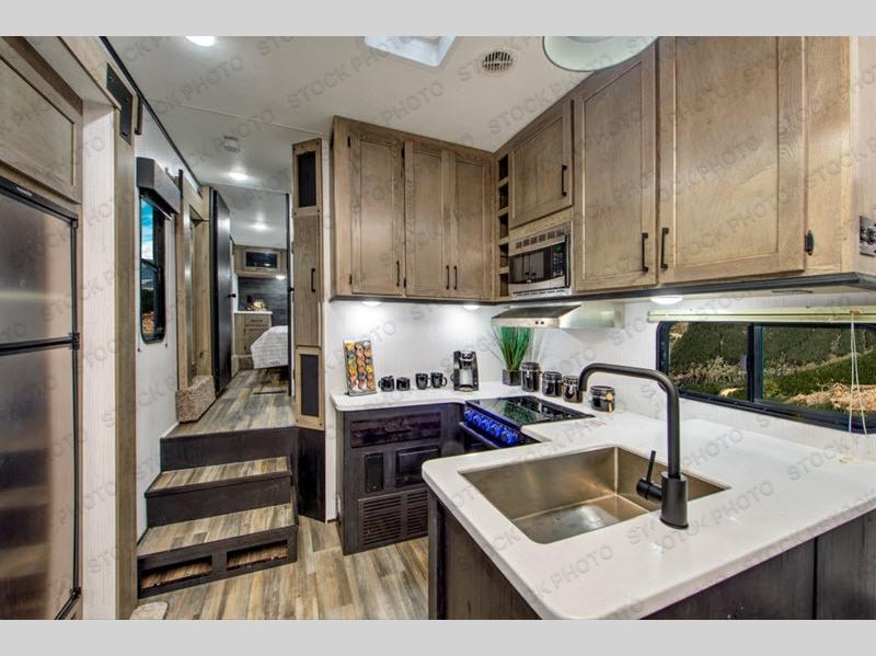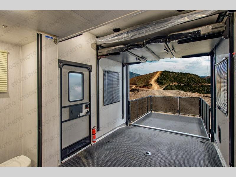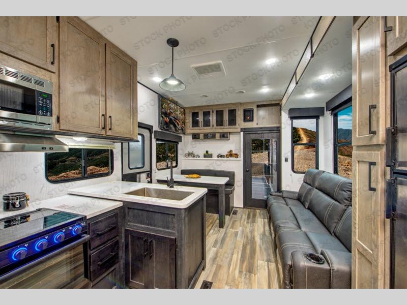 This Fuel toy hauler is going to help you get your toys to those fun vacations you have planned! You'll have plenty of space for your gear and your equipment in the 14' separate garage, and the 30-gallon fuel station will help you fuel up a golf cart or ATV whenever you're running low. The garage can also double as a guest suite since it has a power queen bunk and opposing sofas that can fold into position once the toys are removed, and there is also a loft and a half bathroom to create more convenience for this space. The second exterior entry door leads into the garage, so your guests can come and go as they please while you stay on the king-size bed up front in the master suite. The half booth dinette sits next to the kitchen, so you won't have to travel far once you have dinner ready, and the reclining sofa is also in this space.
