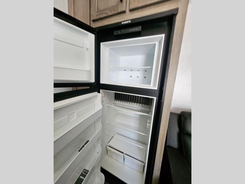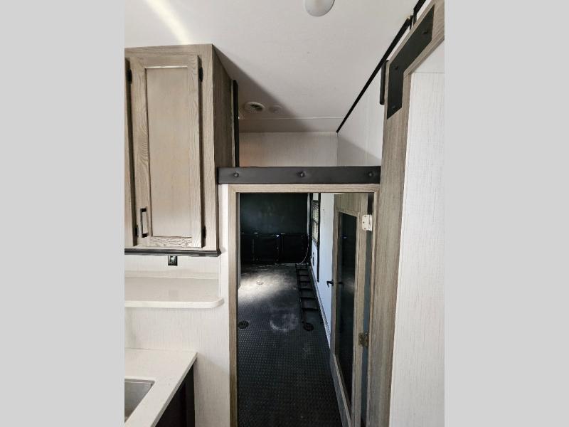 Whether you choose to bring along kayaks, dirt bikes, or a side-by-side, this toy hauler is equipped for all your adventures. Once you unload using the ramp door, you can relax on the convertible sofa while your teens climb in the loft area. The main living area is made spacious thanks to the slide out that includes reclining sofa seating with cup holders and USB ports. The chef of your group can prepare meals on the three burner cooktop, or use the microwave oven inside, and there is also an outdoor kitchen that is perfect when you want to cook and eat outdoors. There is a stainless steel refrigerator here, plus a counter with swing-out stools the all are sure to love. The dual entry bath includes a shower with a seat for convenience, and you'll love the front private bedroom with a king bed and a wardrobe slide for more space!