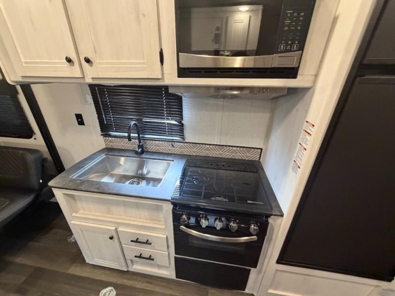Bring all your toys along for a great time in this toy hauler! With a private front king bedroom, you will enjoy privacy and the feel of home. A wardrobe and a dresser offer plenty of storage for all your things. The dual-entry bathroom is conveniently located to the bedroom and the living area. A recliner chair offers a great place to sit, and there are also the dual sofas with table for your meals. The kitchen is well-equipped with a three-burner cooktop and convection microwave. The rear ramp door allows easy access to the 13'6" garage.
