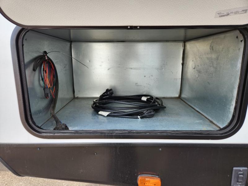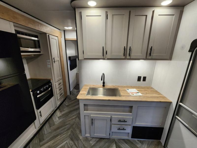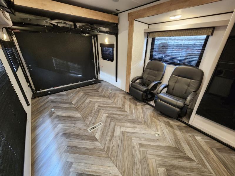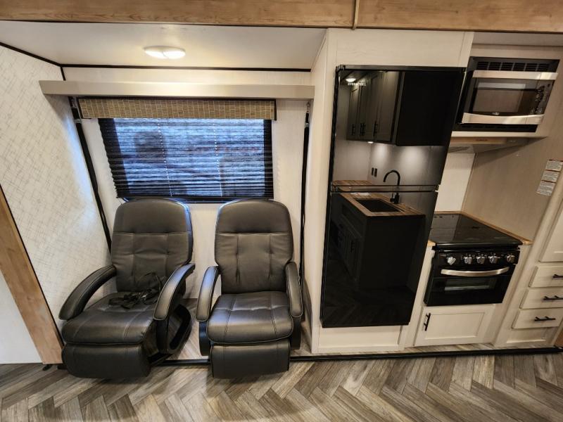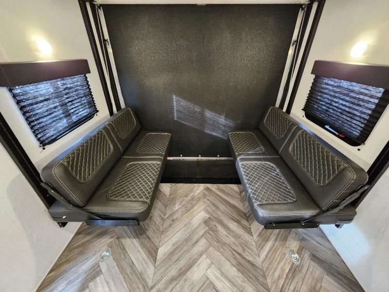 You will have a comfortable and fun camping trip with all of your toys in this toy hauler! Start each morning feeling clean and refreshed after sleeping on the walk around king bed in the front private bedroom and showering in the dual entry bathroom. Grab some eggs and bacon from the 10 cu. ft. refrigerator and fry them up on the three burner cooktop, and clean up will be a breeze with the double stainless steel sink that has plenty of countertop space next to it for prepping your other meals. The flip-up sofas with table provide a comfortable place to enjoy your meals, play games, and even sleep. There is also another sofa next to the refrigerator for another guest to tag along!