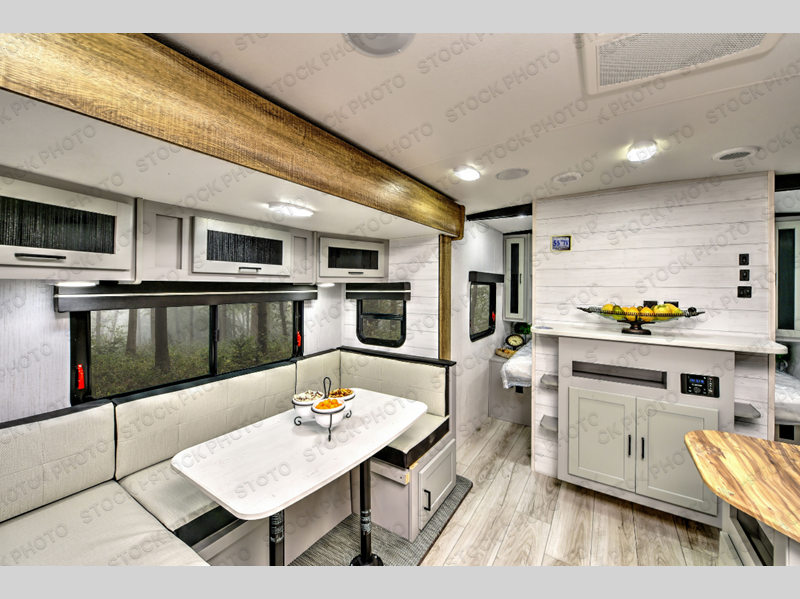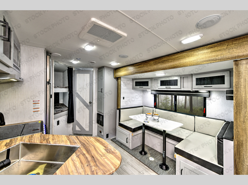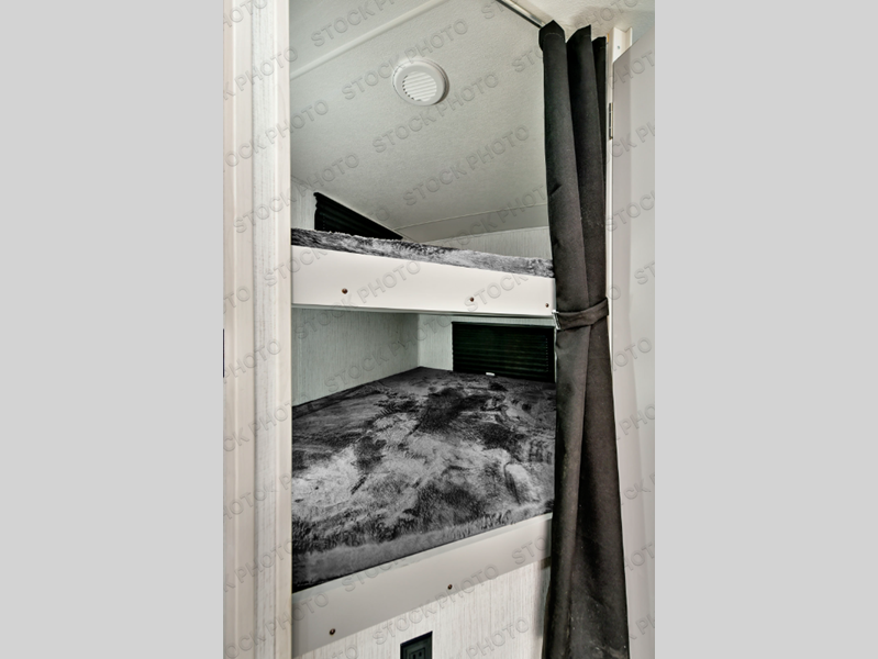 Double-size bunks make this travel trailer family and friends approved! The slide out will provide more space to stretch out in the main living area, and the full bath will come in handy when cleaning up each day. This model includes a front private bedroom with a king bed, plus dual nightstands for your belongings. Everyone can gather under the 19' power awning with LED lights while the chef of the group prepares dinner on the exterior kitchen!