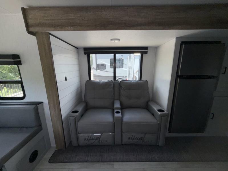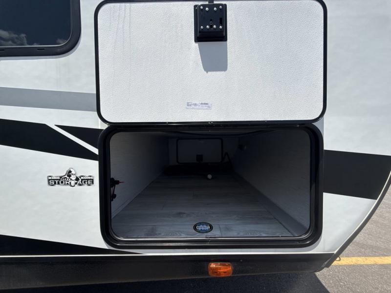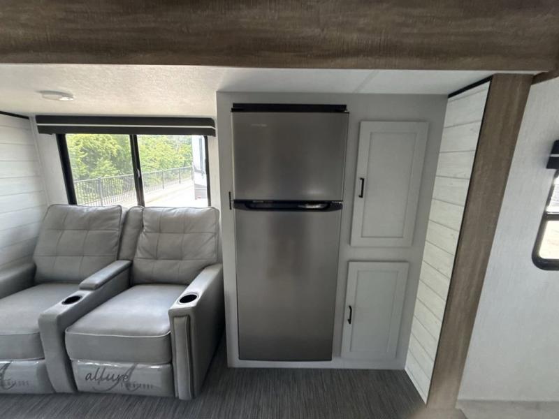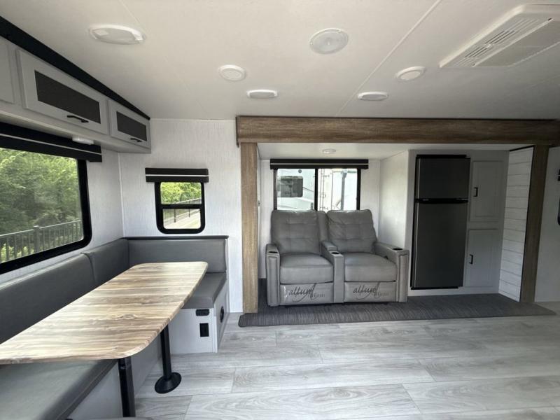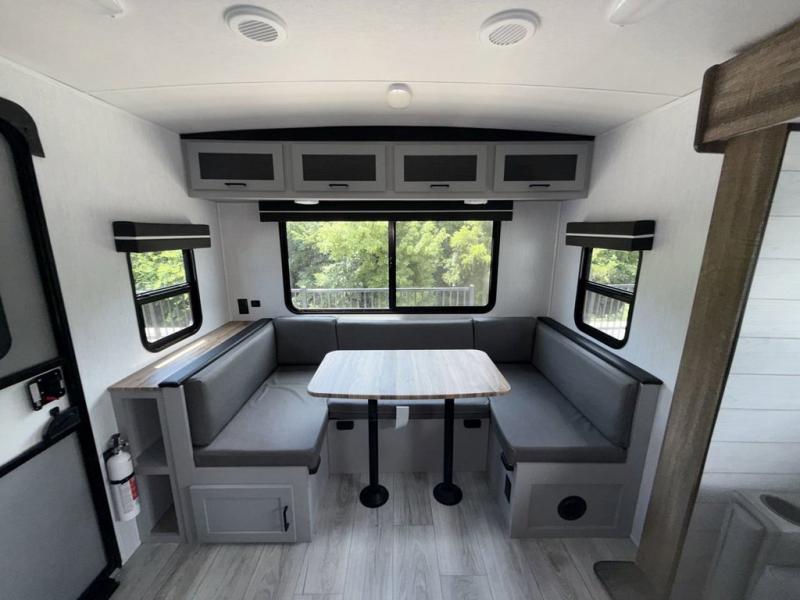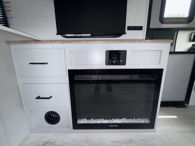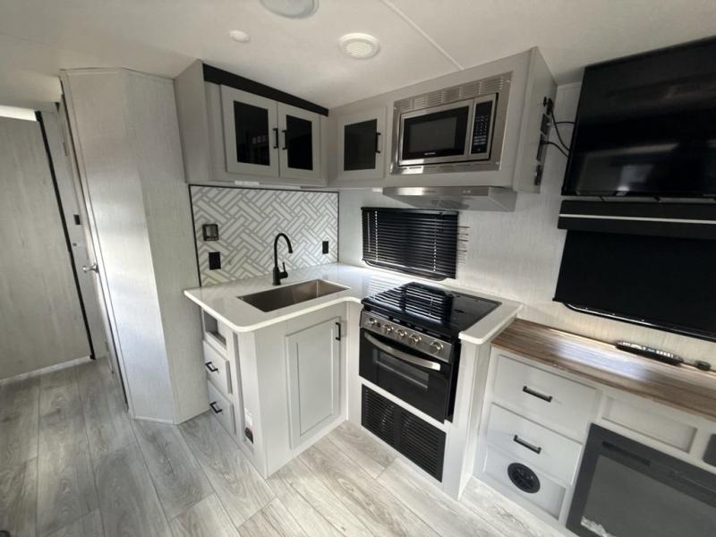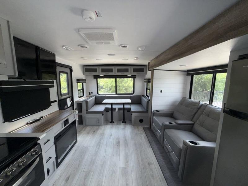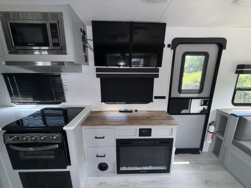 You and your spouse will love camping in this travel trailer! It features a front private bedroom with a king bed to lay your head on at night. Freshen up each morning in the full bathroom with a shower that has a skylight above to bring the outdoors inside. The chef can prepare their best home cooked meals with the four burner cooktop, conventional oven, and 10.7 cu. ft. refrigerator. Enjoy all of your meals and play games at the rear U-shaped dinette, plus it can transform into an extra sleeping space for an extra guest or two depending on their size. With theater seating and an entertainment center with a fireplace, you can have a truly relaxing evening indoors!