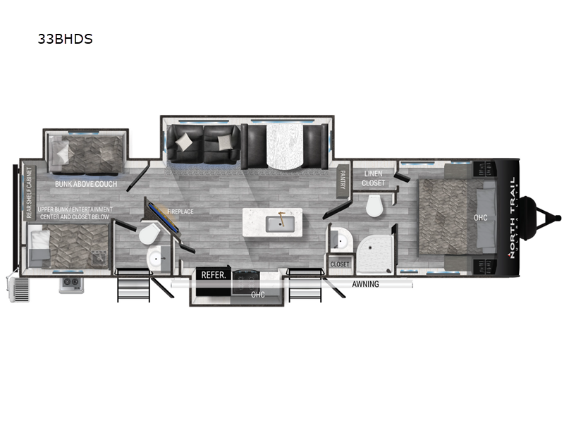 When you choose a North Trail travel trailer by Heartland you are choosing comfort, convenience, and quality craftsmanship at its best. The block foam brick insulation, enclosed and heated underbelly, plus Weather Guard thermal protection mean you can camp all year around. Each model features a Wide Trax suspension for a smooth ride, and the backup camera prep and solar prep make camping that much easier if you choose those options. Some of the other exterior features you will appreciate are the outside shower, the power stabilizer jacks and power tongue jack, and the outside speakers to keep the party going. Head inside to find stainless steel appliances, oversized windows, and premium flooring that is tear, slip, mold, mildew and cold crack resistant! You can't beat a North Trail travel trailer. Choose your favorite floorplan today!