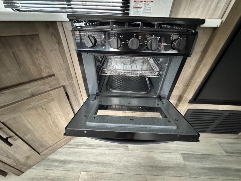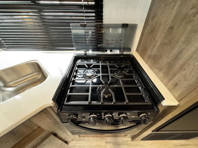Kitchen: Fully equipped with a stainless-steel sink, 3-burner stove, oven, microwave, and a 12V dual-door refrigerator.