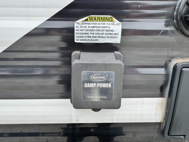 Exterior Features: LED-lit power awning, outside shower, TV hookup, radial tires, and diamond plate stone guard.