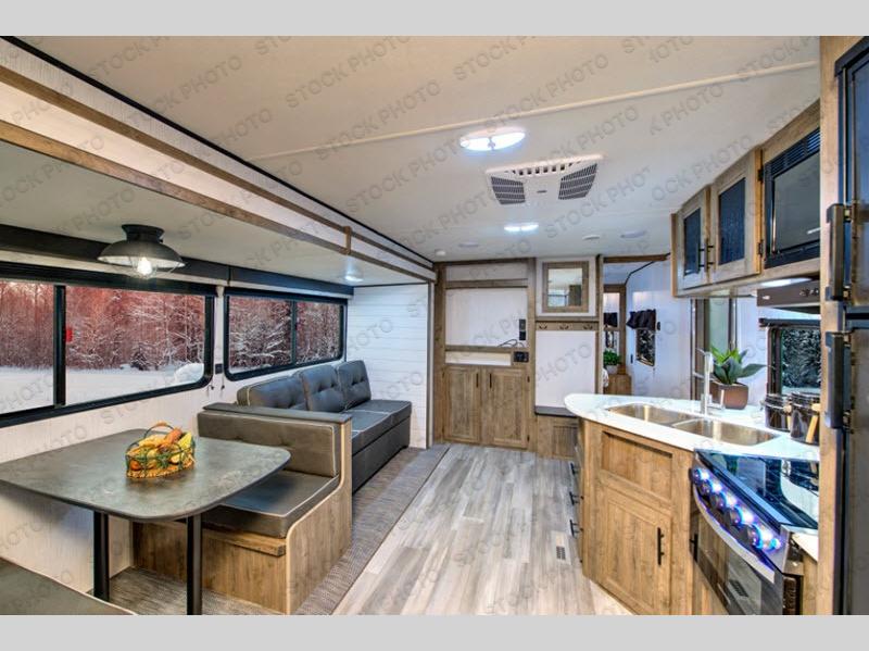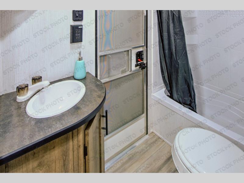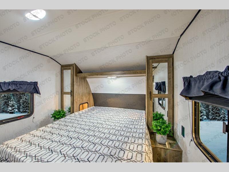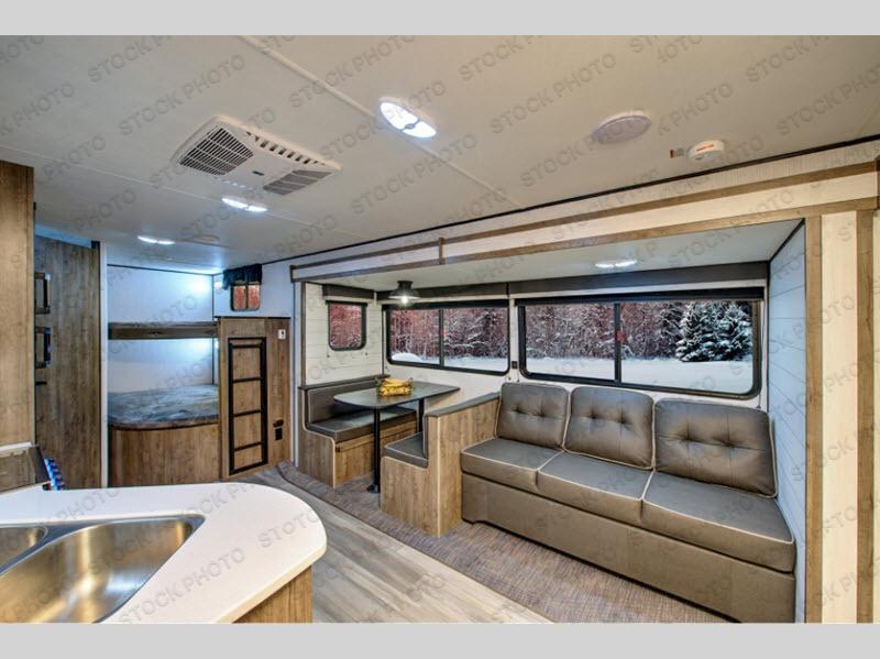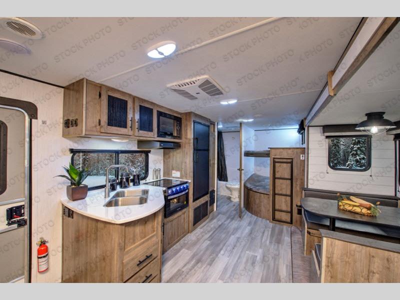 The kids are ready, are you? They are excited about hanging out on the double-size bunks with a ladder after hiking and exploring around the campgrounds. A feature you are sure to like is the exterior entry door into the full bathroom which allows you to easily access the bathroom from outside when relaxing under the power awning. The main living and kitchen area offers a slide out which includes a booth dinette and sofa and provides more floor space in this area and the kitchen. The cook will have full amenities including a three-burner cooktop and microwave oven, plus an 8 cu. ft. double door refrigerator. And when you need privacy, open up the sliding door into the front bedroom and take a nap on the queen bed.