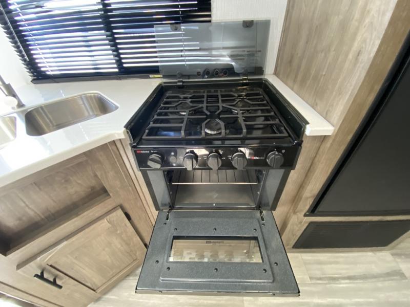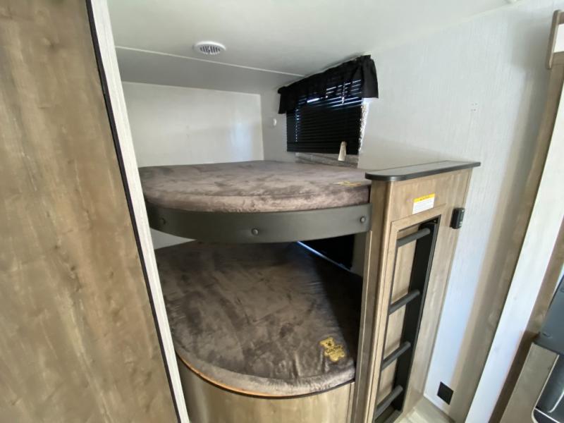 The kids are ready, are you? They are excited about hanging out on the double-size bunks with a ladder after hiking and exploring around the campgrounds. A feature you are sure to like is the exterior entry door into the full bathroom which allows you to easily access the bathroom from outside when relaxing under the power awning. The main living and kitchen area offers a slide out which includes a booth dinette and sofa and provides more floor space in this area and the kitchen. The cook will have full amenities including a three-burner cooktop and microwave oven, plus an 8 cu. ft. double door refrigerator. And when you need privacy, open up the sliding door into the front bedroom and take a nap on the queen bed.