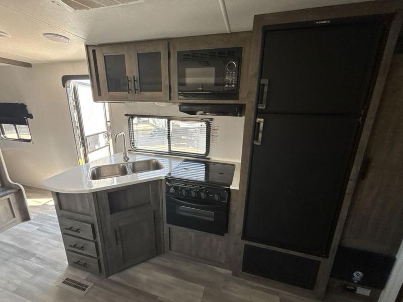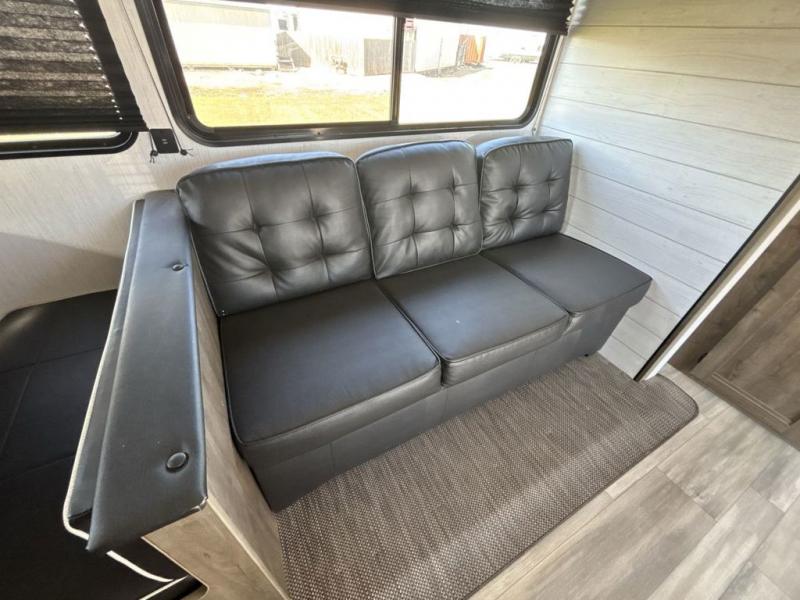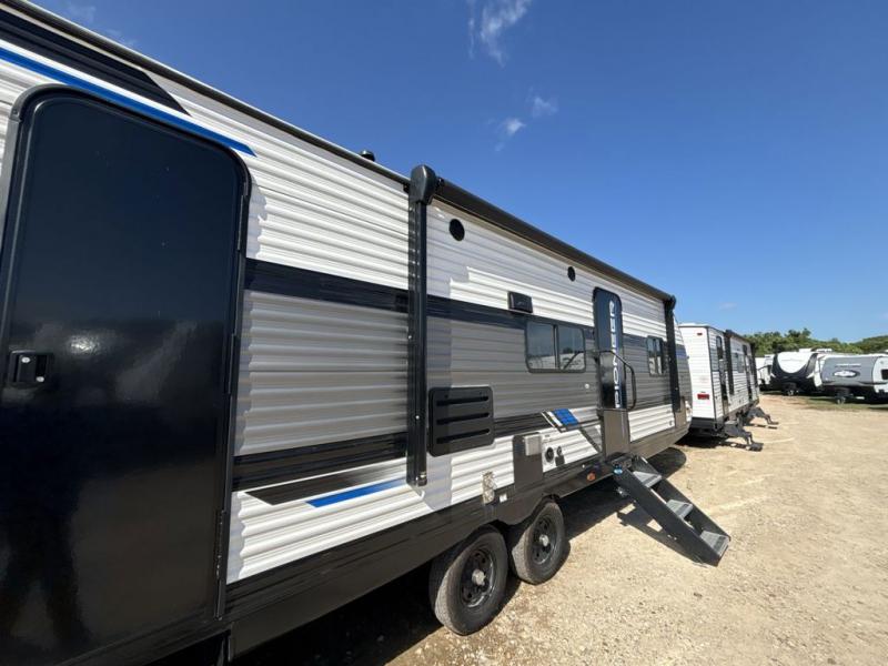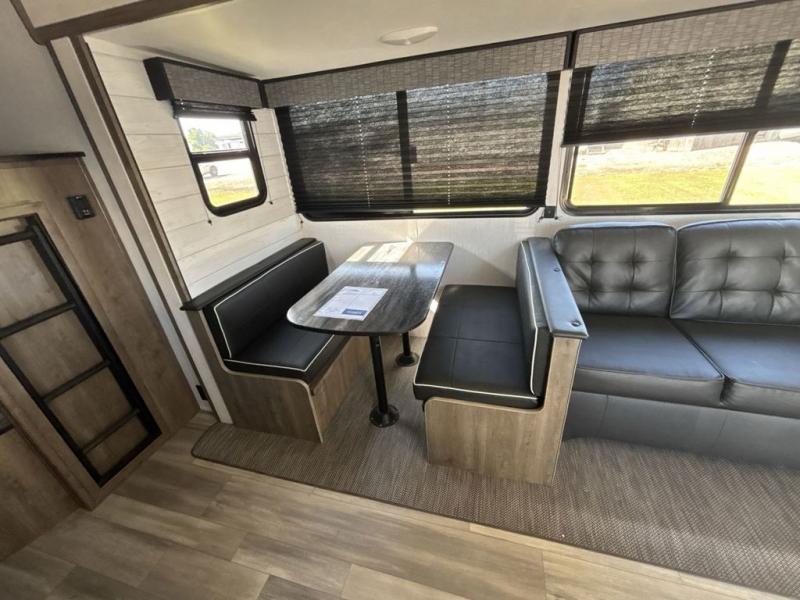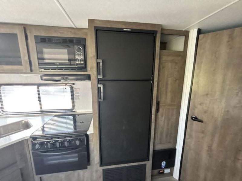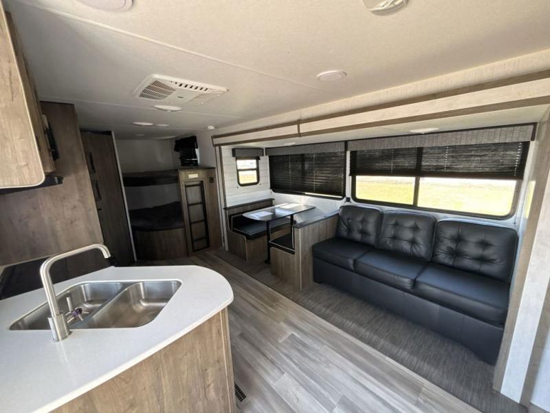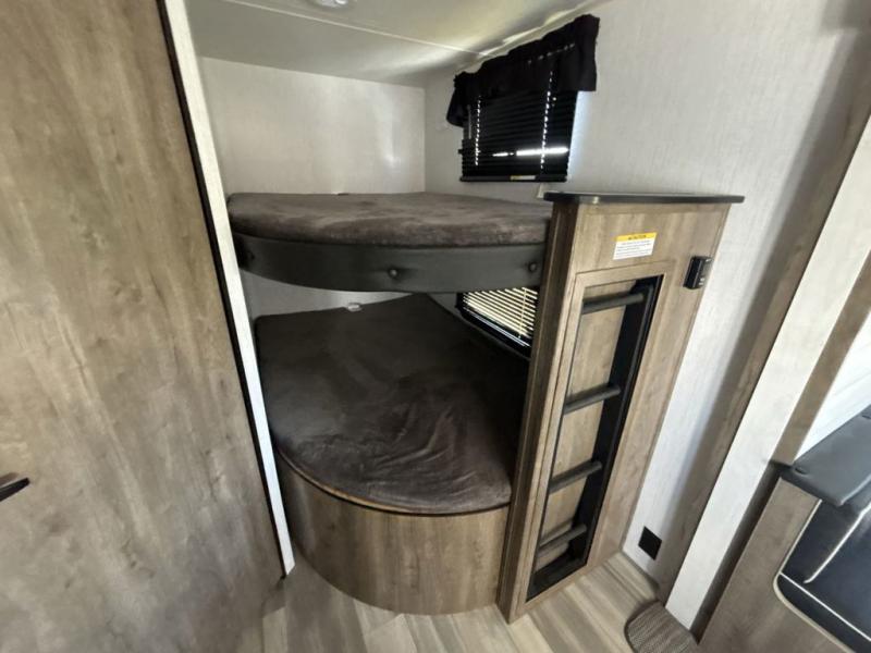 The kids are ready, are you? They are excited about hanging out on the double-size bunks with a ladder after hiking and exploring around the campgrounds. A feature you are sure to like is the exterior entry door into the full bathroom which allows you to easily access the bathroom from outside when relaxing under the power awning. The main living and kitchen area offers a slide out which includes a booth dinette and sofa and provides more floor space in this area and the kitchen. The cook will have full amenities including a three-burner cooktop and microwave oven, plus an 8 cu. ft. double door refrigerator. And when you need privacy, open up the sliding door into the front bedroom and take a nap on the queen bed.