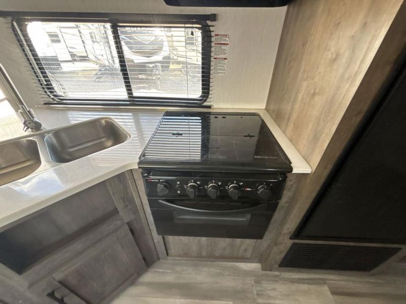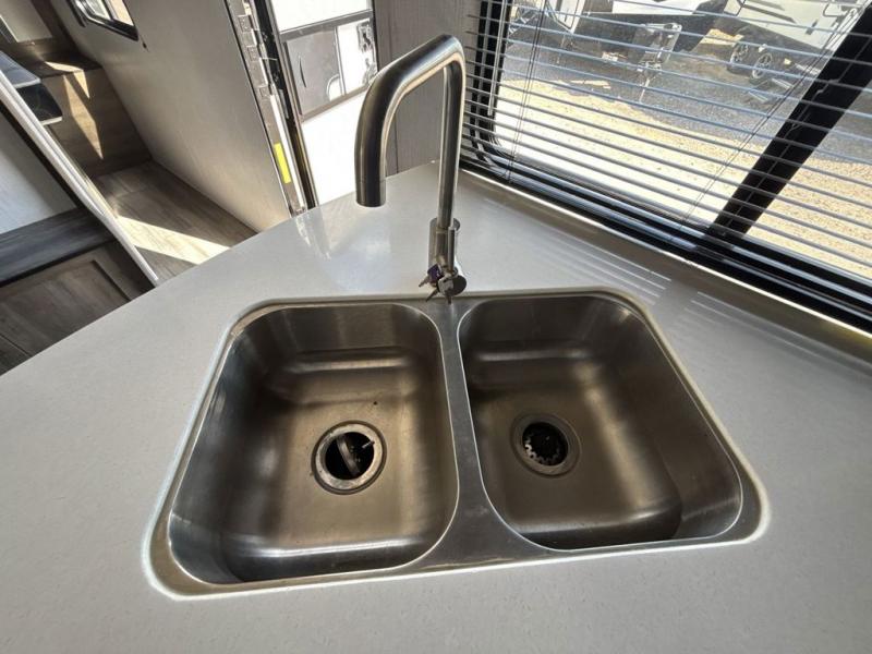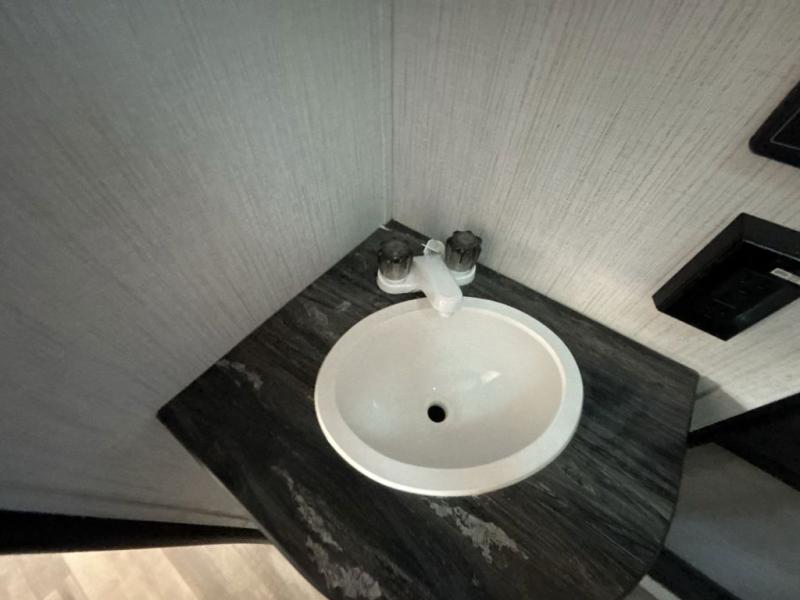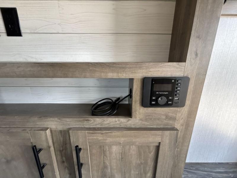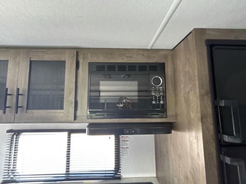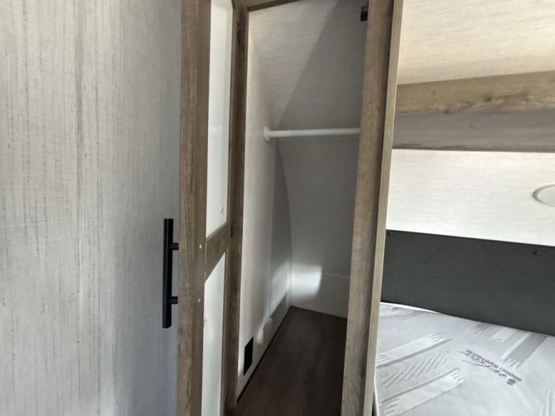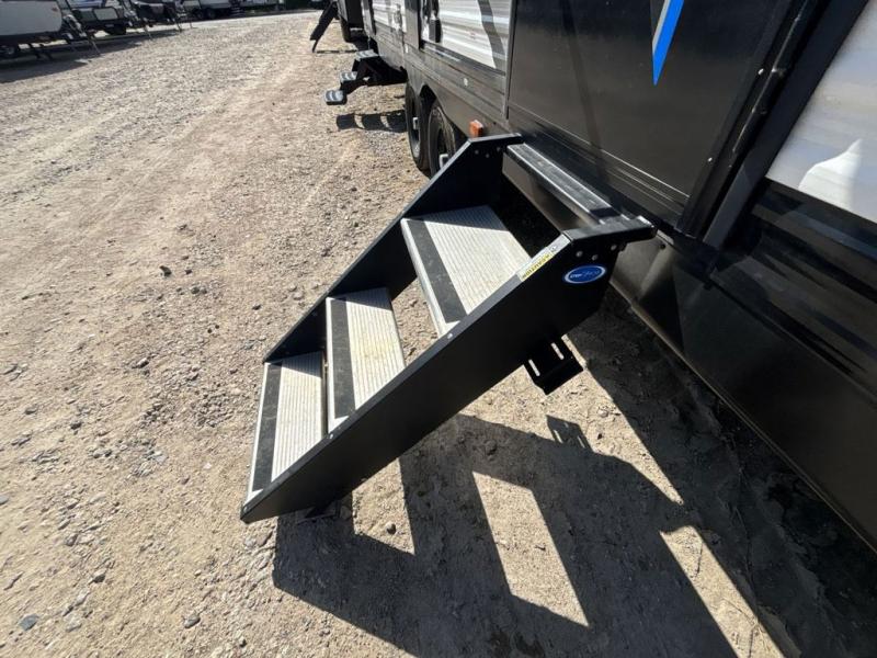The kids are ready, are you? They are excited about hanging out on the double-size bunks with a ladder after hiking and exploring around the campgrounds. A feature you are sure to like is the exterior entry door into the full bathroom which allows you to easily access the bathroom from outside when relaxing under the power awning. The main living and kitchen area offers a slide out which includes a booth dinette and sofa and provides more floor space in this area and the kitchen. The cook will have full amenities including a three-burner cooktop and microwave oven, plus an 8 cu. ft. double door refrigerator. And when you need privacy, open up the sliding door into the front bedroom and take a nap on the queen bed.