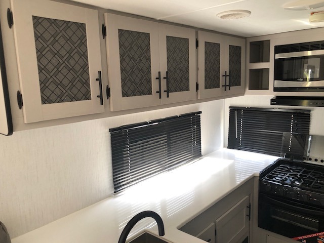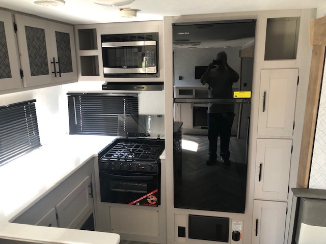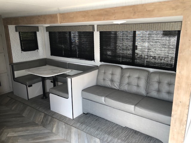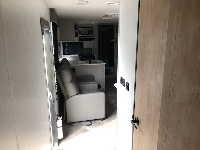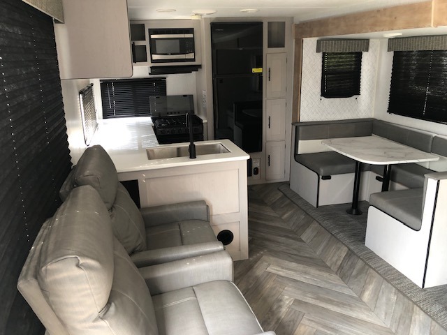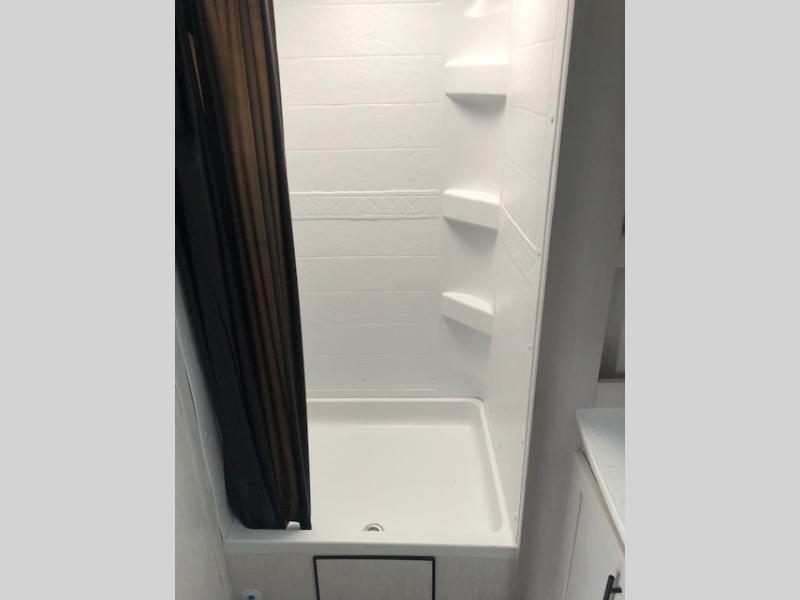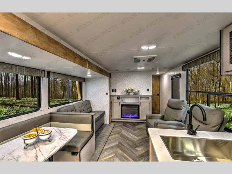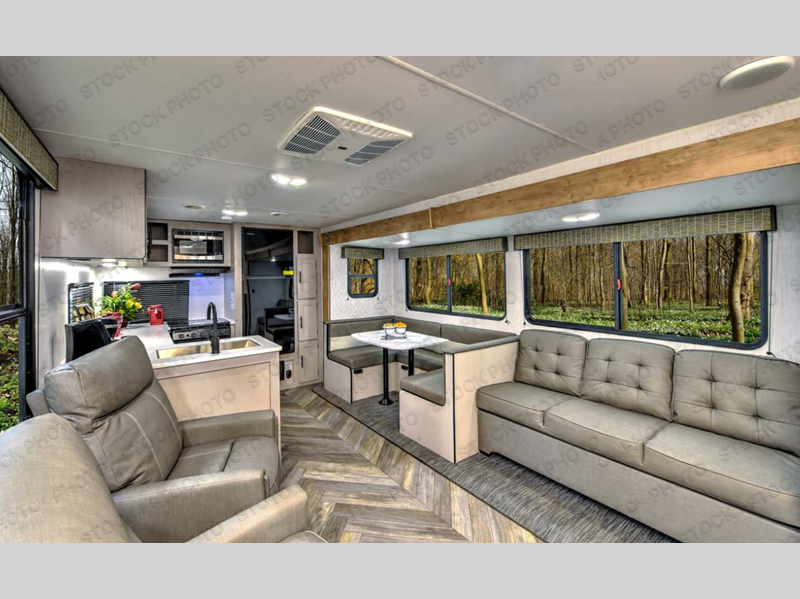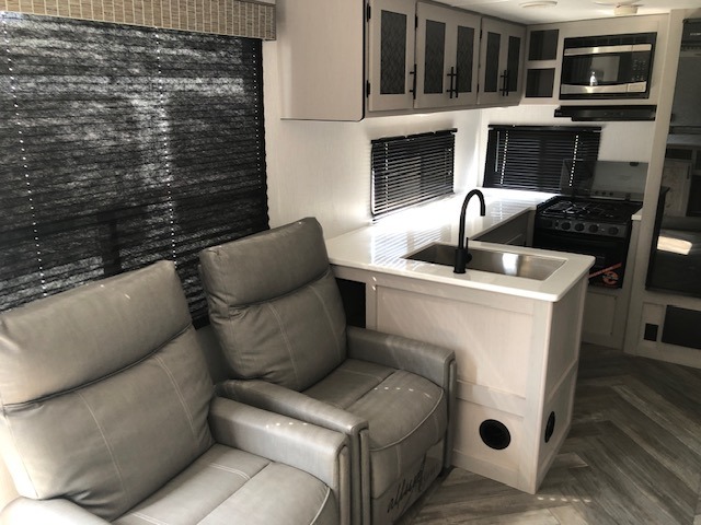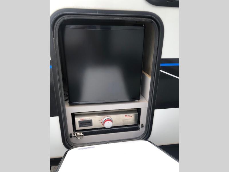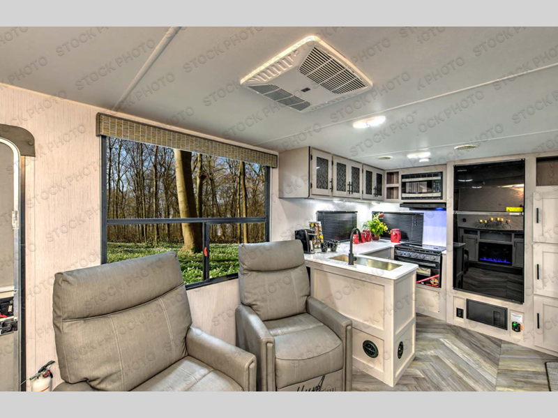 You will feel right at home with this travel trailer! The rear kitchen has plenty of countertop space to prepare your best home cooked meals. The U-shaped dinette is not only great for enjoying meals and playing games, but also for transforming into an extra sleeping space. Relax in true comfort each night on one of the two recliners or sofa by the TV prepped area. Freshen up after a fun filled day with the shower, and then head to the front private bedroom and get a good night's rest on the queen bed. You can even cook in the great outdoors with the outside kitchen that comes with a griddle and refrigerator to enjoy a cold beverage while you flip burgers!