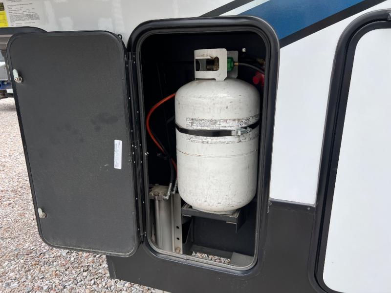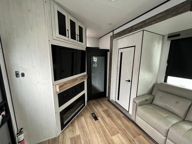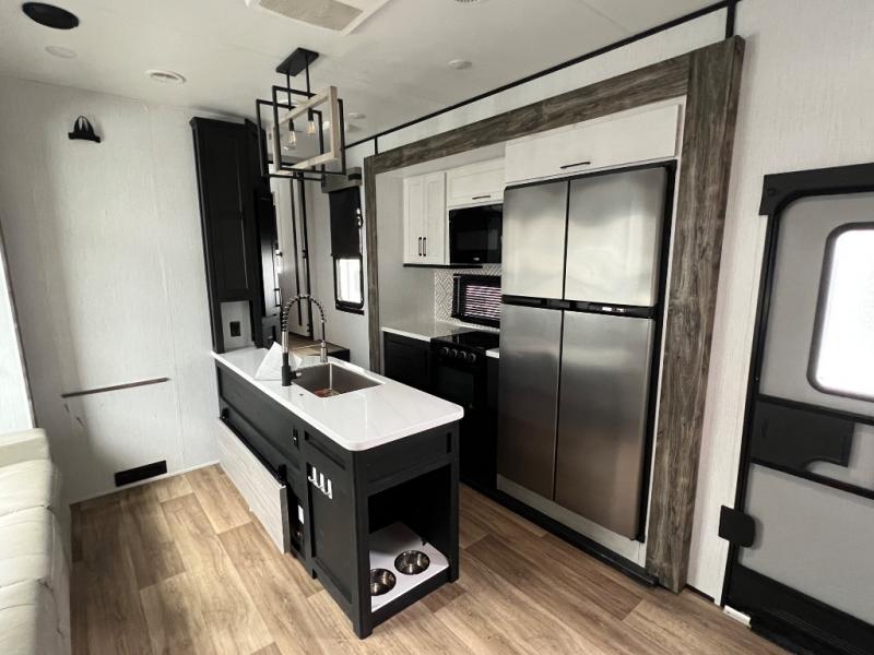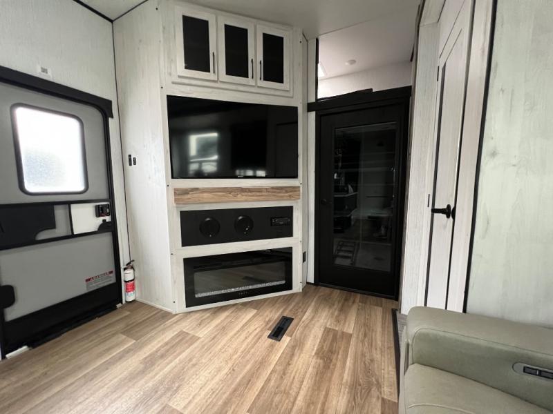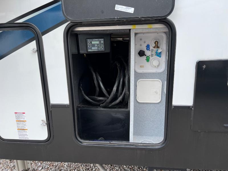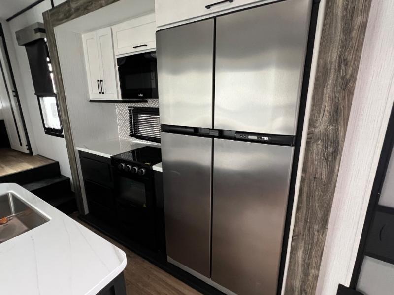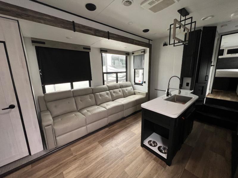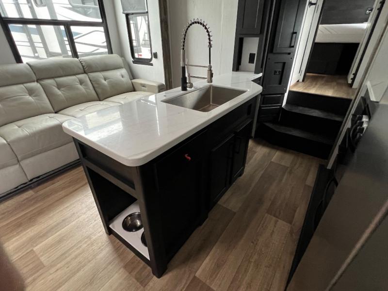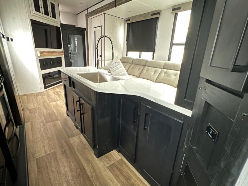 It's time to seek adventure and stay in luxury in this fifth wheel that allows you to bring along your toys be it mountain bikes, motorcycles and/or an ATV! After easily loading up the ramp door into 13'8" of garage space, you can head out. You will appreciate having dual entry for easy access to your toys and the main living and kitchen area, plus having a half bath in the garage is super convenient. You might even like to add the electric queen bed-split bench seat/bed option for more dining and sleeping space. Relax inside the main area on the large sofa and dine at the drop down dinette with flip-up bench. The cook will have full kitchen amenities to make meals, plus a peninsula counter with as sink to prepare and serve meals. The full bathroom has double access, and the front bedroom offers a king bed, plus a slide out with a wardrobe and dresser for more floor space and storage. And the 30 gallon fuel station with a second 30 gallon aux tank will keep the fun going!