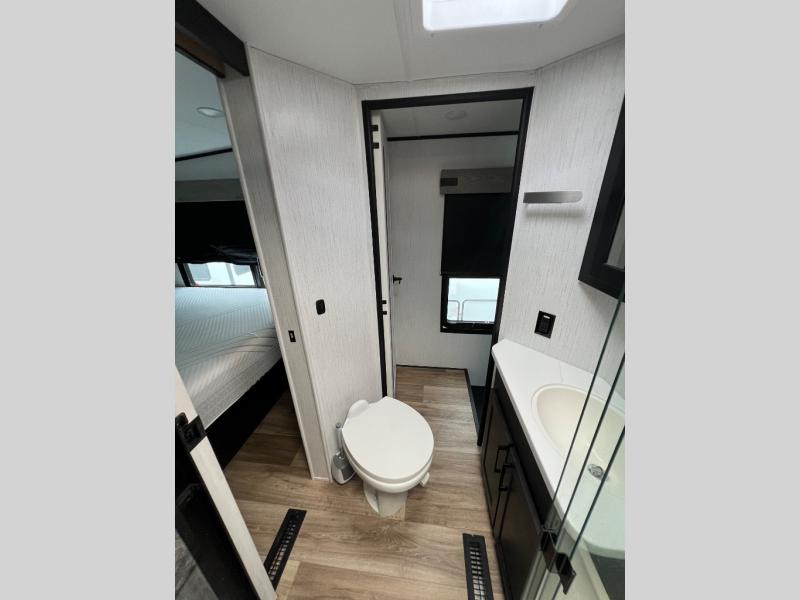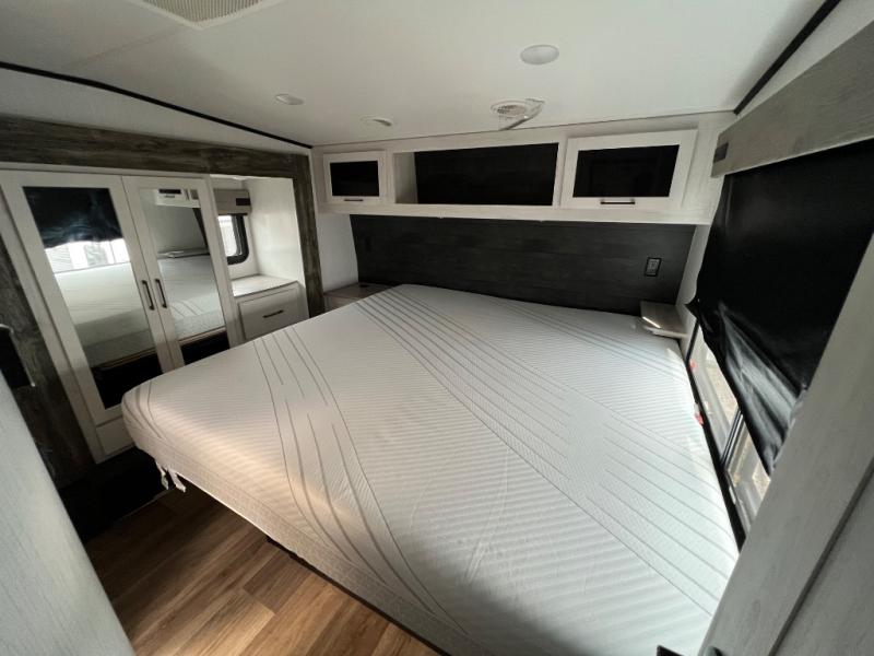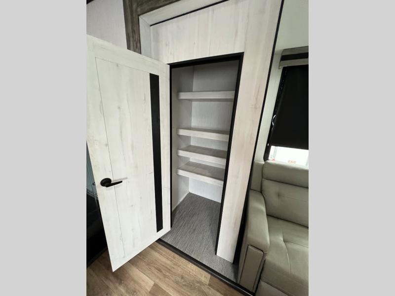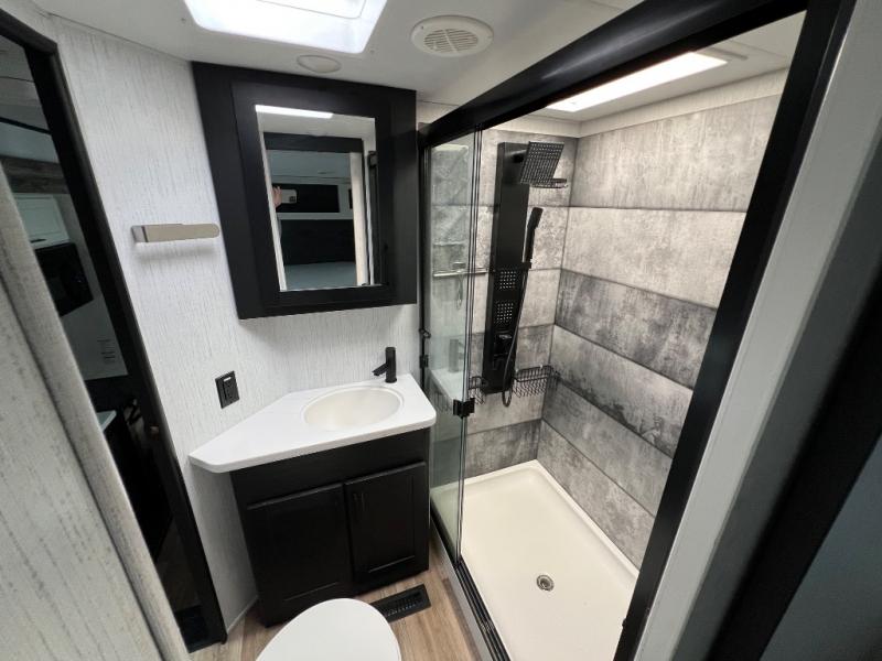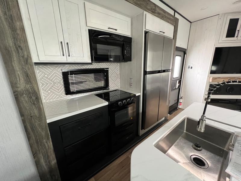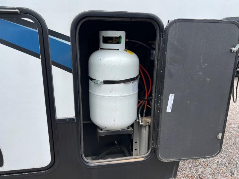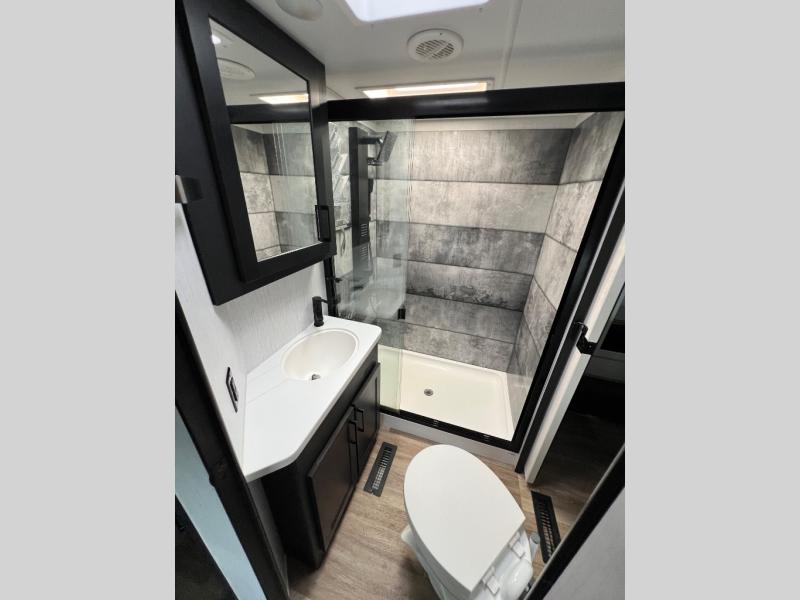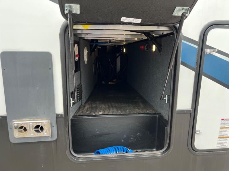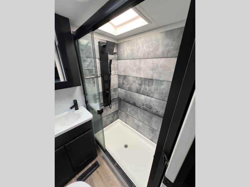 It's time to seek adventure and stay in luxury in this fifth wheel that allows you to bring along your toys be it mountain bikes, motorcycles and/or an ATV! After easily loading up the ramp door into 13'8" of garage space, you can head out. You will appreciate having dual entry for easy access to your toys and the main living and kitchen area, plus having a half bath in the garage is super convenient. You might even like to add the electric queen bed-split bench seat/bed option for more dining and sleeping space. Relax inside the main area on the large sofa and dine at the drop down dinette with flip-up bench. The cook will have full kitchen amenities to make meals, plus a peninsula counter with as sink to prepare and serve meals. The full bathroom has double access, and the front bedroom offers a king bed, plus a slide out with a wardrobe and dresser for more floor space and storage. And the 30 gallon fuel station with a second 30 gallon aux tank will keep the fun going!