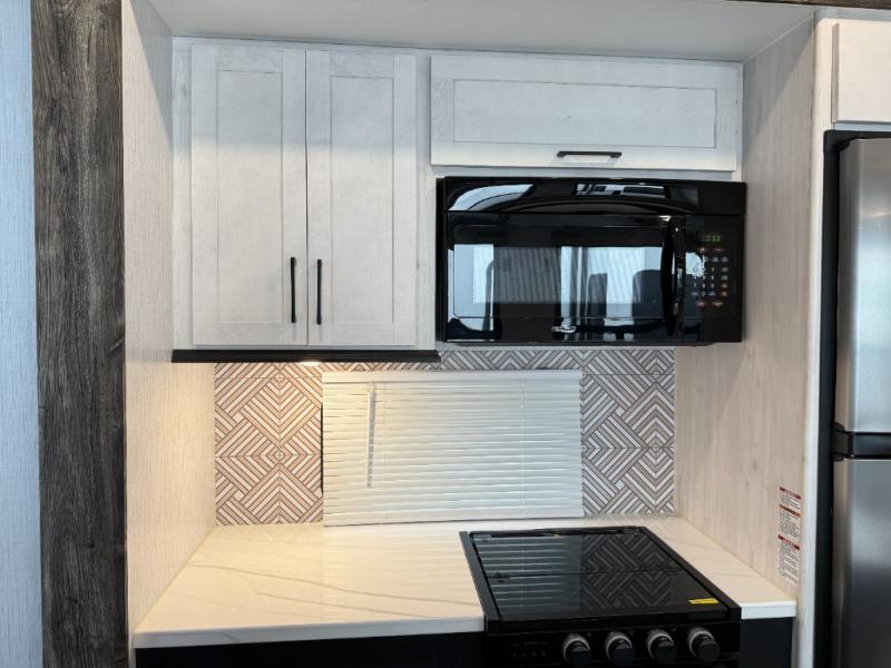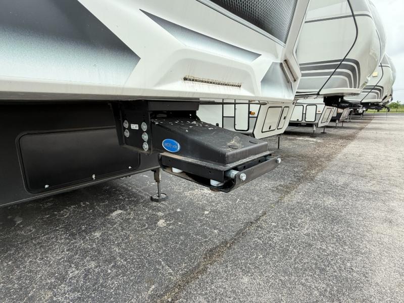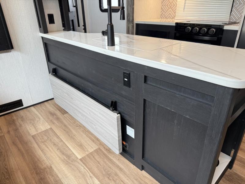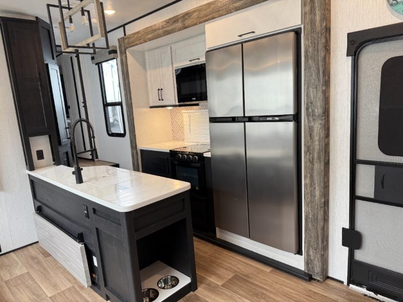 It's time to seek adventure and stay in luxury in this fifth wheel that allows you to bring along your toys be it mountain bikes, motorcycles and/or an ATV! After easily loading up the ramp door into 13'8" of garage space, you can head out. You will appreciate having dual entry for easy access to your toys and the main living and kitchen area, plus having a half bath in the garage is super convenient. You might even like to add the electric queen bed-split bench seat/bed option for more dining and sleeping space. Relax inside the main area on the large sofa and dine at the drop down dinette with flip-up bench. The cook will have full kitchen amenities to make meals, plus a peninsula counter with as sink to prepare and serve meals. The full bathroom has double access, and the front bedroom offers a king bed, plus a slide out with a wardrobe and dresser for more floor space and storage. And the 30 gallon fuel station with a second 30 gallon aux tank will keep the fun going!
