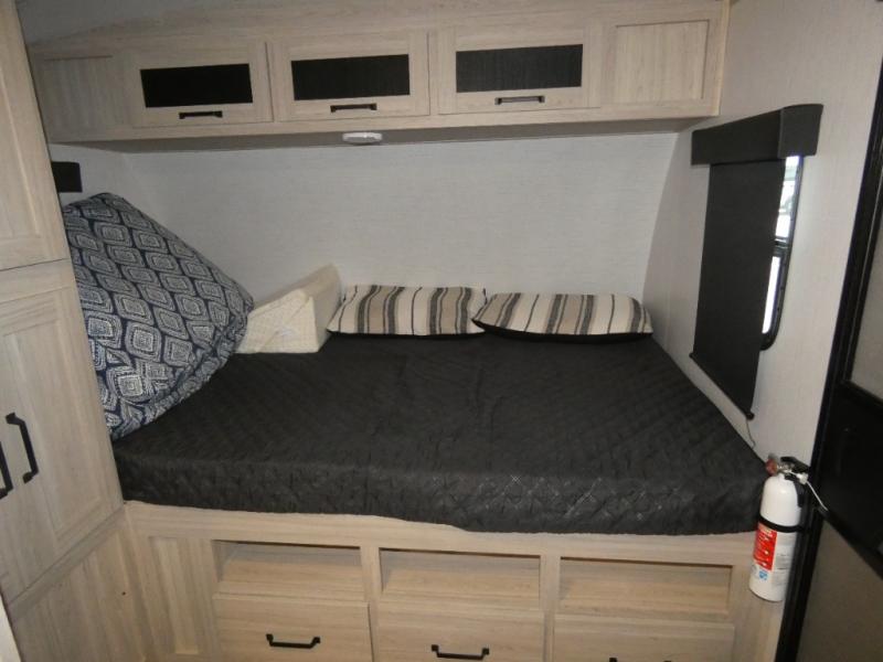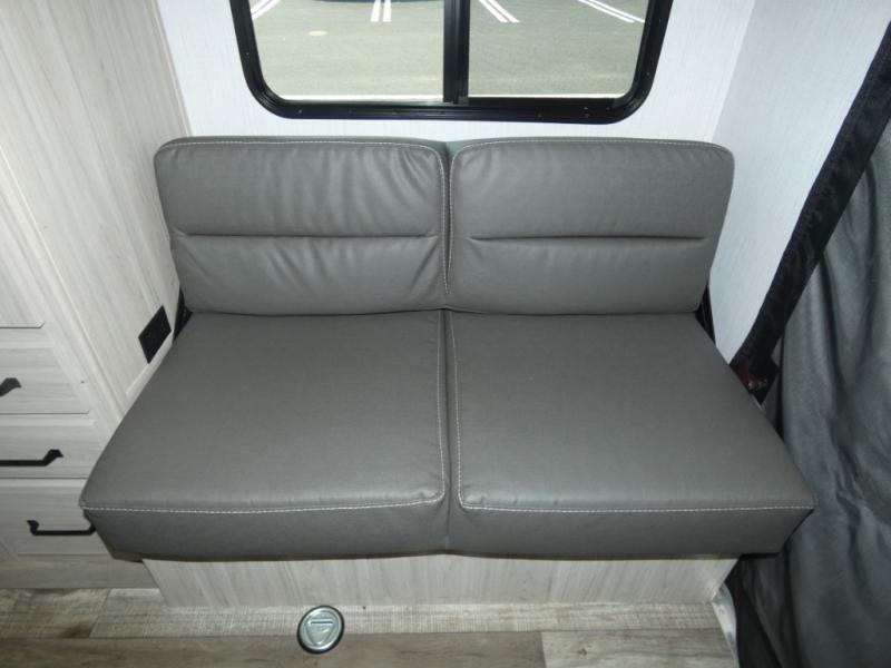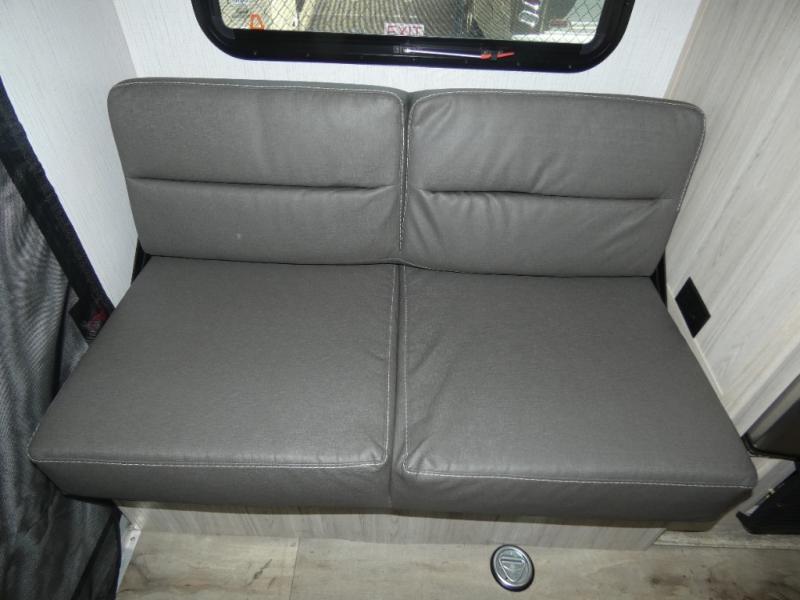 Weekends at the lake just got sweeter with this travel trailer in tow! You will love the flip-up back hatch baggage door that opens fully so you can easily load luggage, bikes, and kayaks. The free-standing dinette table provides more space for these items, and if you have guests they can sleep on the dinette seats once they're folded down. This model includes a two burner range in the kitchen, along with a 12V residential refrigerator, plus a slide out TV that rotates all the way around for better viewing. When you're ready to settle down for the night, the full bath will allow you to clean up, and the queen bed up front is sure to bring a great night's rest. There is even a bedroom closet to keep your clothes tidy!