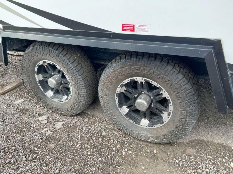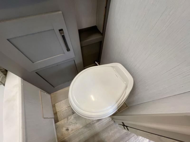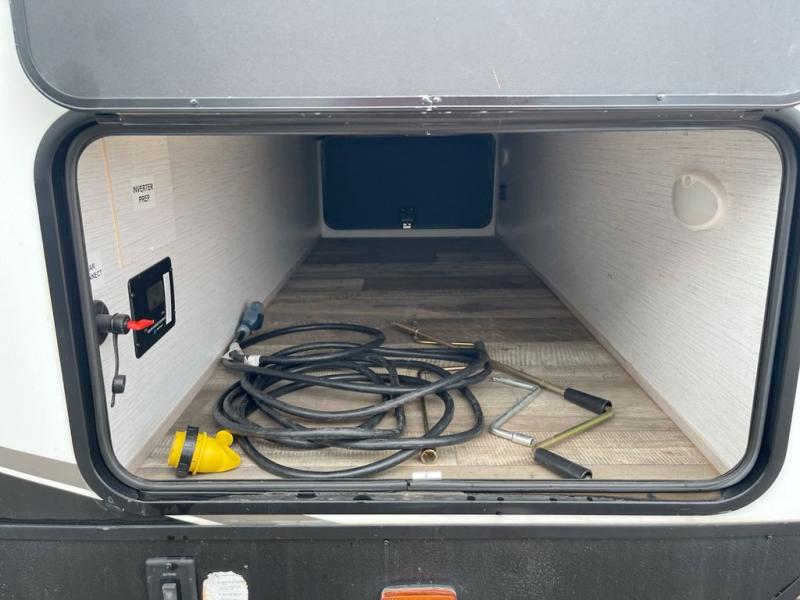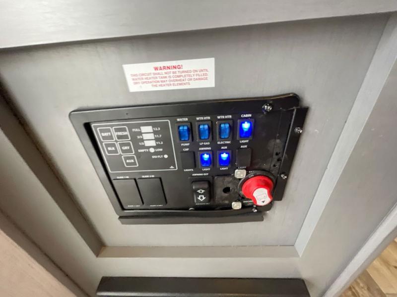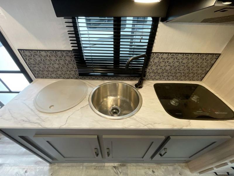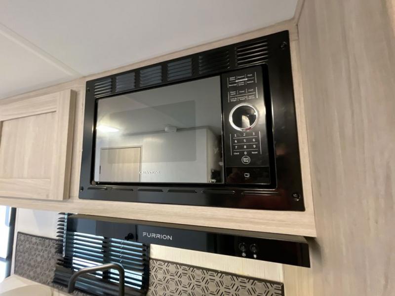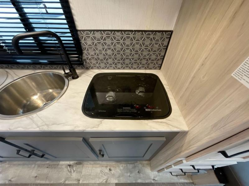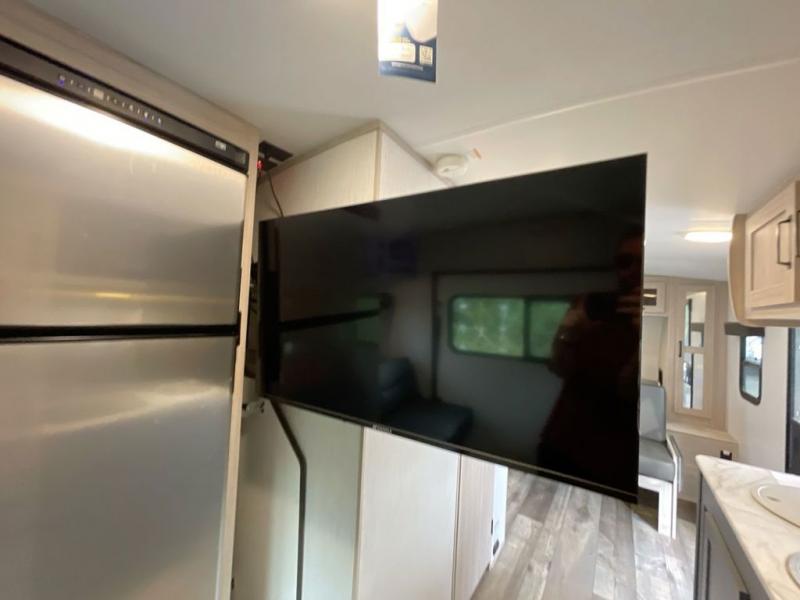 If you're looking for a versatile travel trailer you can take on your outdoor adventures, this is the one! The front Murphy bed will provide a great night's rest, and in the morning you can fold it away to relax on the sofa. The back of this unit is also accommodating with its free-standing dinette table and dinette seats; just unload your bikes from the flip-up back hatch door and you can enjoy lunch on the table! There is also a slide out TV here that rotates all the way around so you can watch a movie from the bed or the dinette. The full bath allows you to clean up after a trail ride, and the full kitchen lets you cook delicious meals!