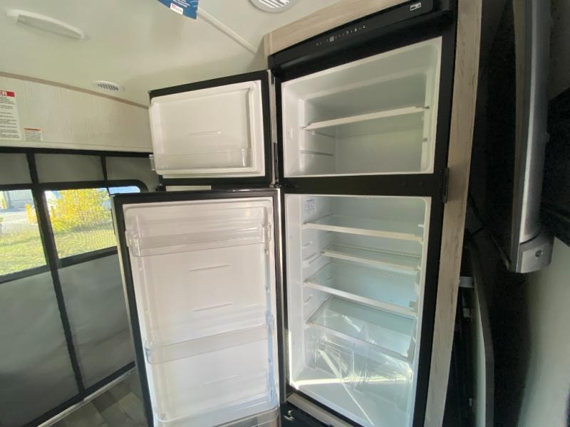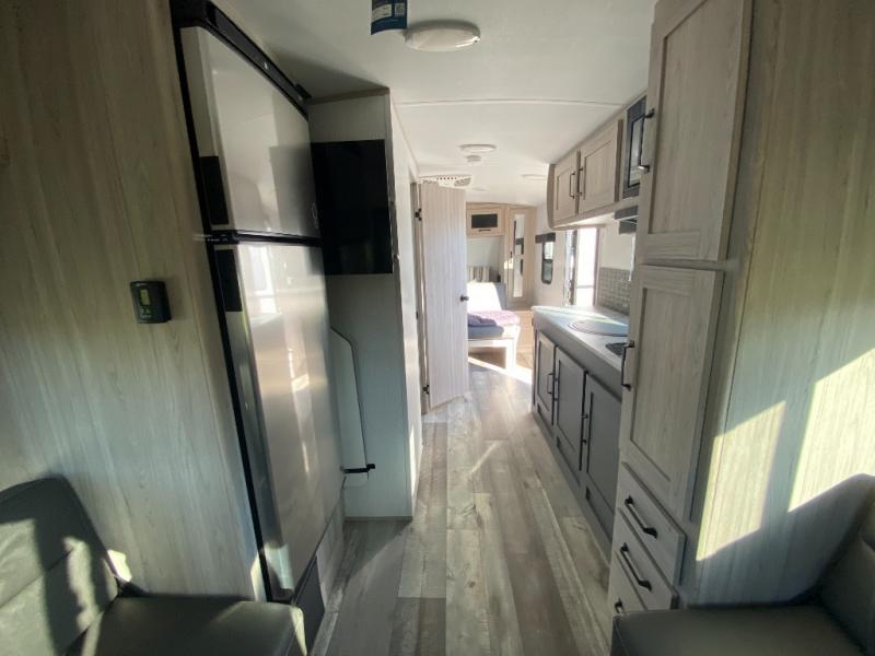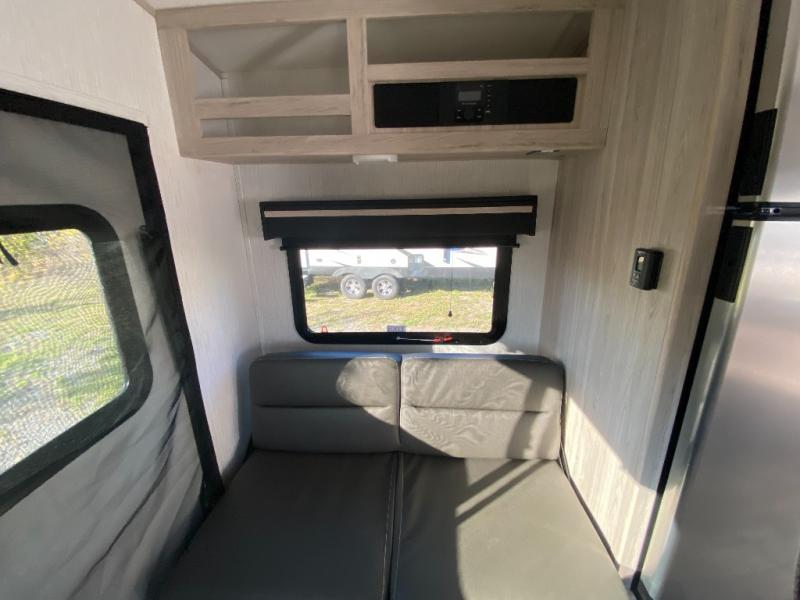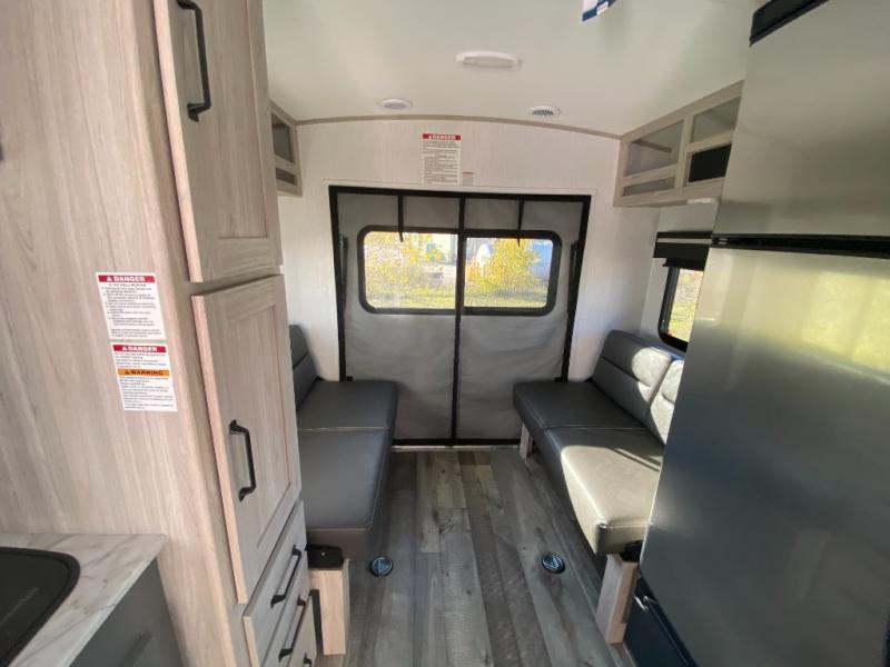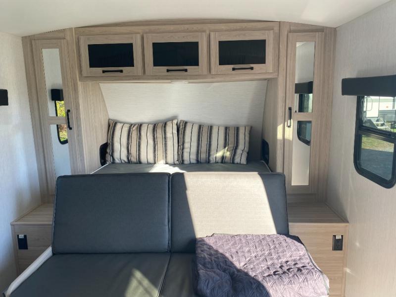 If you're looking for a versatile travel trailer you can take on your outdoor adventures, this is the one! The front Murphy bed will provide a great night's rest, and in the morning you can fold it away to relax on the sofa. The back of this unit is also accommodating with its free-standing dinette table and dinette seats; just unload your bikes from the flip-up back hatch door and you can enjoy lunch on the table! There is also a slide out TV here that rotates all the way around so you can watch a movie from the bed or the dinette. The full bath allows you to clean up after a trail ride, and the full kitchen lets you cook delicious meals!