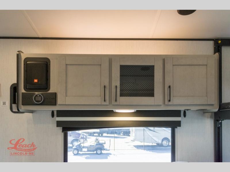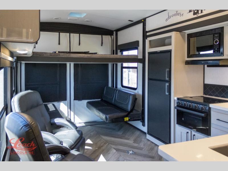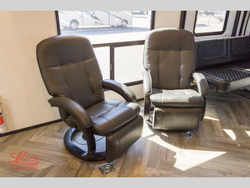 Start camping in luxury with this toy hauler! It features a front private bedroom with a king bed to get a good night's rest each night and even an entrance into the dual entry bathroom which has a radius shower with a skylight above it. You can prepare your best home cooked meals with the three burner cooktop and enjoy them at the sofa with a dinette below the power queen bed. There are also two recliners to read the morning newspaper. The 2,500 lb. ramp door makes it easy to load and unload your off-road toys into the the 13' garage area. Stay protected rain or shine with the 19' electric awning!