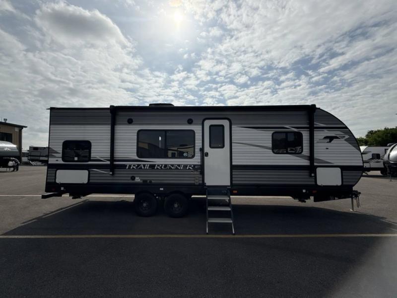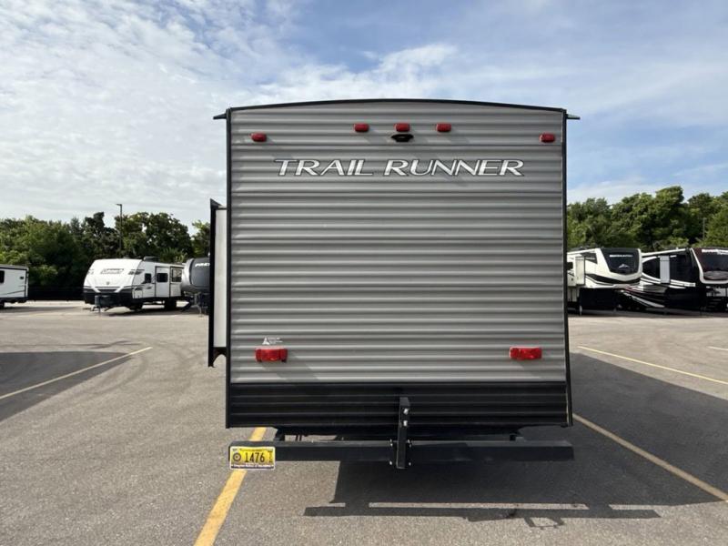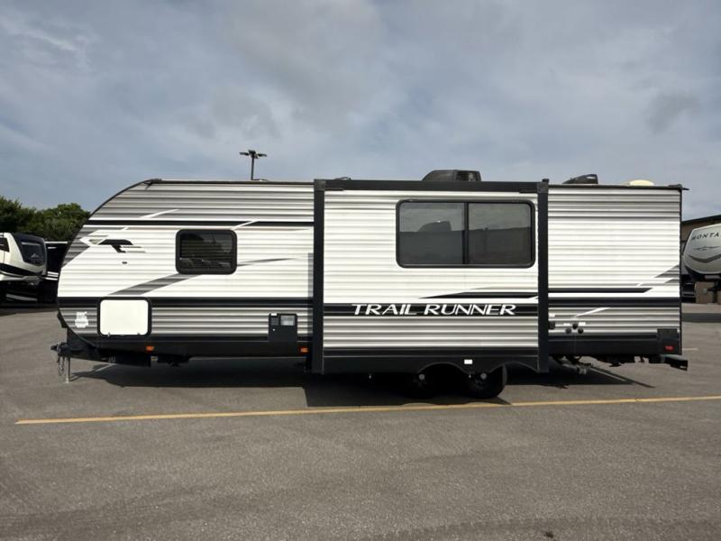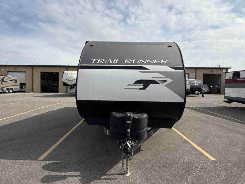 Paradise awaits at the end of the trail with one of these Heartland Trail Runner travel trailers! Experience better wind and water deflection, added strength, and a reduction of tongue weight with the hybrid aluminum front profile that has an aerodynamic radius front cage. A cambered structural steel I-beam frame holds them together and a heated enclosed underbelly protects the units vitals. There is an industry leading mammoth storage space of 57 cu. ft. pass-through storage so you can bring all of your outdoor gear with you. Roller shades in the main living area, woven flooring in all slide rooms, master suites with CPAP storage, and upgraded pressed counters give you the at-home feel you desire. Come find the perfect model for you today!