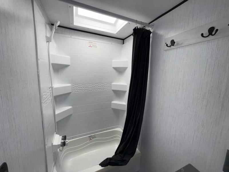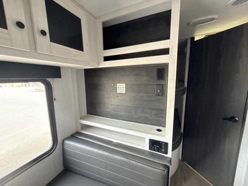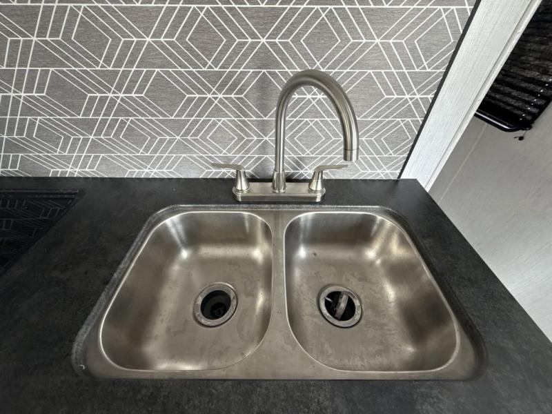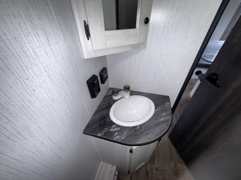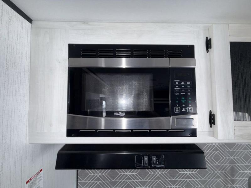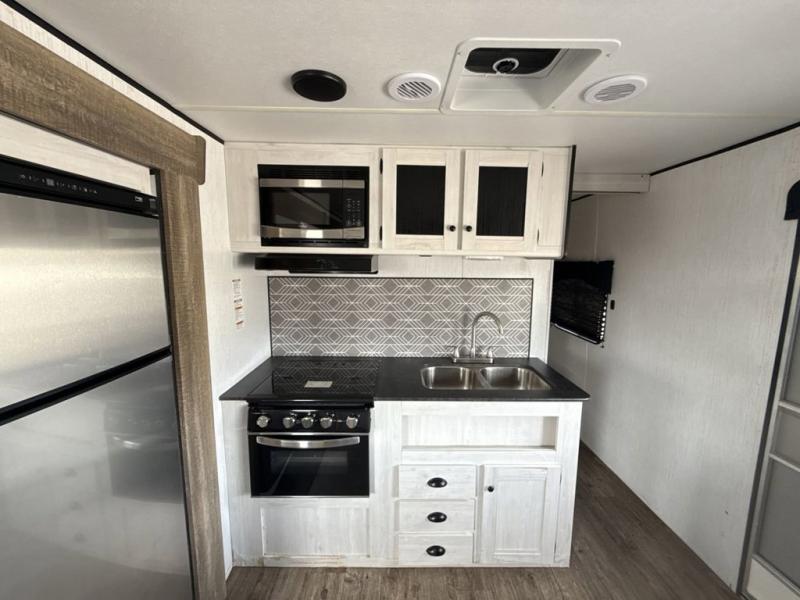 Enjoy family time at the campground with this travel trailer! The kiddos can sleep on the set of double bunk beds and you will have your own privacy with the front private bedroom which has a queen bed with under-bed storage and wireless cell charging stations for one less thing to bring with you. The chef can whip up their best meals with the three burner cooktop and everyone can enjoy them together at the booth dinette then play a card game or two. If you're not big into card games then you can relax on the sofa while you enjoy a cold drink stored in the 10 cu. ft. stainless steel refrigerator. Freshen up each day in the rear corner bathroom with the ABS tub/shower surround with a skylight above it!