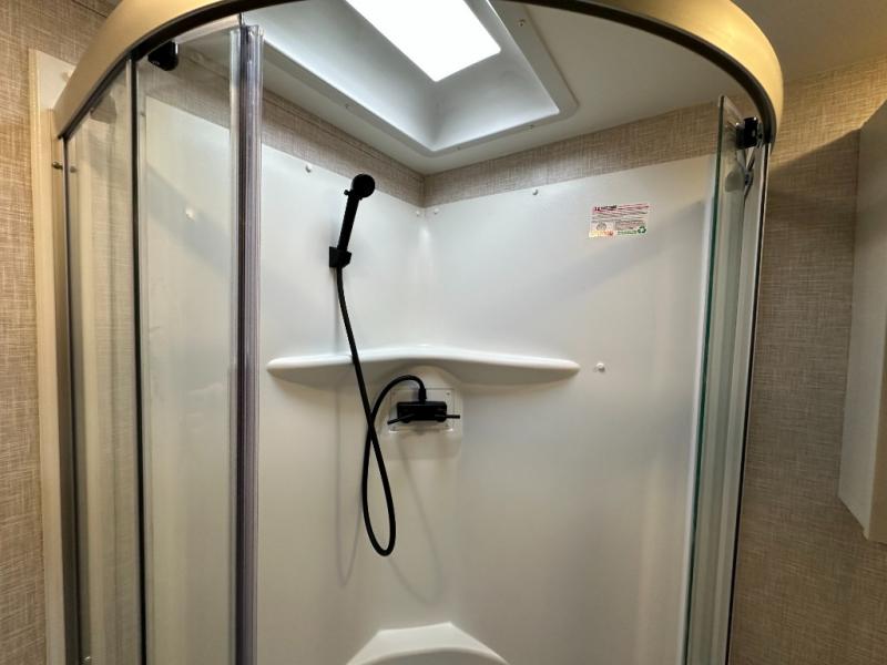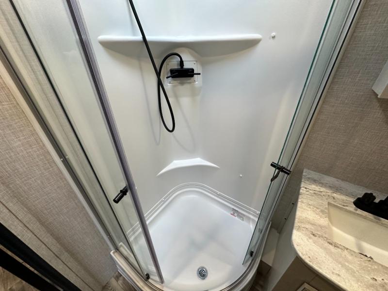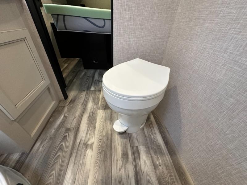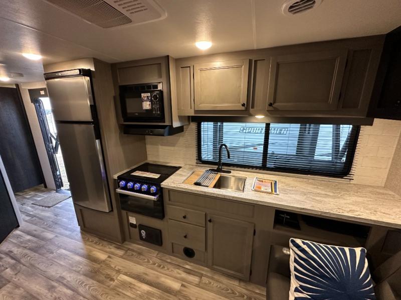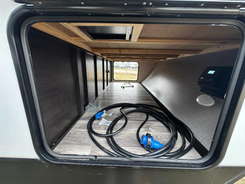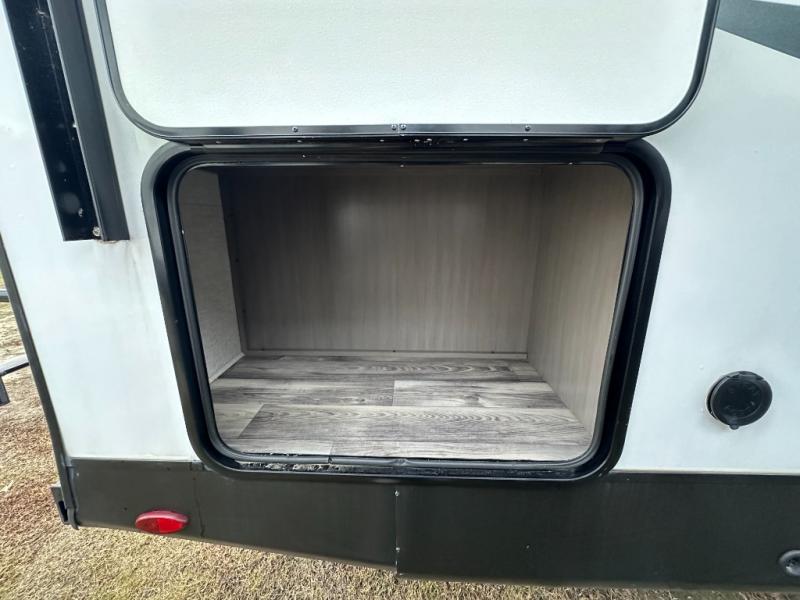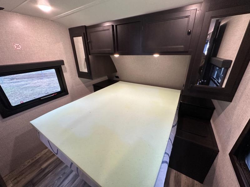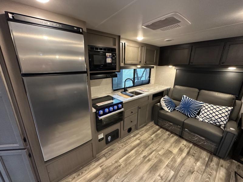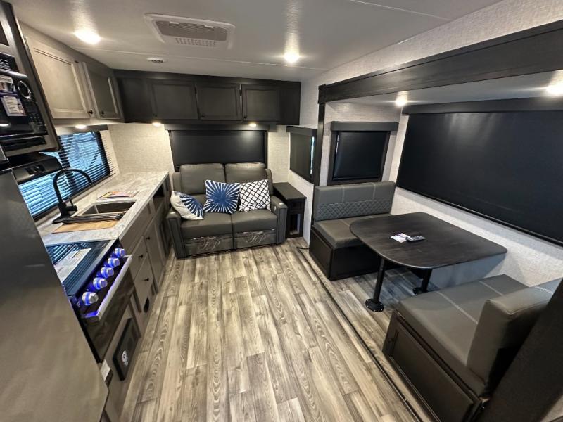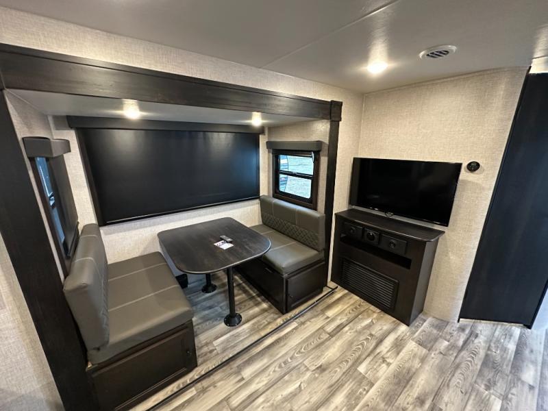You will have everything you could need for a fun camping trip in this travel trailer! Inside the front private bedroom is a queen bed with drawers underneath for extra blankets, wardrobes on either side to keep your clothes out of the way, and an entrance into the dual entry bathroom. The booth dinette offers a comfortable place to enjoy your meals, play games, and even transform into an extra sleeping space. If mother nature is raining on your parade then head to the rear tri-fold sofa to watch a movie on the smart HDTV at the entertainment center!