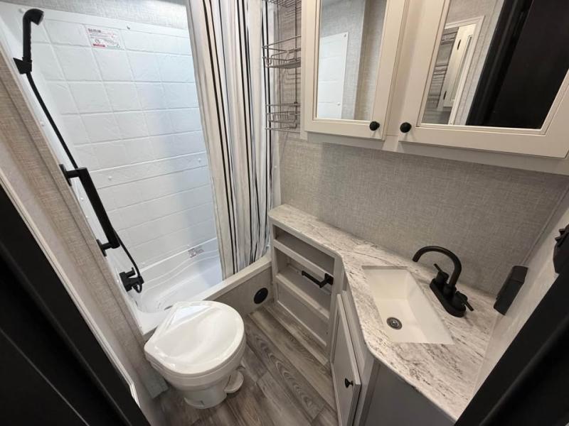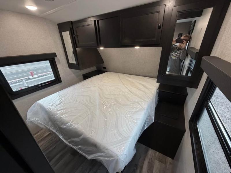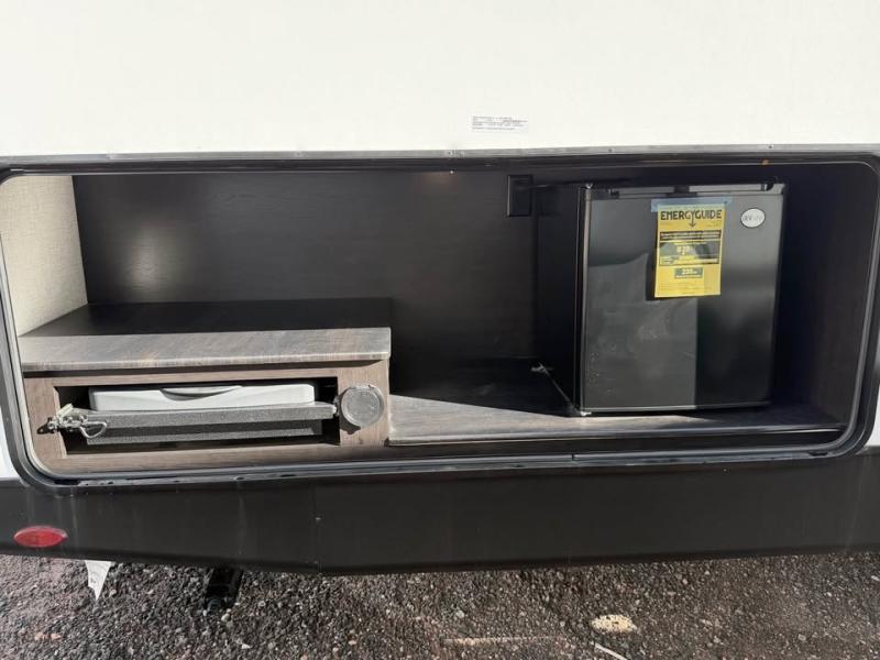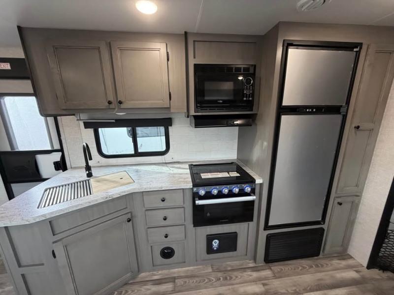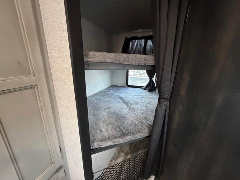 The kiddos will love sleeping on the rear set of double over double bunk beds in this travel trailer! There is plenty of storage throughout between the storage under the lower bunk, the drawers underneath the queen bed, all of the overhead cabinets, and the exterior pass-through storage with motion lighting. You can prepare your best meal with the three burner cooktop, enjoy it at the booth dinette, and store any leftovers in the 10 cu. ft. refrigerator. Now that your belly is full, you can either relax on the tri-fold sofa and watch a movie on the smart HDTV at the entertainment center or take a hot shower in the rear corner bathroom!