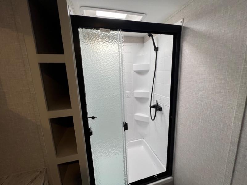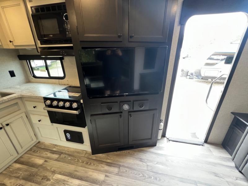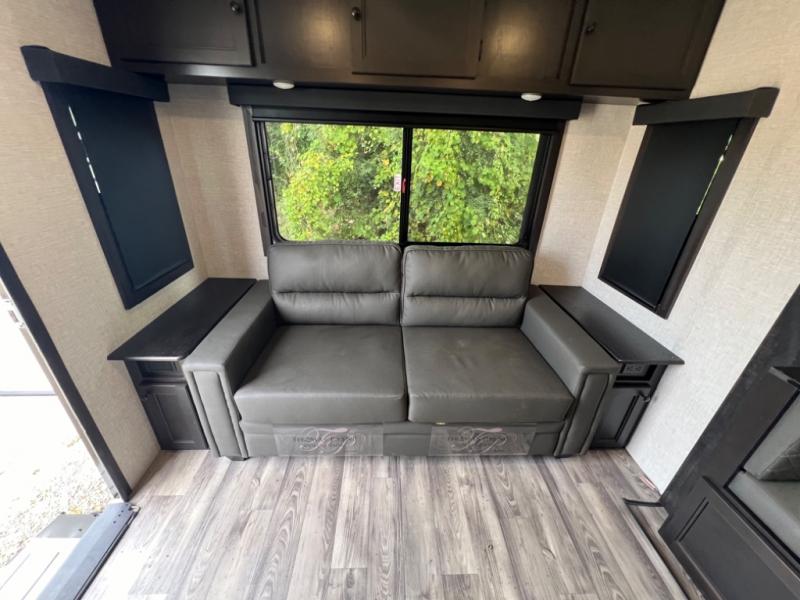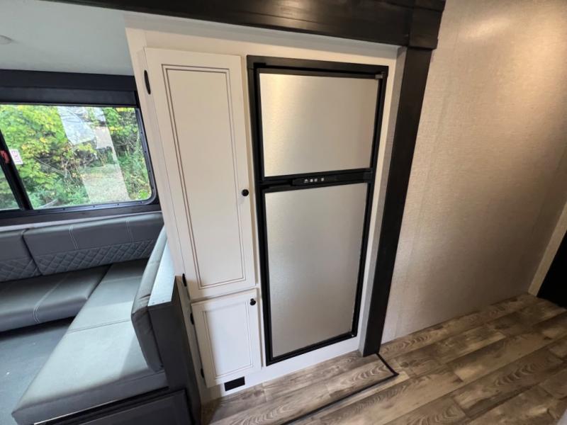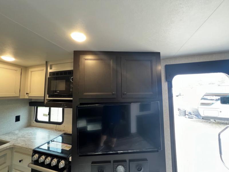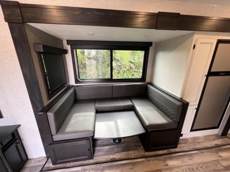There is plenty of walking around space in this travel trailer! The dual entry doors make it easy to enter/exit this unit and one of the entrances leads directly into the front private bedroom. After getting a good night's rest on the queen bed with drawers underneath, you can either take a hot shower in the full bathroom or start frying up some bacon and eggs on the three burner cooktop to enjoy at the U-shaped dinette. The rear tri-fold sofa is a great place to take an afternoon nap or relax on while watching a movie on the smart HDTV at the entertainment center. A 21' power awning with LED lighting will highlight the good times socializing at night!