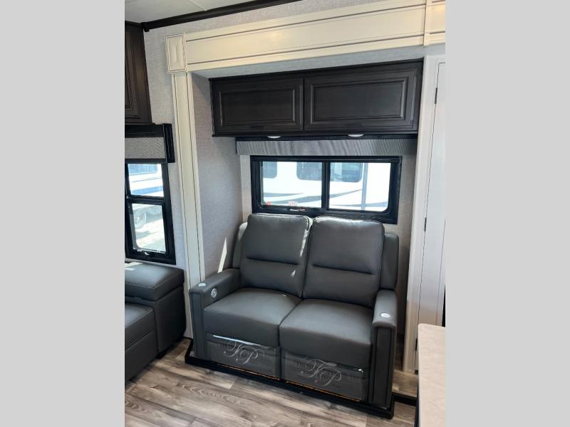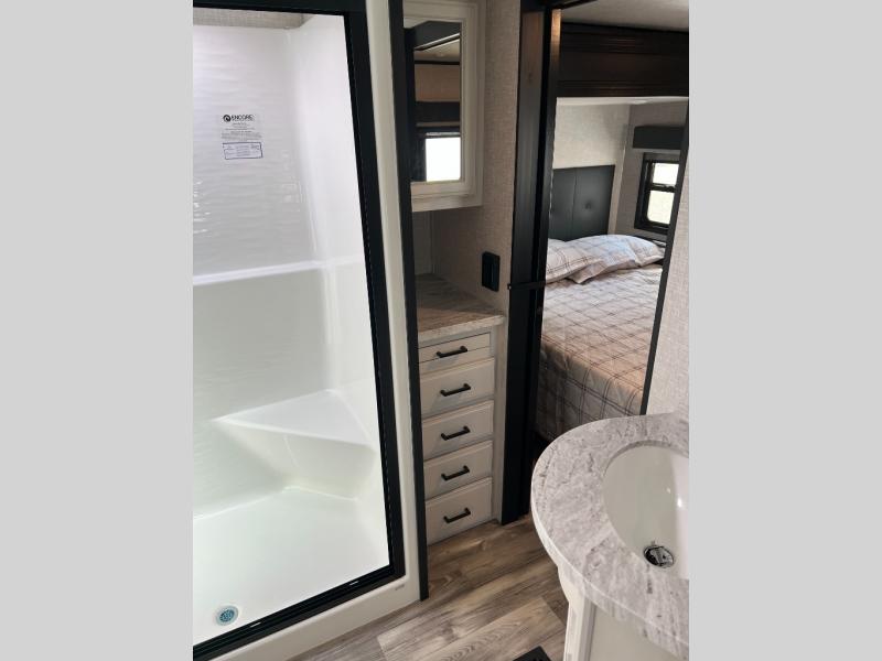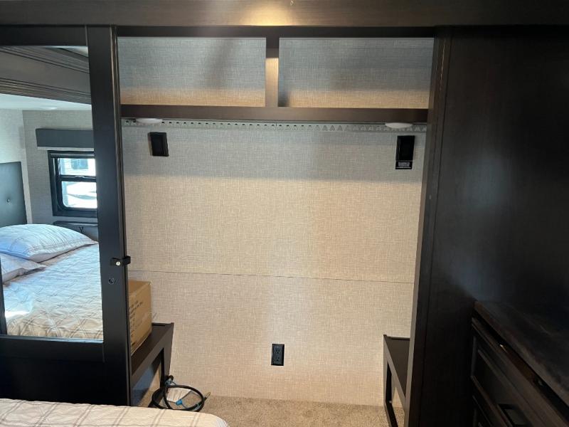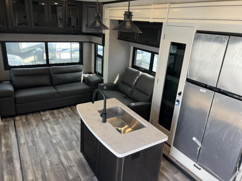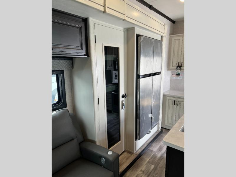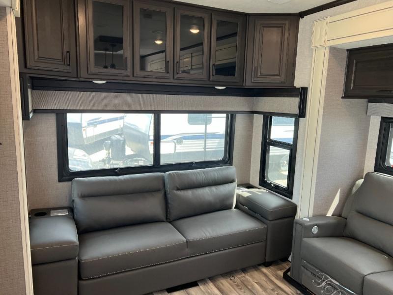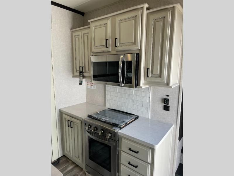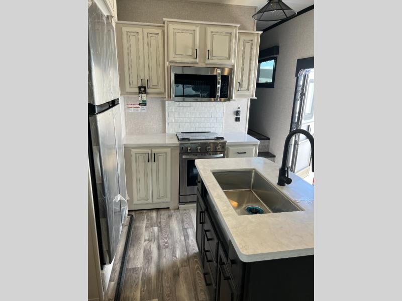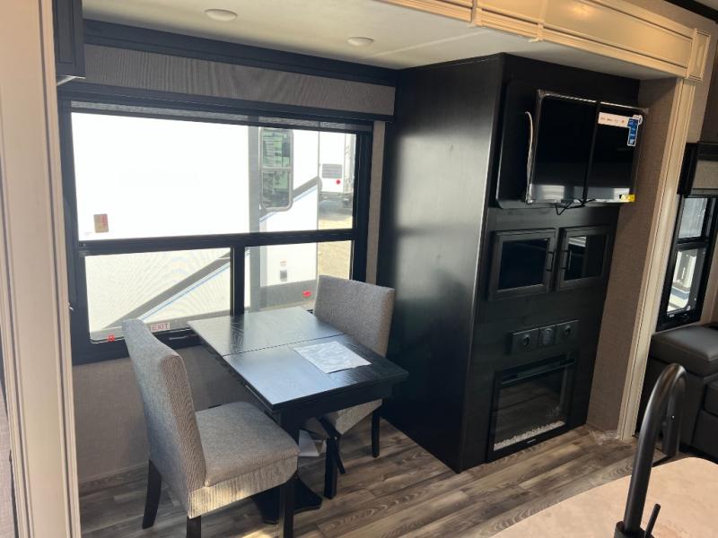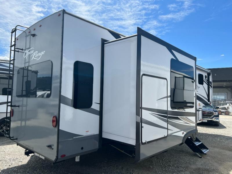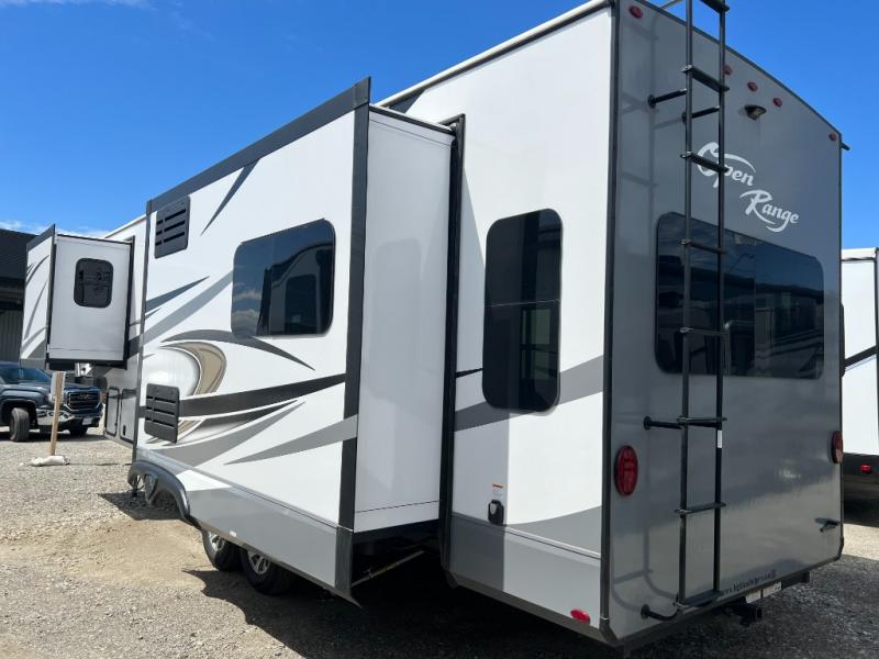 Looking for a fifth wheel to enjoy while towing as well as while staying at the campgrounds that offers enough space for two or more to always be comfortable? You have found it! This Open Range provides a spacious main living and kitchen area with dual opposing slides, plus full kitchen amenities including a residential convection microwave, a kitchen island to prepare meals and clean the dishes, a large pantry, and a free-standing table with chairs to dine at. The theater seating includes a heat and massage function and the tri-fold sofa with adjustable headrests provides sleeping space as well. You can sleep easily in the master bedroom with access to the double entry bath, plus the bedroom includes plenty of storage, a mirrored wardrobe and a space to add a washer/dryer option, and more!