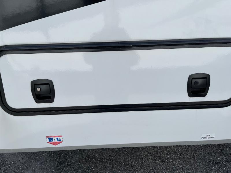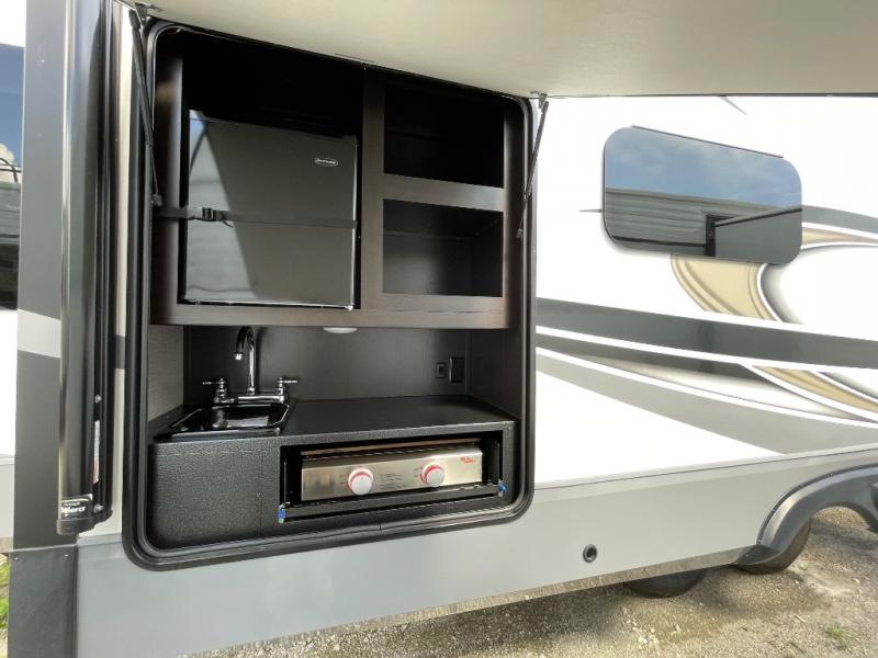 Living in this trailer is made easy with all the conveniences and comforts found throughout! So pick your destination, hitch up and head out! The private bedroom is up front and includes a mirrored wardrobe, a queen bed slide, or choose the king option, a dresser, a space prepped for a washer/dryer option plus access to the double entry full bath. The main living and kitchen area is spacious with dual opposing slides and offers the cook full amenities including a kitchen island and large pantry, plus you can dine at the booth dinette or choose a free standing table and chairs in its place. The theater seats and tri-fold sofa with adjustable headrests allow you to relax while watching the 39" LED HDTV with a fireplace below. And don't forget about the outside kitchen when making meals and the two power awnings providing protection from the elements.