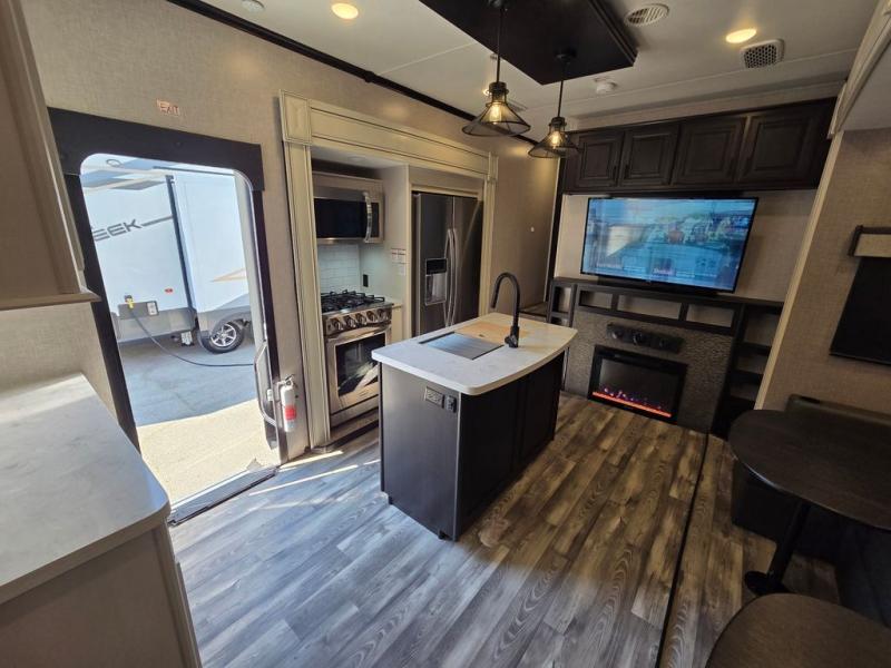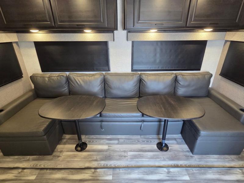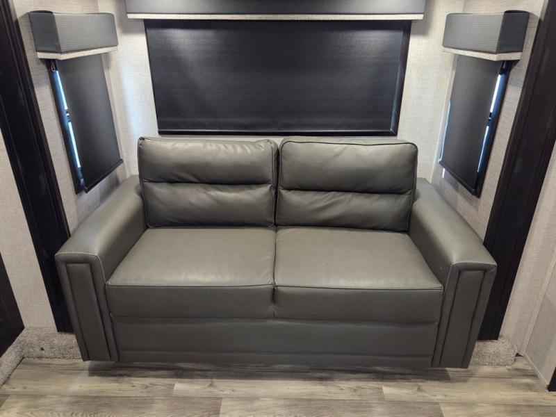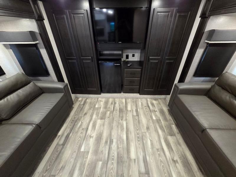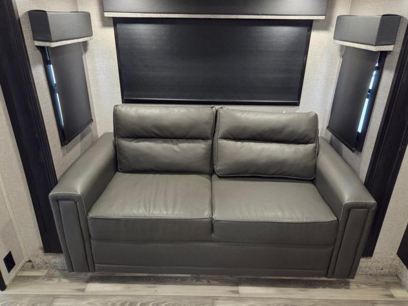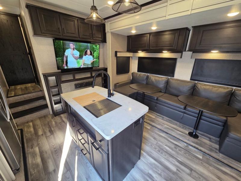 Searching for a fifth wheel that allows you to utilize every room to its fullest? You're going to love this front living area that includes two tri-fold sofas, a 40" TV, a refrigerator, plus a half bath for guests! The main living and kitchen area is spacious with dual opposing slides, and includes a kitchen island, a residential convection microwave and four-burner range with an oven. You can even watch the 50" LED HDTV with a fireplace below while sitting at the U-Lounge with two tables. This seating can provide sleeping space as well, or you might choose the theater seats and table with chairs option in its place. And the rear bedroom offers a walk-around queen bed, a mirrored wardrobe slide out, plus a full bathroom just steps away!