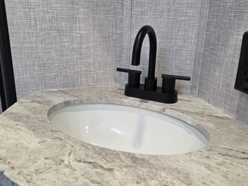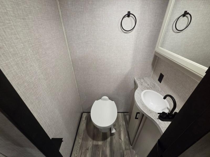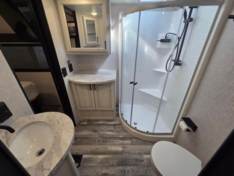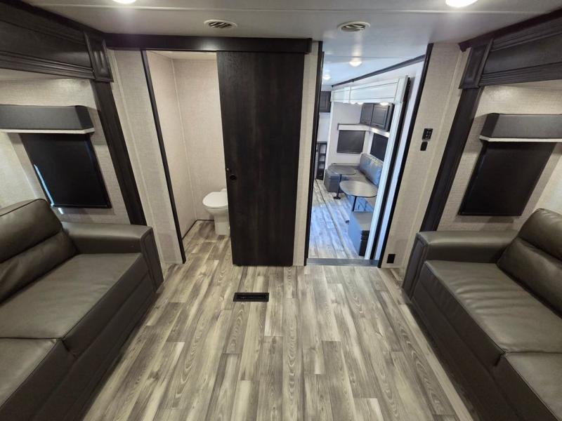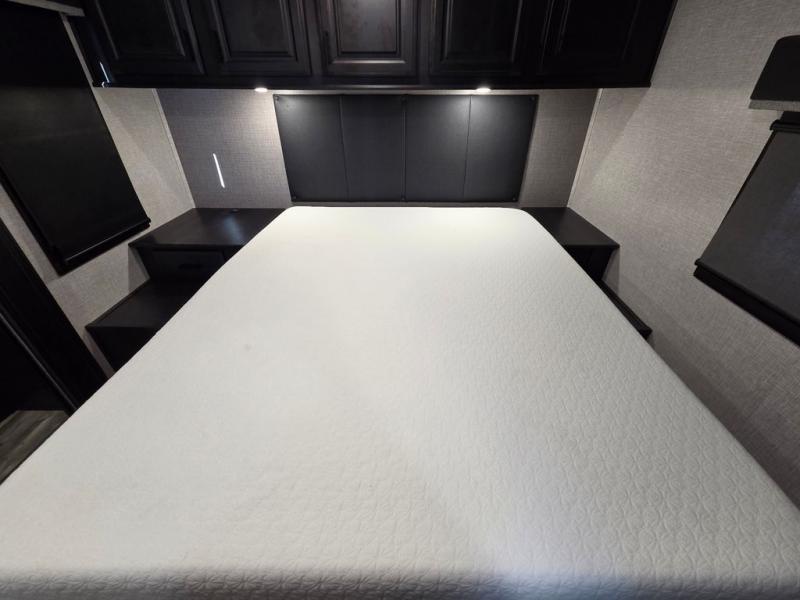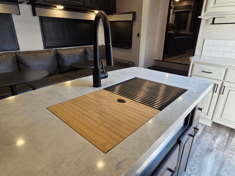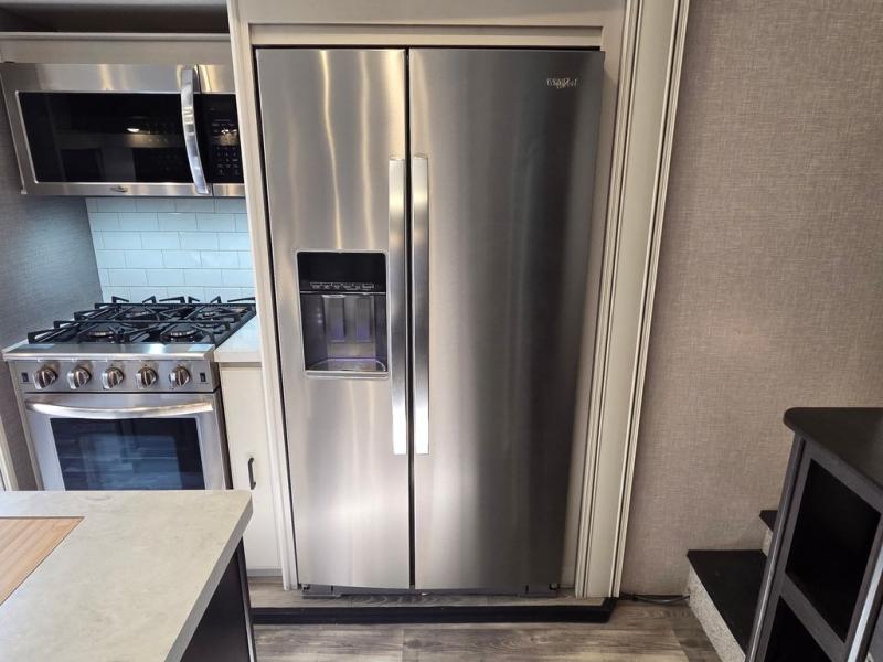Searching for a fifth wheel that allows you to utilize every room to its fullest? You're going to love this front living area that includes two tri-fold sofas, a 40" TV, a refrigerator, plus a half bath for guests! The main living and kitchen area is spacious with dual opposing slides, and includes a kitchen island, a residential convection microwave and four-burner range with an oven. You can even watch the 50" LED HDTV with a fireplace below while sitting at the U-Lounge with two tables. This seating can provide sleeping space as well, or you might choose the theater seats and table with chairs option in its place. And the rear bedroom offers a walk-around queen bed, a mirrored wardrobe slide out, plus a full bathroom just steps away!