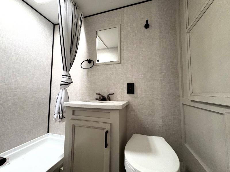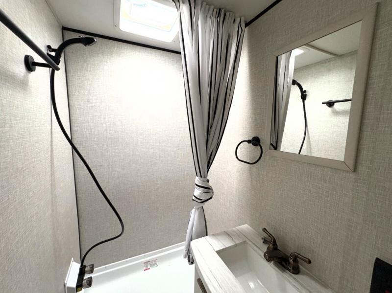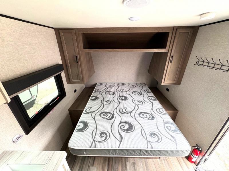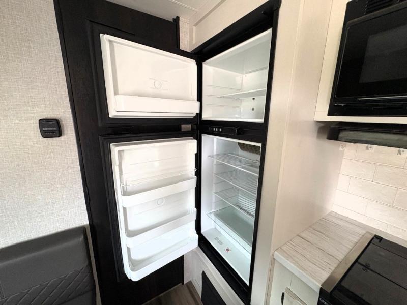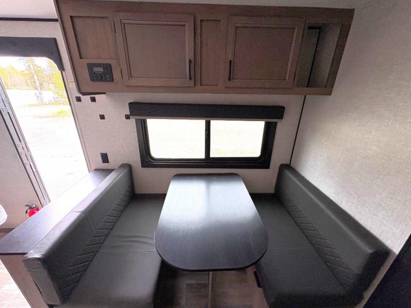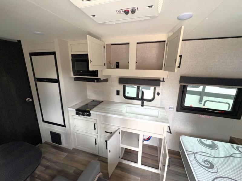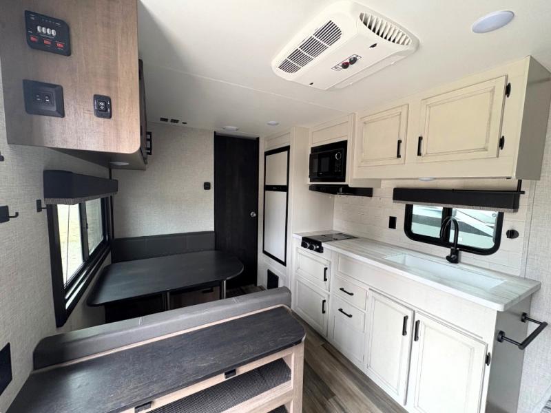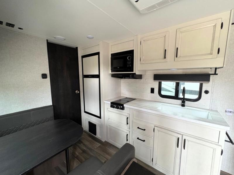 Head to the lake or the woods in this cozy travel trailer that can sleep three to four each night. There is a bed up front with dual wardrobes on either side of the bed, plus a booth dinette for guests. You will appreciate plenty of overhead storage for all your belongings, and the full rear bath is both spacious and tucked away for privacy. This model also has everything needed each day to prepare at-home meals, including a microwave oven and a two burner cooktop.