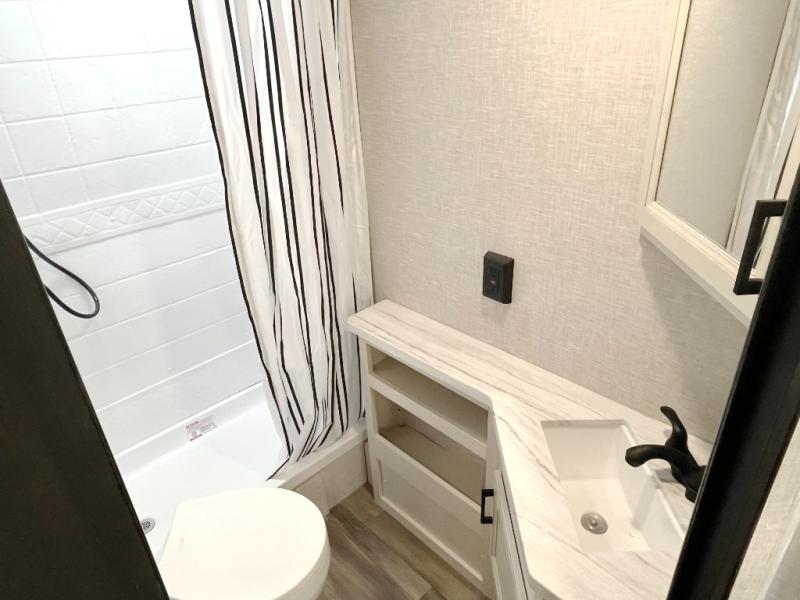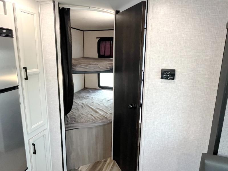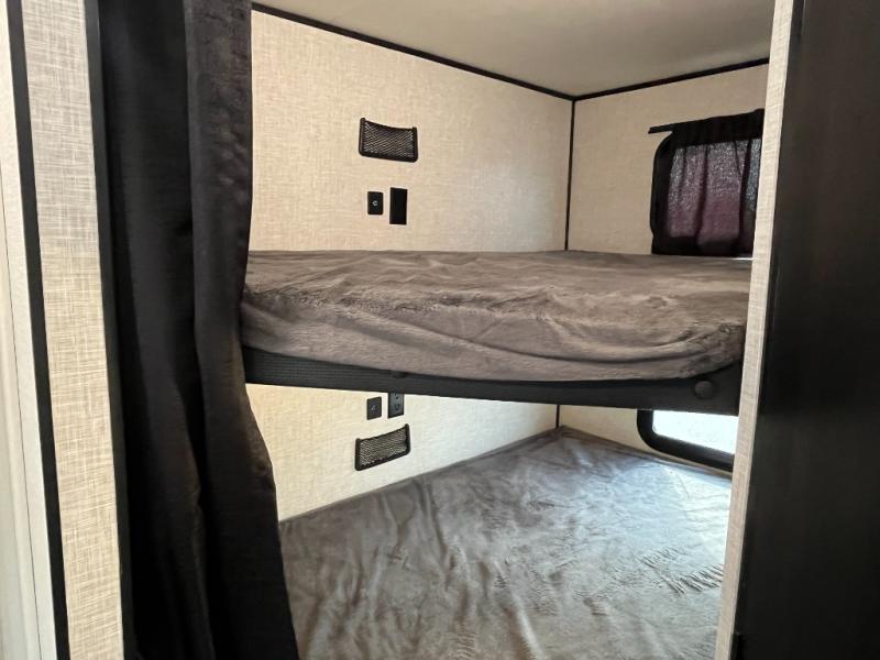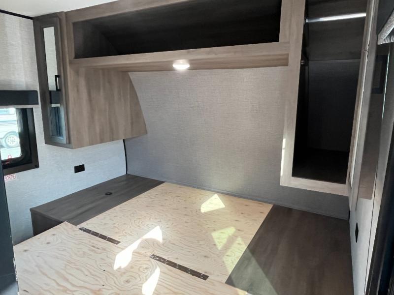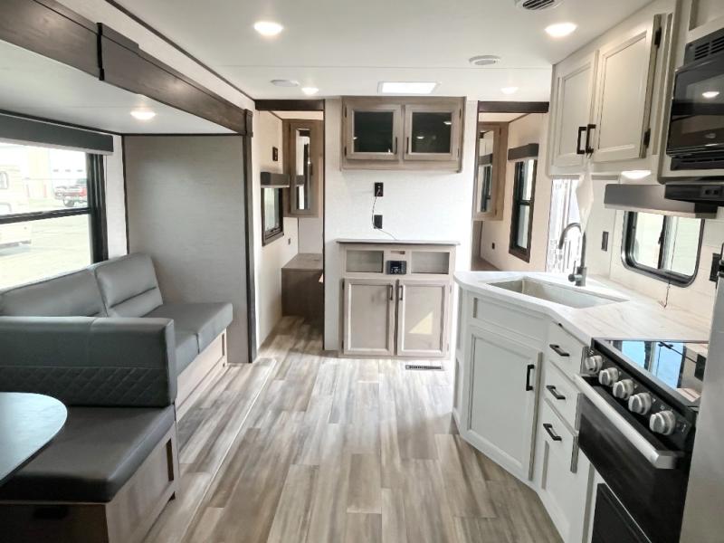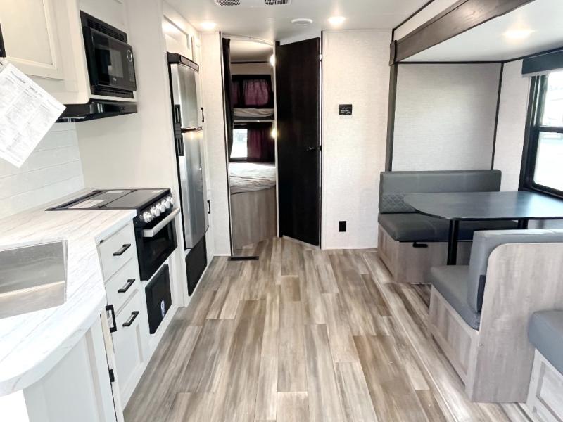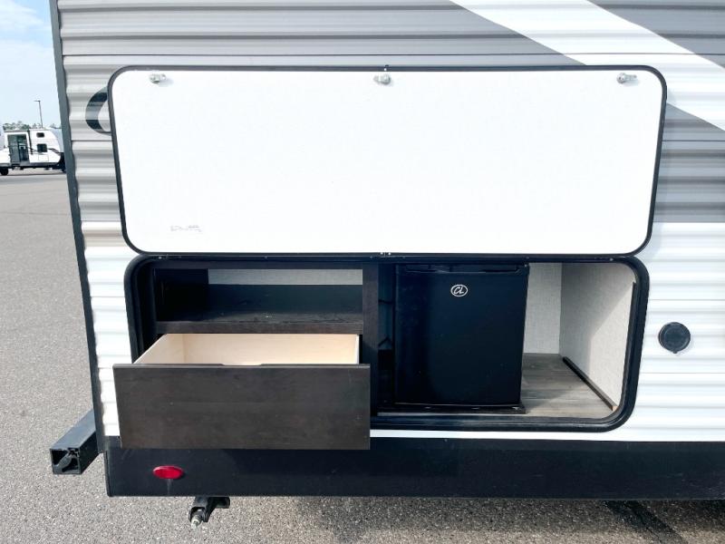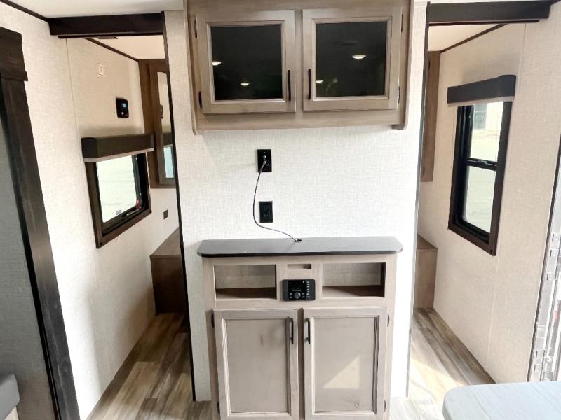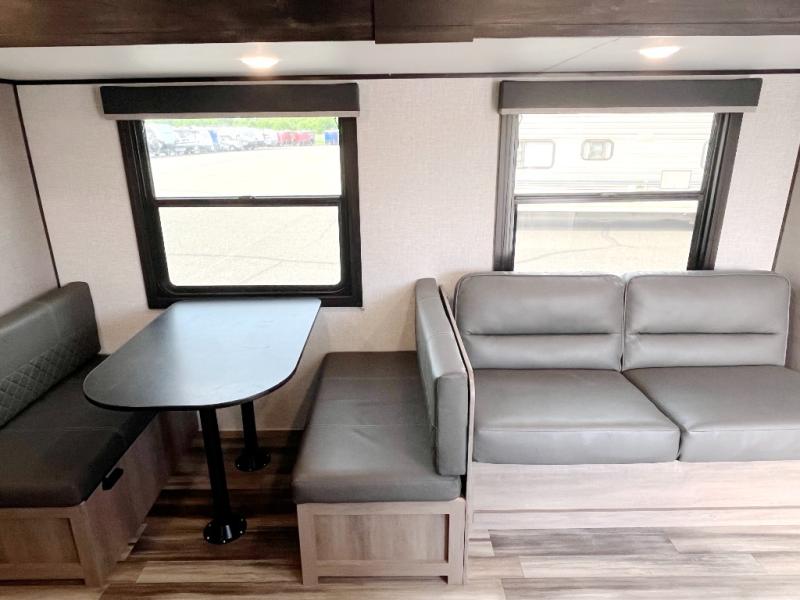 You're going to love every minute spent in this spacious travel trailer. The booth dinette and jack-knife sofa within the large slide out will be perfect for meal times, relaxing, and additional sleeping space. Add the optional Smart TV to the entertainment center and you're set up for movie night! This model includes an outside kitchen with a griddle and a refrigerator for cold drinks, plus indoor appliances if the rain has ruined your plans for the day. You will enjoy your own bedroom up front with space-saving sliding doors and two wardrobes for your clothes.