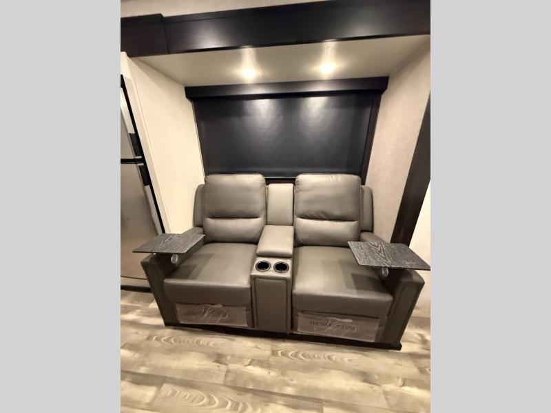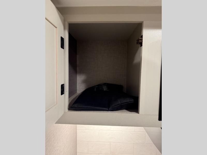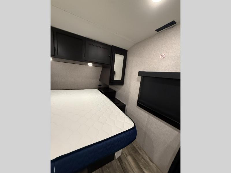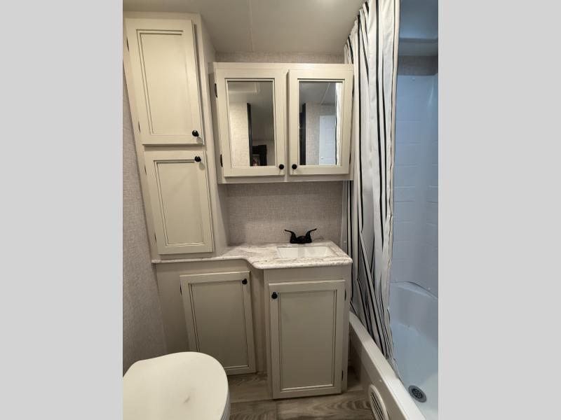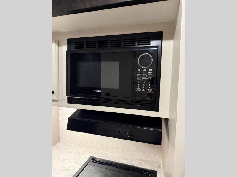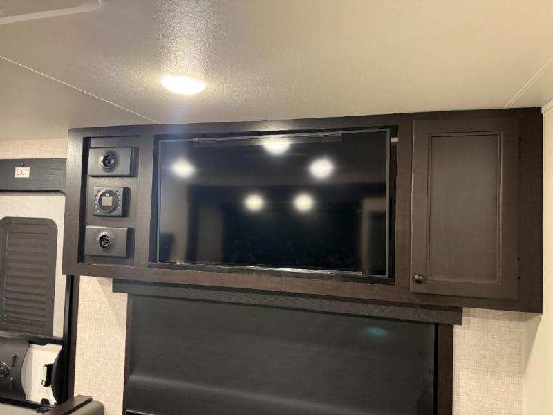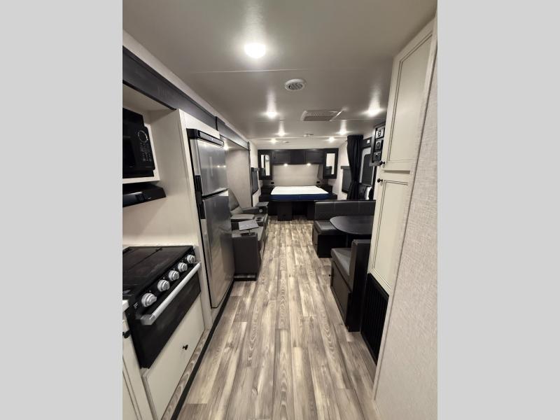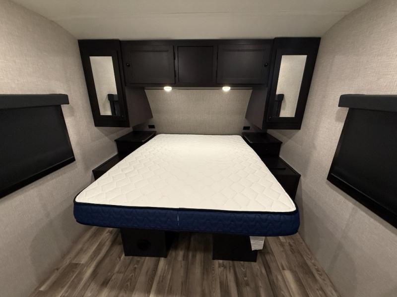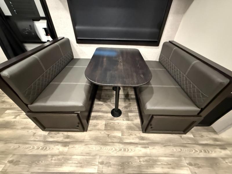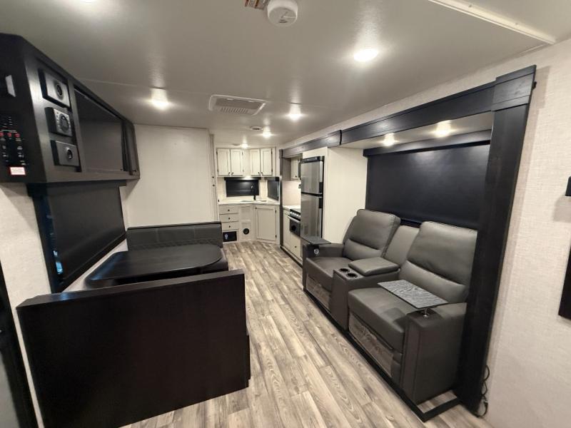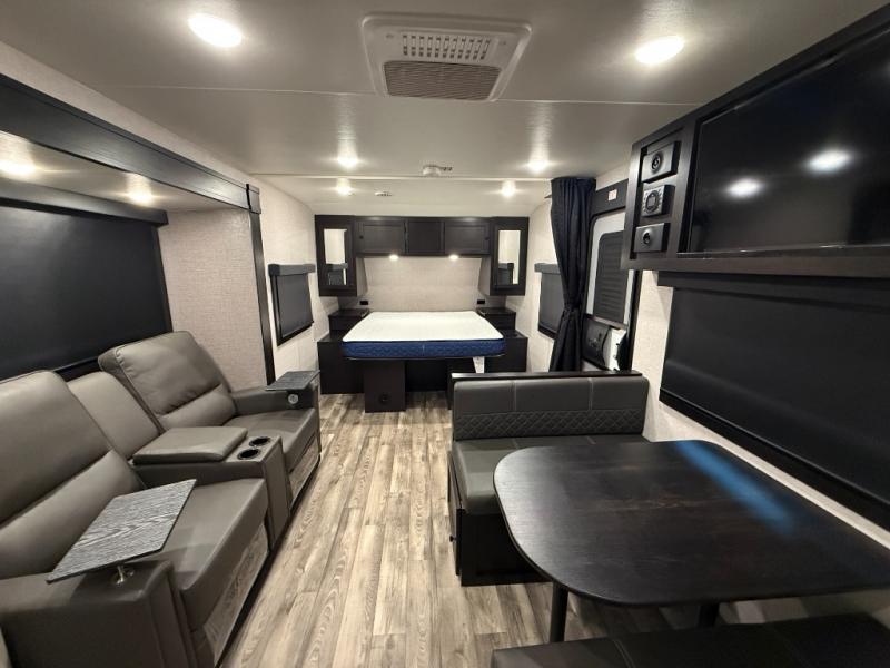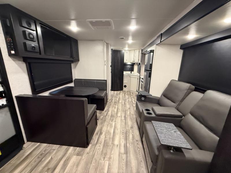 Enjoy a comfortable camping trip in this travel trailer! You will get a good night's rest each night on the front queen bed which has storage underneath it and wardrobes on either side of it. The tri-fold sofa and booth dinette can also transform into extra sleeping spaces if needed, plus the tri-fold sofa has the perfect view of the entertainment center. Prepare delicious home cooked meals with the three burner cooktop and store any leftovers in the 10 cu. ft. refrigerator. After a fun day at the beach you can freshen up with the tub in the rear corner bathroom. The exterior not only has an oversized pass-through storage with motion lighting, but also a docking station and a 19' power awning!