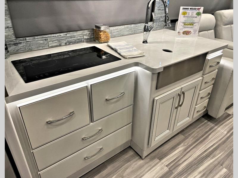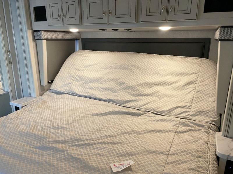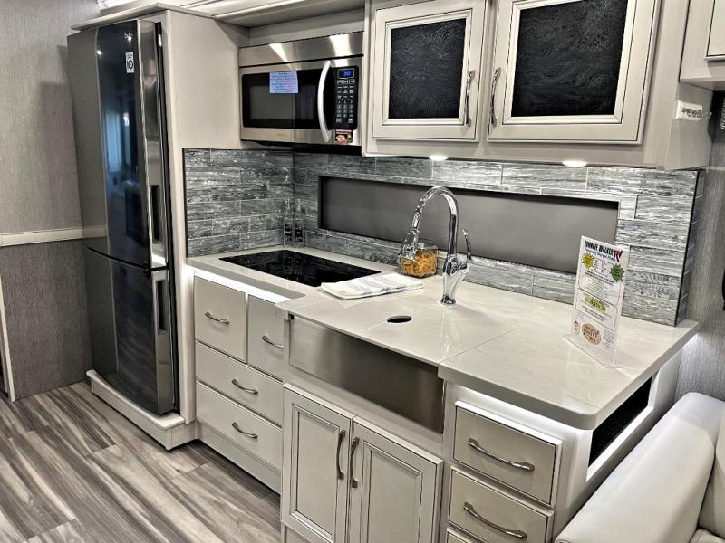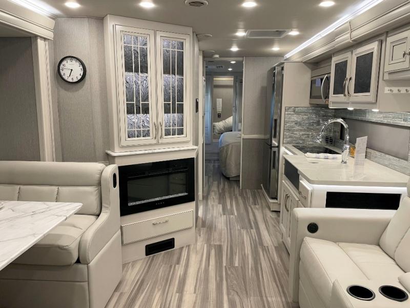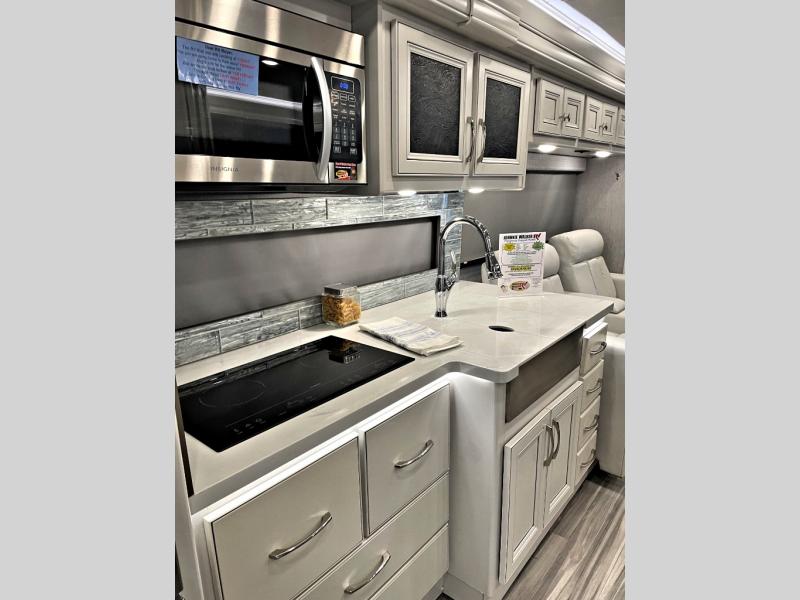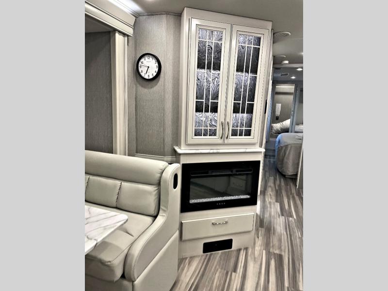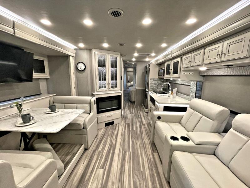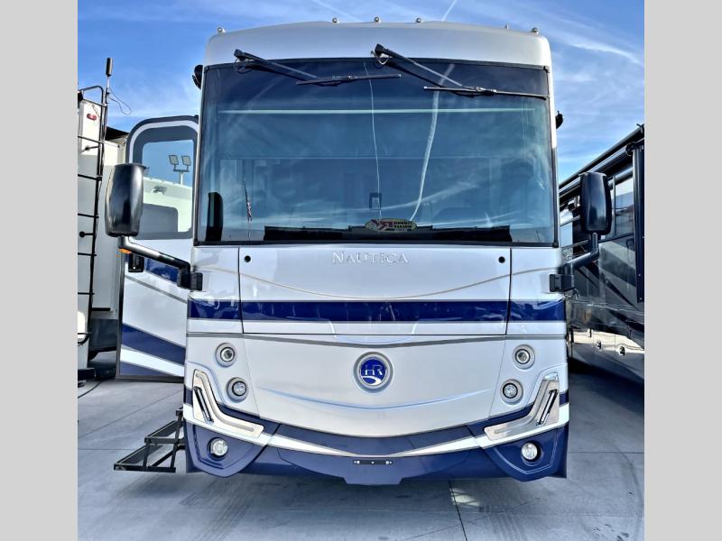 All hands on deck for the voyage of a lifetime in this Nautica Class A diesel motorhome! You will love, love, love the residential features found on this coach, like the Encore Series king-size bed in the rear private bedroom, the stainless steel residential refrigerator and convection microwave in the kitchen, the two fireplaces, and the three TVs. There is additional living space all throughout this coach because of the three slides, and there is also plenty of high-class style with the glass tile backsplash and stainless steel farmhouse sink, the composite tile flooring, the LED accent lighting, and the designer bedspread. Plus, the bathroom is phenomenal with its fiberglass shower, glass shower door, shower skylight, residential faucet, and medicine cabinet with mirror. You will be so impressed!