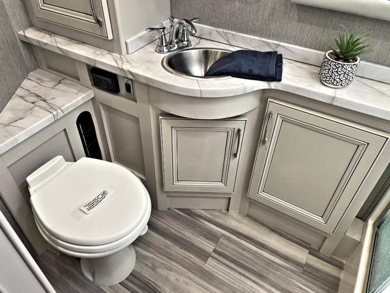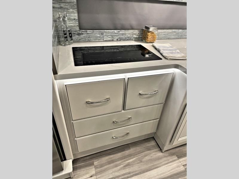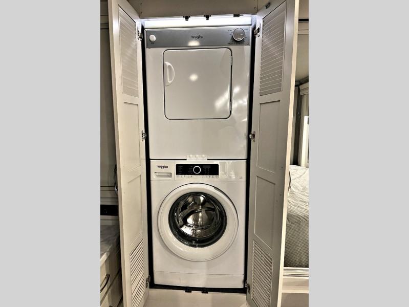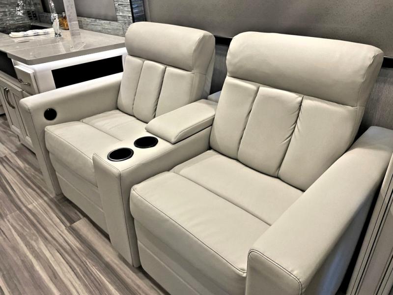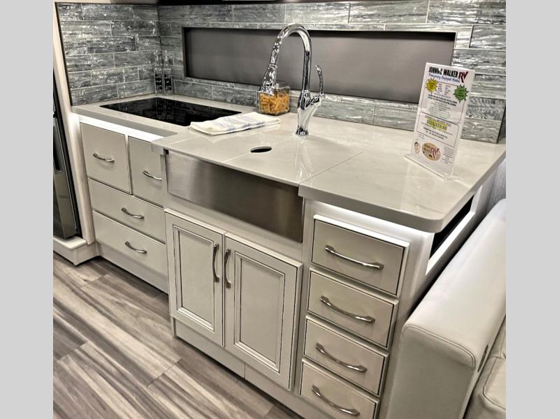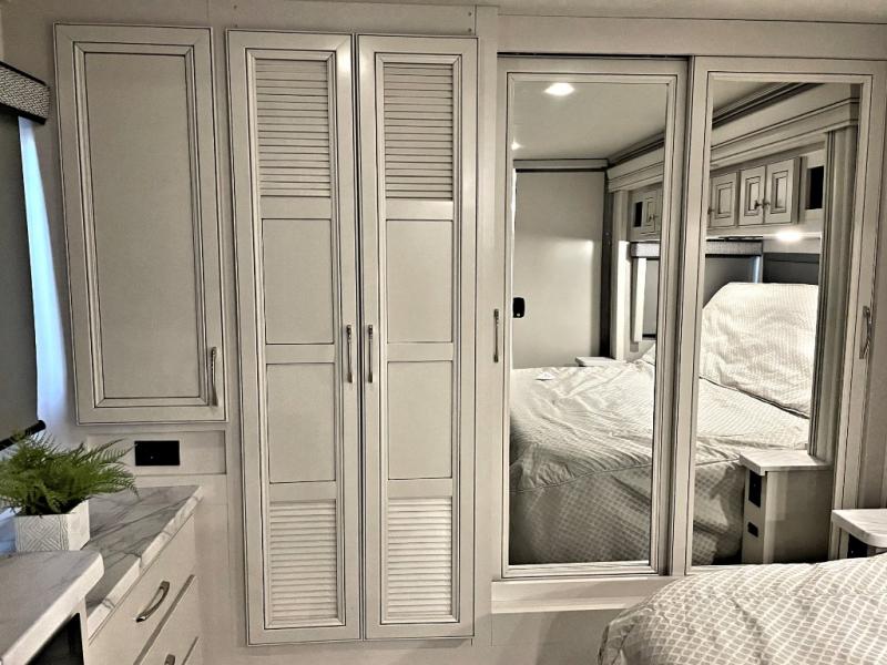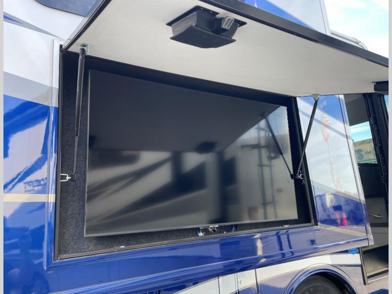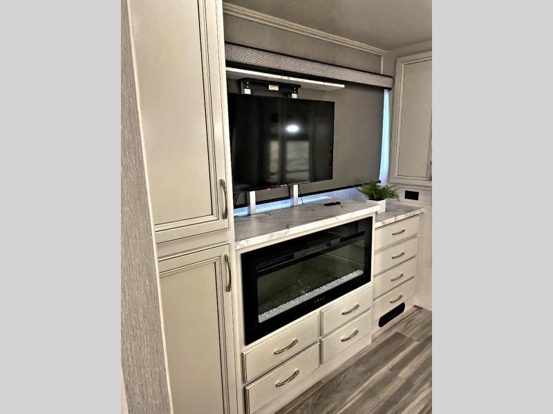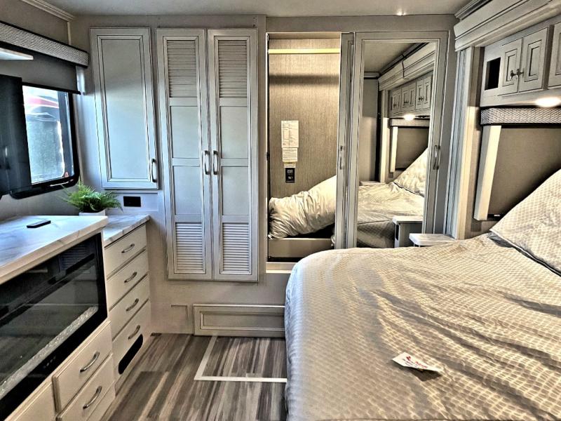 All hands on deck for the voyage of a lifetime in this Nautica Class A diesel motorhome! You will love, love, love the residential features found on this coach, like the Encore Series king-size bed in the rear private bedroom, the stainless steel residential refrigerator and convection microwave in the kitchen, the two fireplaces, and the three TVs. There is additional living space all throughout this coach because of the three slides, and there is also plenty of high-class style with the glass tile backsplash and stainless steel farmhouse sink, the composite tile flooring, the LED accent lighting, and the designer bedspread. Plus, the bathroom is phenomenal with its fiberglass shower, glass shower door, shower skylight, residential faucet, and medicine cabinet with mirror. You will be so impressed!