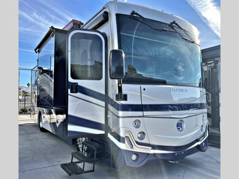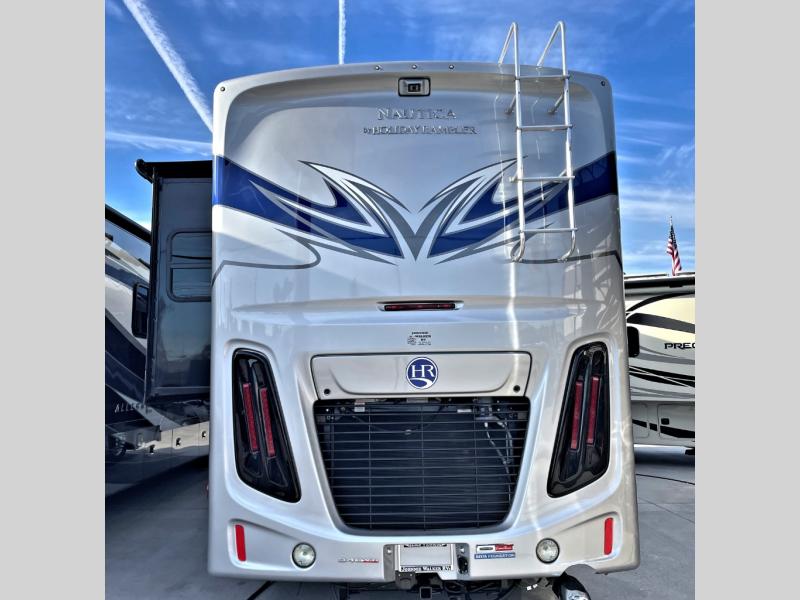 Surprise your family with the best and brightest Class A diesel motorhome on the market: the Holiday Rambler Nautica! These coaches come with a fantastic list of features that will surely provide you with RV living at its finest. The Freightliner custom raised rail chassis is an amazing base that will provide you with more strength and power. Enjoy a safer, more stable driving experience with the DriveTech/Optiview display and control system. More construction and exterior features include the premium gel exterior vetrosina fiberglass skin, the vacu-bond aluminum-framed sidewalls, walls and floors, plus the fiberglass front and rear cap assembly. You will find it quite enjoyable to travel from place to place since the cab comes with plenty of deluxe amenities, like a color backup monitor, a 10.2" touchscreen stereo, reclining back and swivel driver and passenger seats, and a driver console with lower storage bin as well as a passenger console.