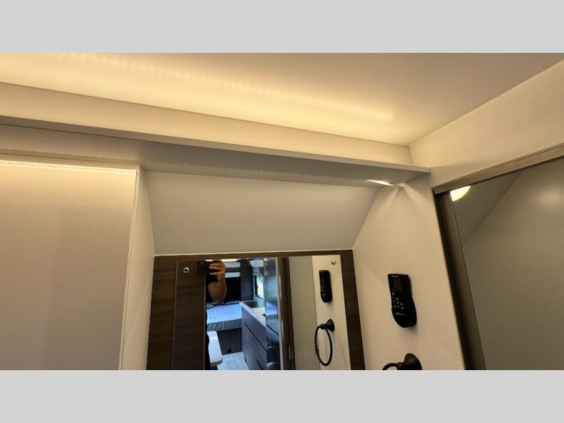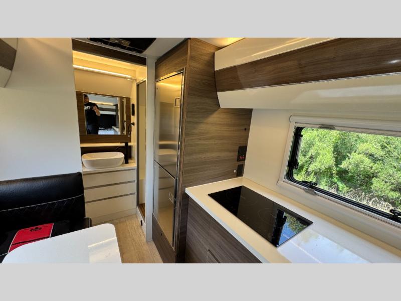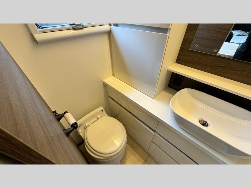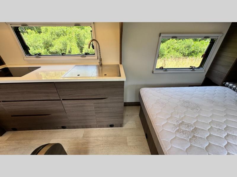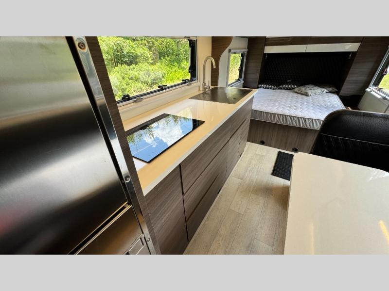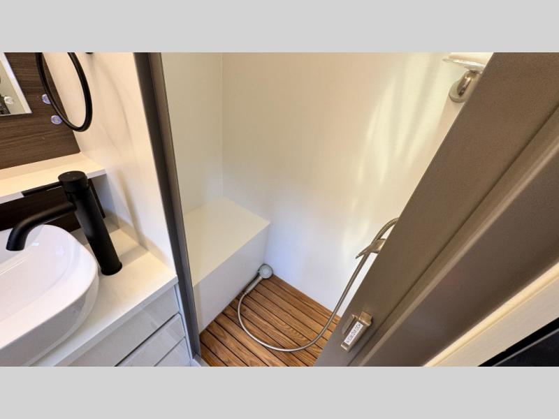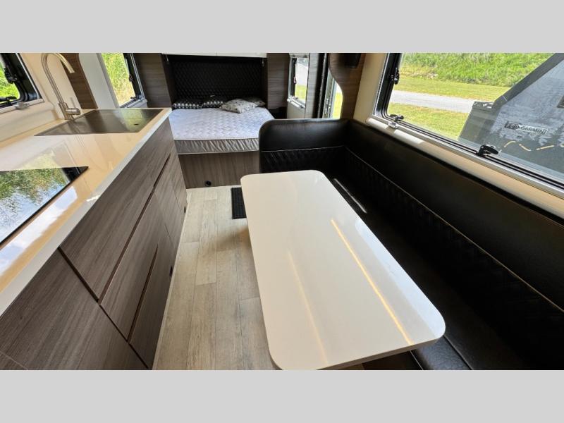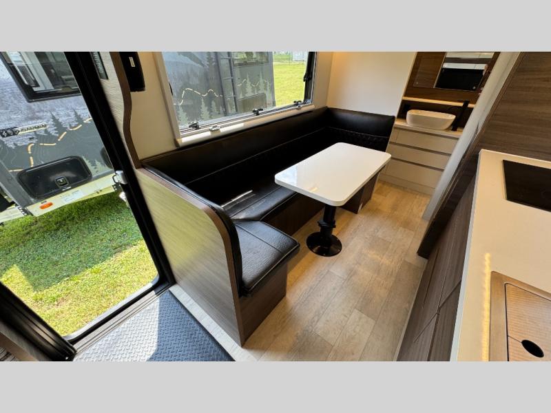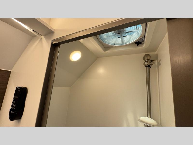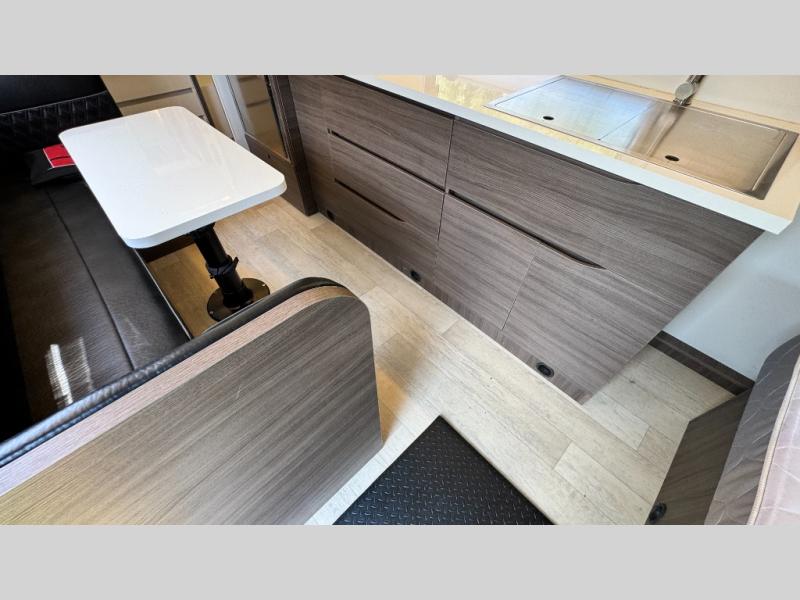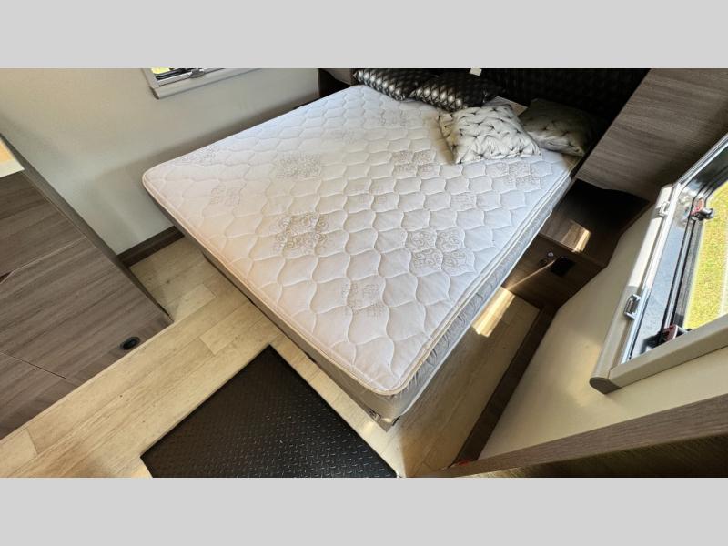 Make each camping trip count in this travel! When you get to your destination you can unload your gear from the exterior pass-through storage, then set up the 22' 6" batwing style awning. There is a full kitchen with a cooktop inside to prepare lunch on, plus a 6.9 cu. ft. refrigerator for food storage and a sink to clean up. Head out to find a trail or two, then come back to clean up in the full rear bath that includes a shower and a dry flush toilet, which eliminates the need for a black tank. The full size walk-around bed (RV full) will provide a great night's rest, and there is overhead storage space on each side of the bed for convenience.