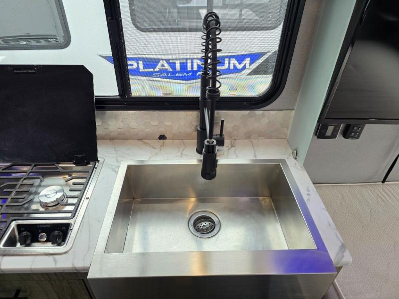 You will love the added space in this travel trailer that can sleep four people each night. There is a queen-size bed in the back, plus a convertible U-shaped dinette up front for the kids or your camping friends. The kitchen includes a two burner stainless steel cooktop, a stainless steel microwave, and a 3.7 3-way refrigerator for your perishables. You can also add the optional 10' power awning outside for shade as you visit with loved ones! This model has a dry weight that ranges from 3,230-3,372 lbs., a tongue weight between 465-495, and a carrying capacity between 525-610 lbs.