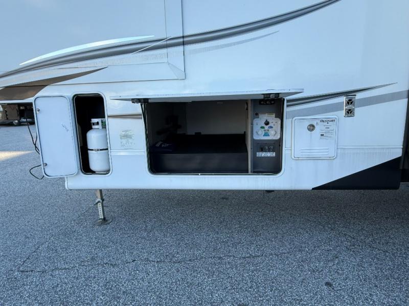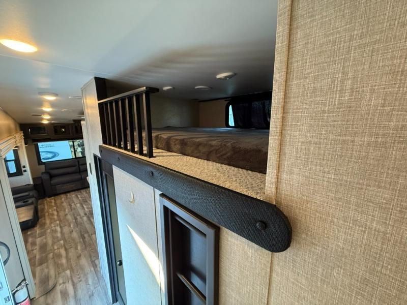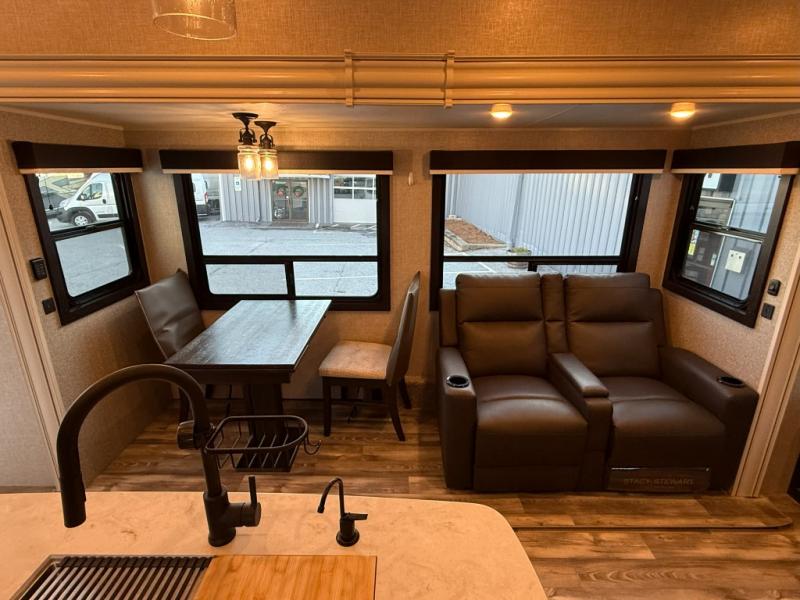 This fifth wheel with four slides is one your whole crew will love! There is a middle bunkhouse with a tri-fold sofa, a top bunk, and a desk, allowing this room to become an office if you need it. The loft above the bunkhouse will be a big hit with the little ones, and the full bath is centrally located so everyone can use it easily. You will have the front private bedroom all to yourselves with a king bed slide out, a chest with an TV, plus washer and dryer prep in the walk-in closet. The main living area includes everything you need to relax in comfort, like the theater seats, tri-fold sofa, and entertainment center with a fireplace. The chef will enjoy the extra counter space provided by the kitchen island, and there is plenty of storage with the walk-in pantry, the hutch, and the 21 cu. ft. residential refrigerator. This model even has an outside kitchen, two power awnings, and outside storage for all your gear!