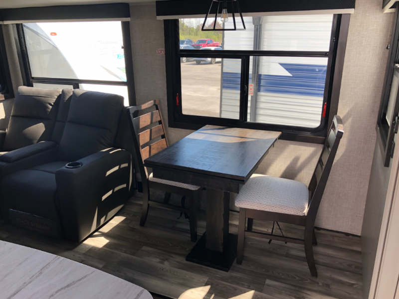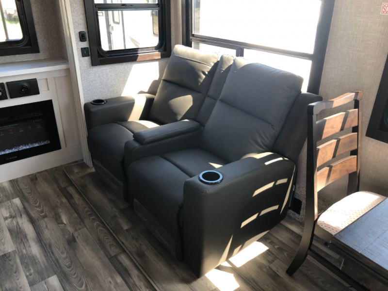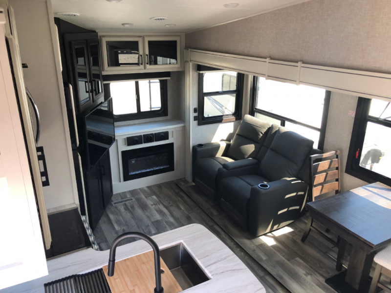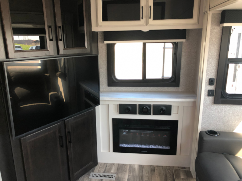 This travel trailer is perfect for two people with a passion for camping! Start each morning feeling well rested after sleeping on the queen bed in the front private bedroom and it has wardrobes on either side of it, plus a wardrobe/linen closet with washer and dryer prep. Grab some eggs from the refrigerator and fry them up on the three burner stainless steel range then enjoy them at the free standing table and chairs. Behind the entertainment center is a walk-in pantry to store your favorite snacks and enjoy them while you relax on the tri-fold sofa. You can even add the optional fireplace to make your evenings cozier!