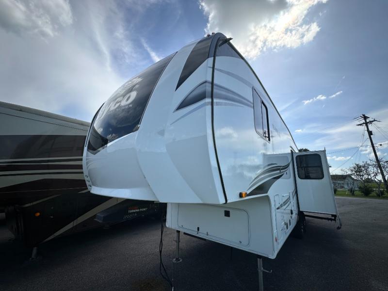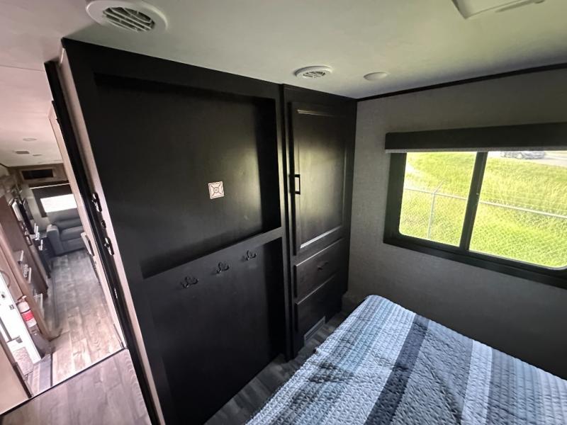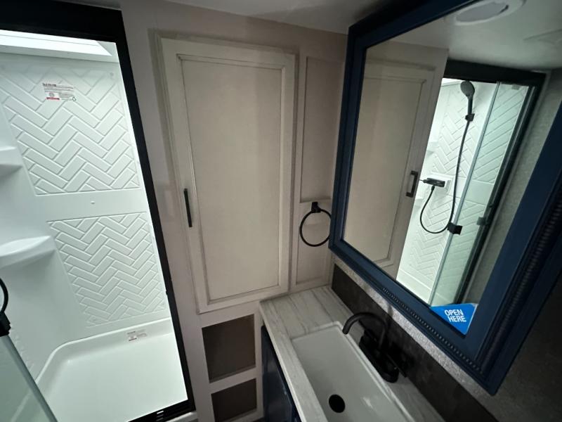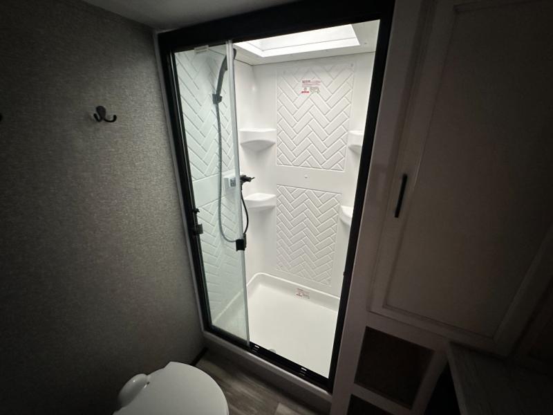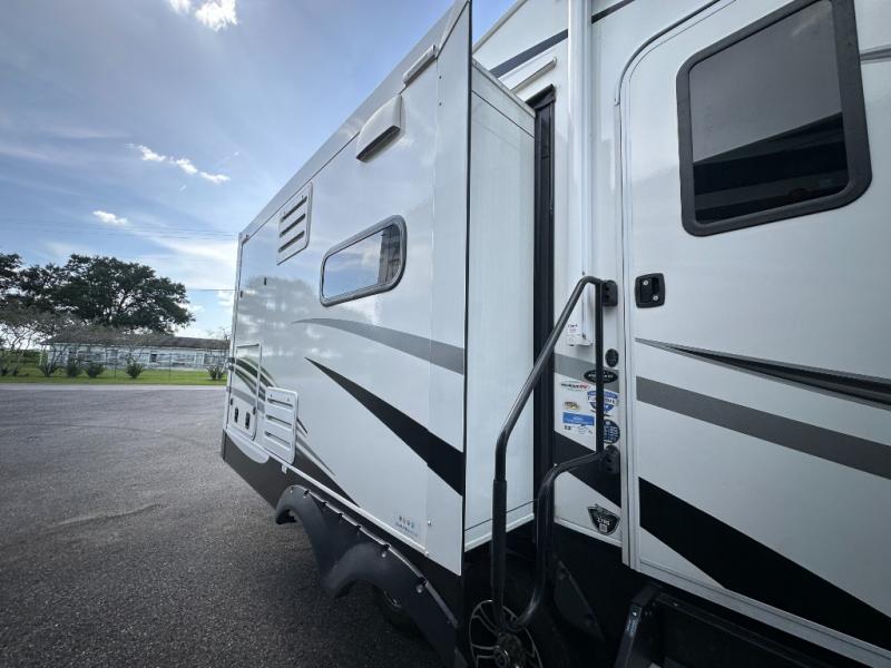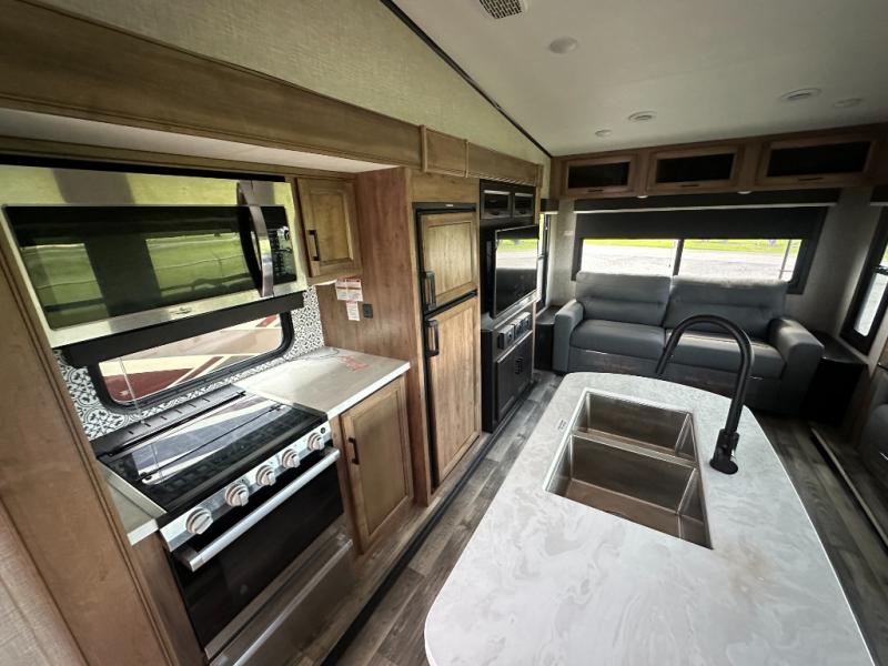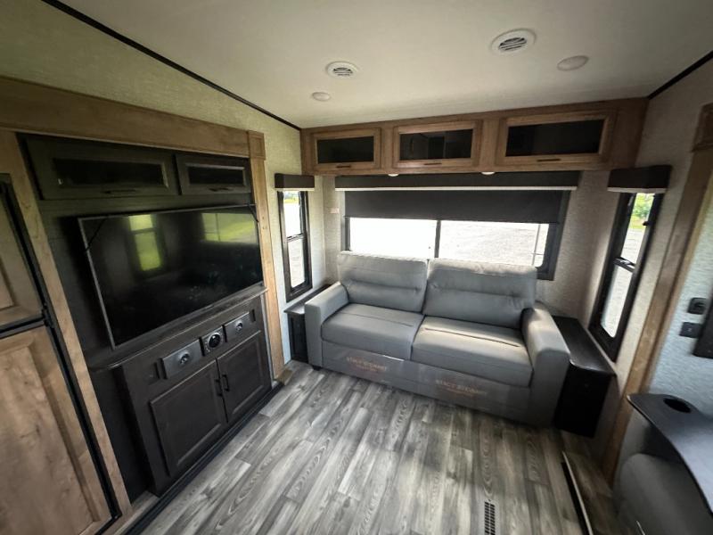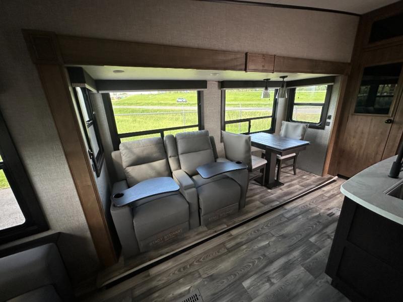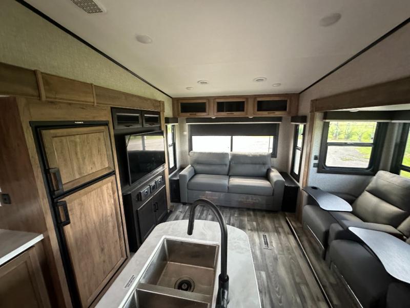 You're going to feel right at home in this fifth wheel! The kitchen island makes your meal prepping easier and you can enjoy your meals at the free standing table and chairs. There is plenty of storage space throughout between the overhead cabinets, the entry wardrobe, the kitchen pantry, and the wardrobe/linen closet in the front private bedroom. The bedroom also has a queen bed with wardrobes and nightstands on either side to set your glass of water or phone. After a fun day of exploring, you can freshen up in the full bathroom with the shower and then relax in the rear living area on either the tri-fold sofa or the theater seating across from the entertainment center which has an optional fireplace to add for even more comfort!