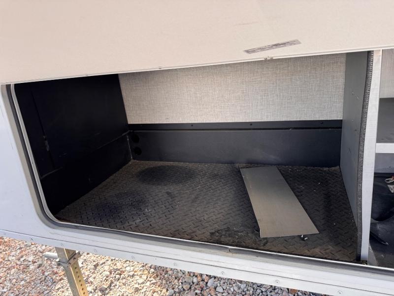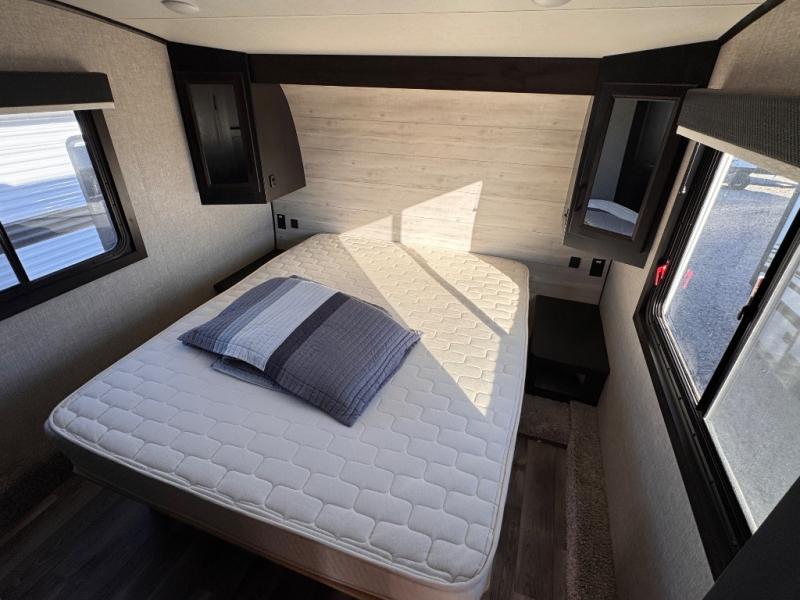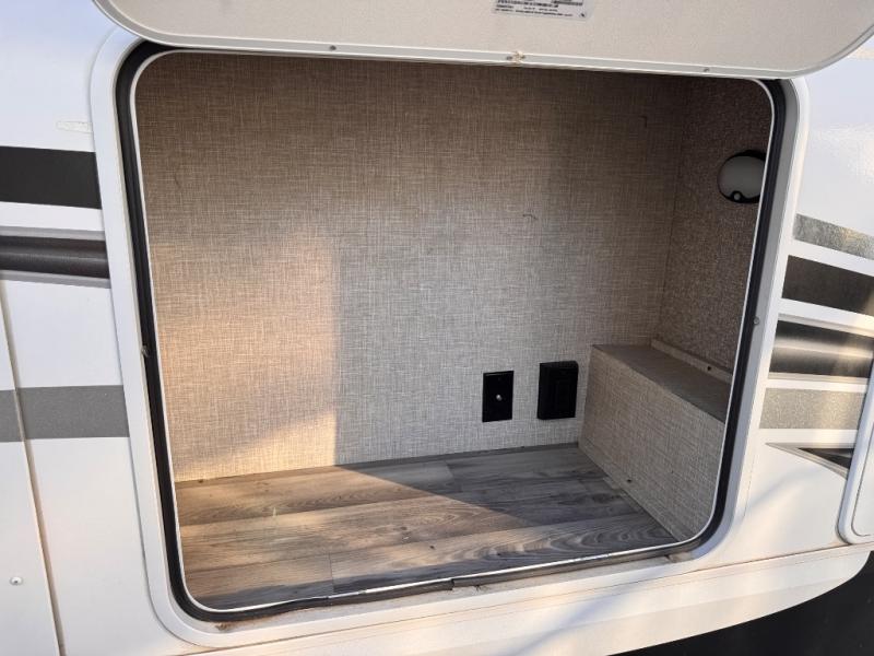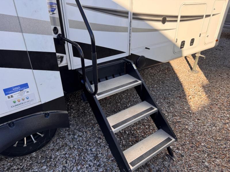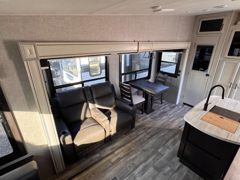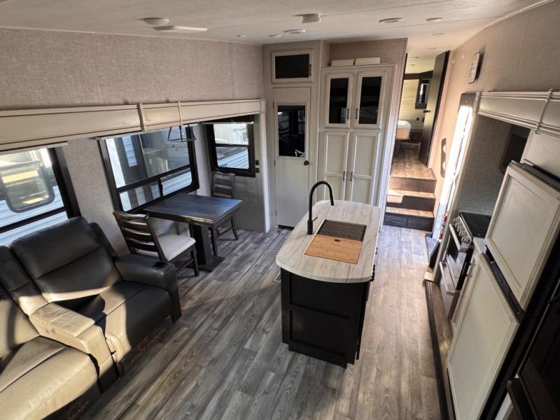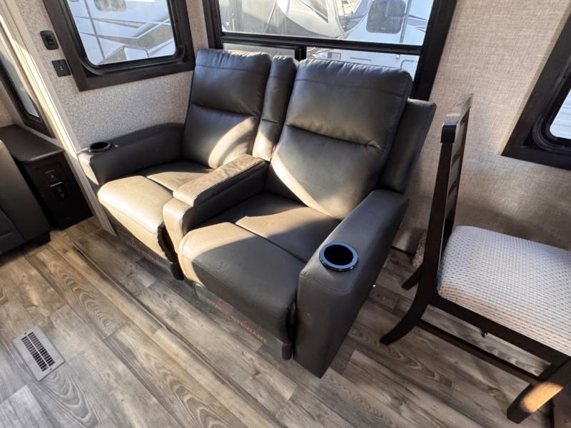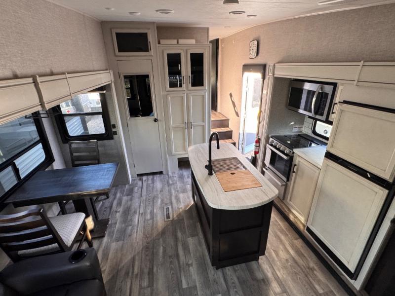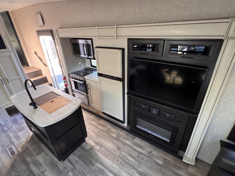 You're going to feel right at home in this fifth wheel! The kitchen island makes your meal prepping easier and you can enjoy your meals at the free standing table and chairs. There is plenty of storage space throughout between the overhead cabinets, the entry wardrobe, the kitchen pantry, and the wardrobe/linen closet in the front private bedroom. The bedroom also has a queen bed with wardrobes and nightstands on either side to set your glass of water or phone. After a fun day of exploring, you can freshen up in the full bathroom with the shower and then relax in the rear living area on either the tri-fold sofa or the theater seating across from the entertainment center which has an optional fireplace to add for even more comfort!