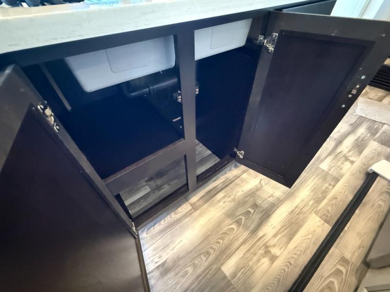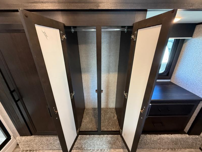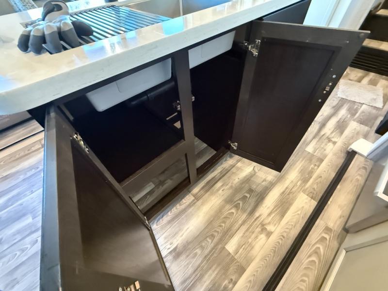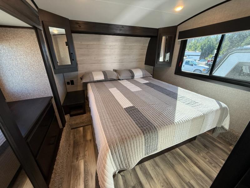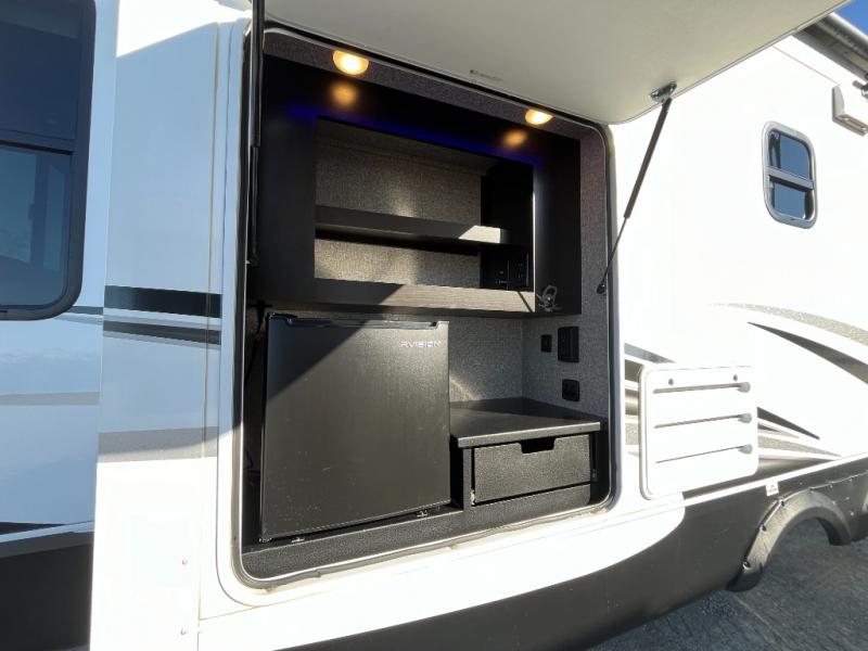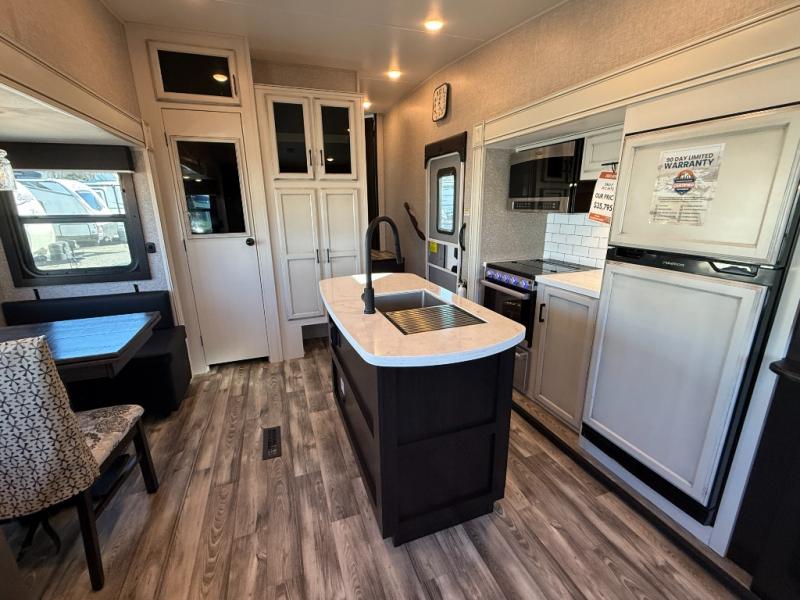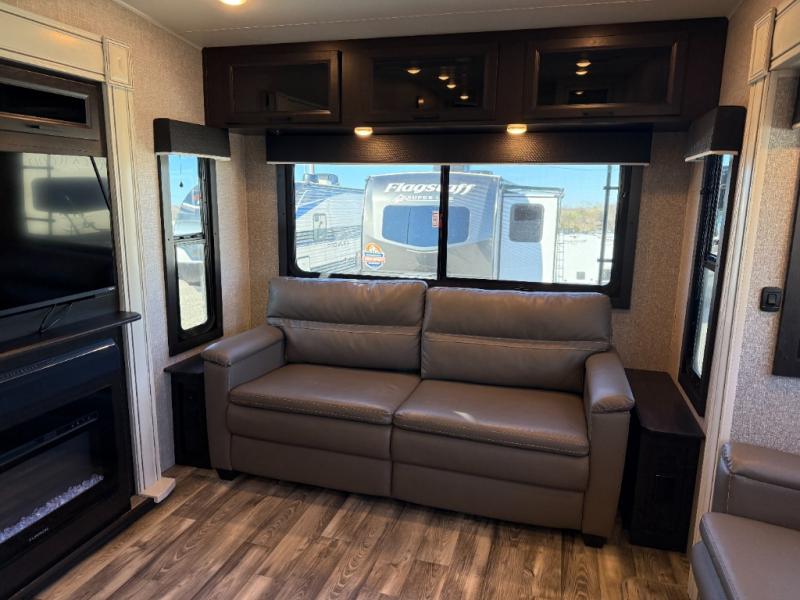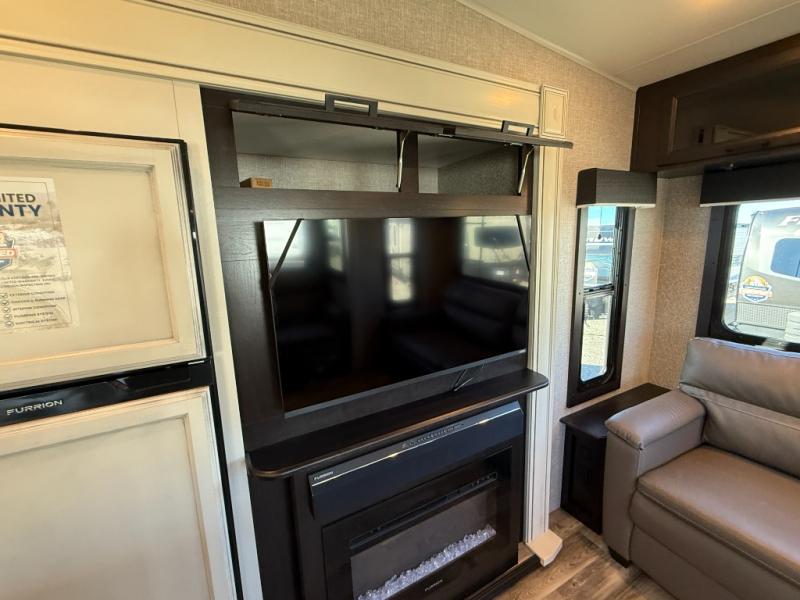 Don't pass up your chance to camp in true comfort with this fifth wheel! It features a rear living area with a tri-fold sofa for an afternoon nap and theater seating across from the entertainment center with a fireplace. The chef can choose to either prepare their meals indoors with the kitchen island and the three burner stainless steel range or at the outside kitchen with a refrigerator to enjoy a cold beverage while cooking. Hang your coats in the entry wardrobe and store your canned goods in the kitchen pantry. The dual entry bathroom has a radius shower to clean up in and is easy to access, especially those staying in the front private bedroom. The bedroom also has a wardrobe slide with a dresser and linen closet, as well as wardrobes on either side of the queen bed!