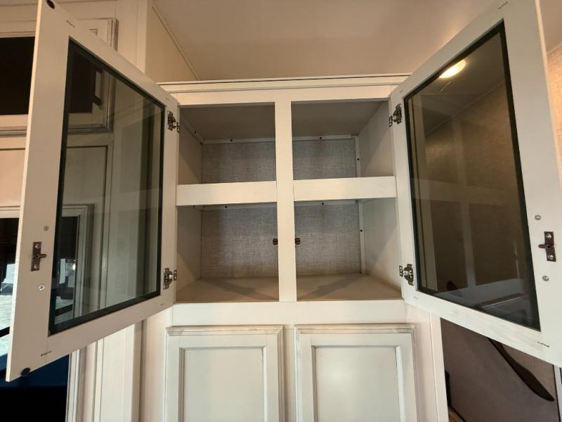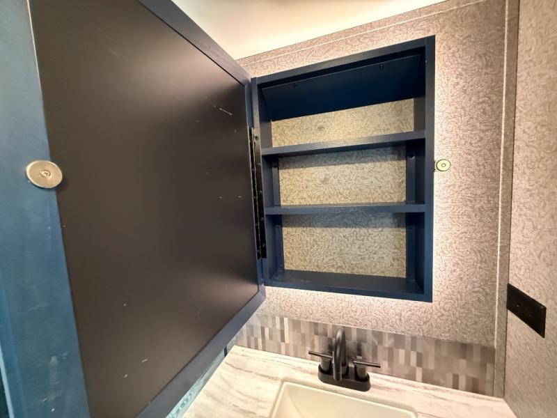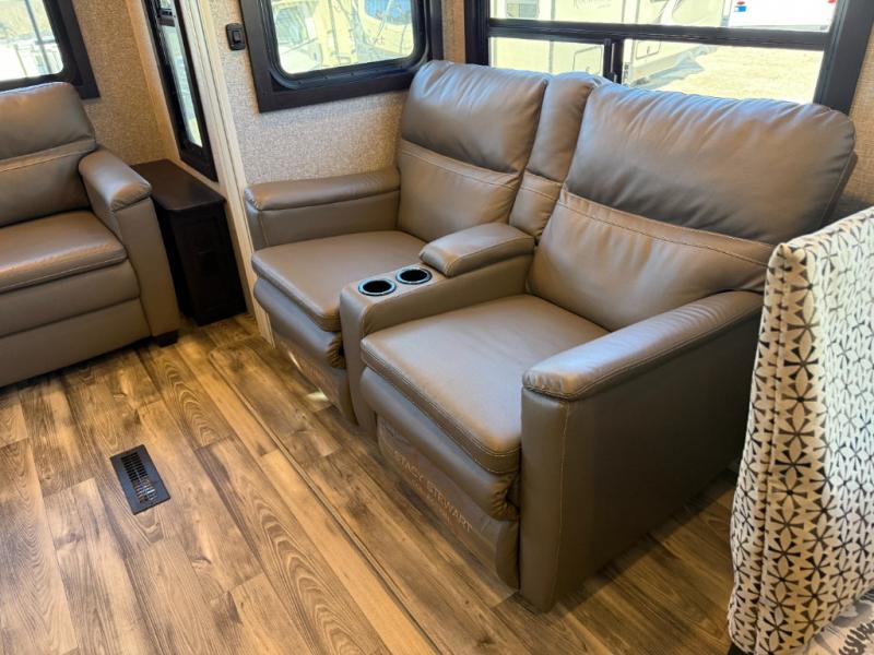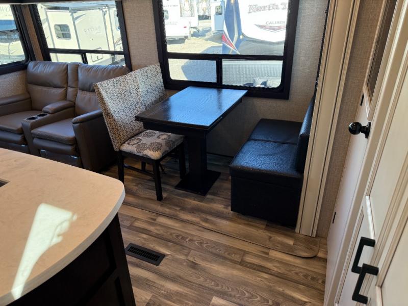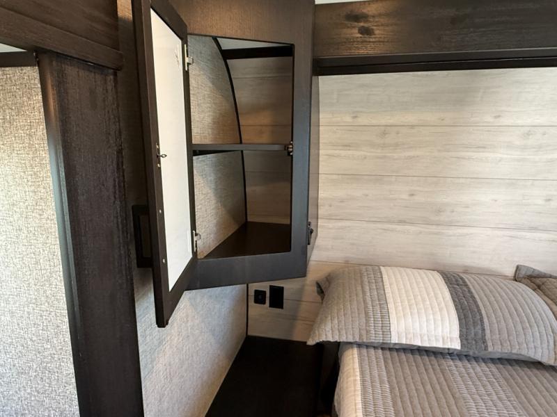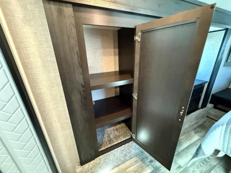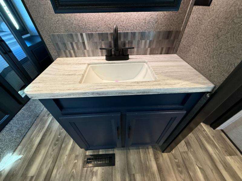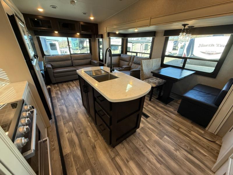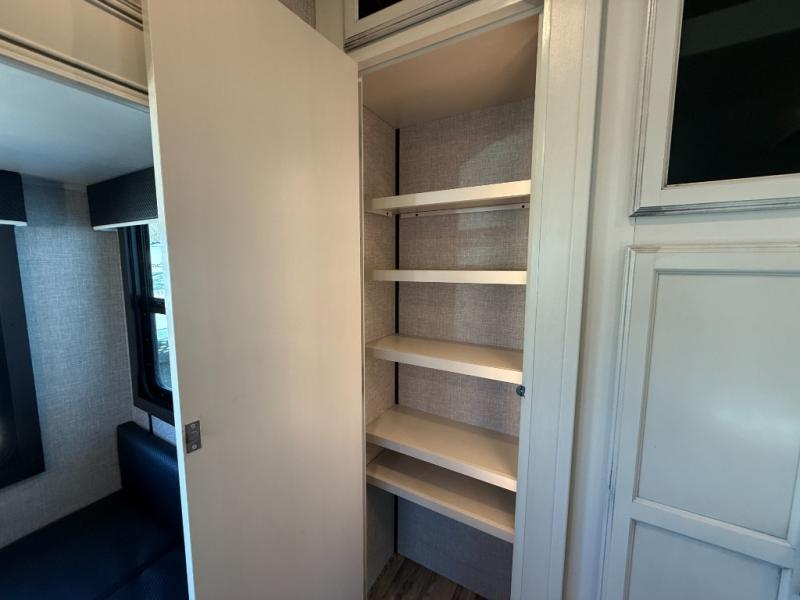 Don't pass up your chance to camp in true comfort with this fifth wheel! It features a rear living area with a tri-fold sofa for an afternoon nap and theater seating across from the entertainment center with a fireplace. The chef can choose to either prepare their meals indoors with the kitchen island and the three burner stainless steel range or at the outside kitchen with a refrigerator to enjoy a cold beverage while cooking. Hang your coats in the entry wardrobe and store your canned goods in the kitchen pantry. The dual entry bathroom has a radius shower to clean up in and is easy to access, especially those staying in the front private bedroom. The bedroom also has a wardrobe slide with a dresser and linen closet, as well as wardrobes on either side of the queen bed!