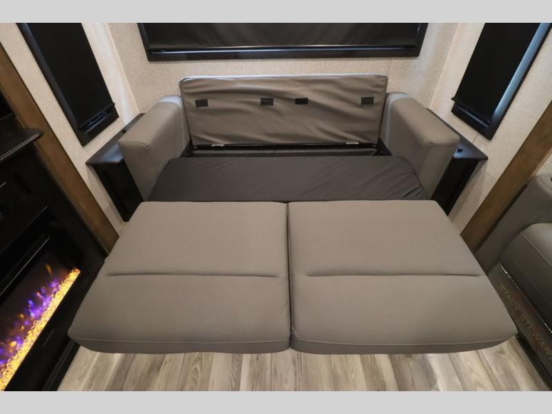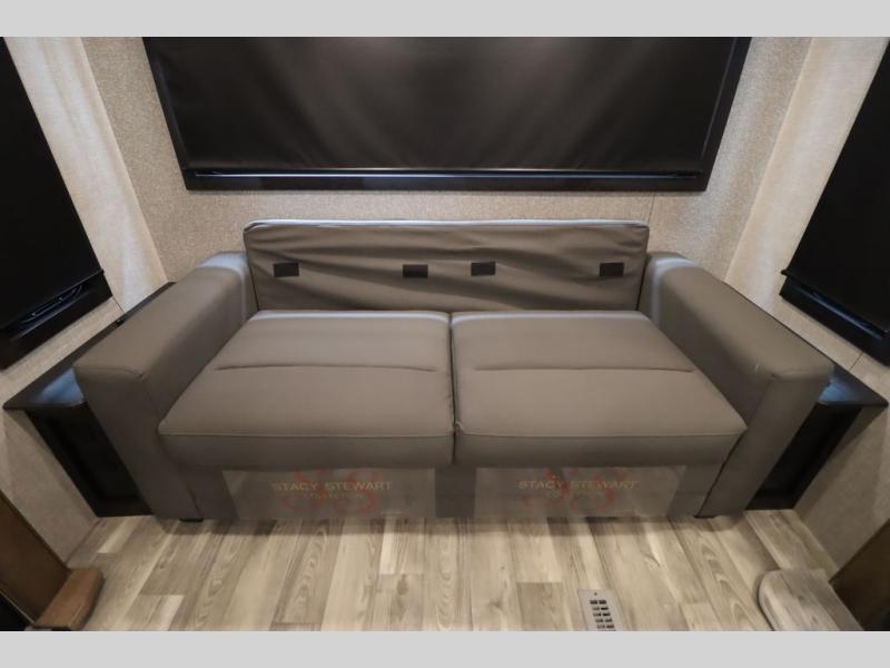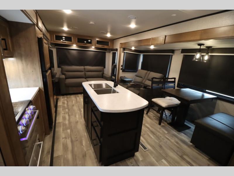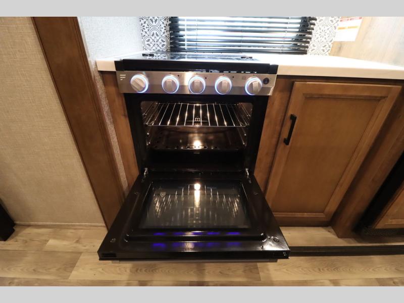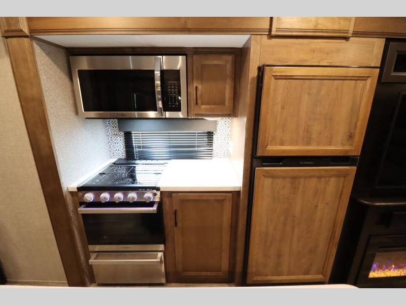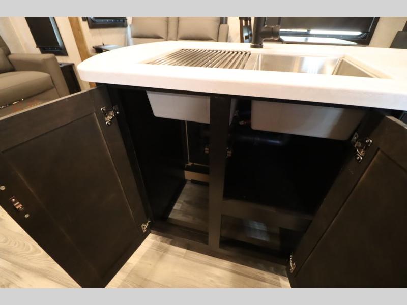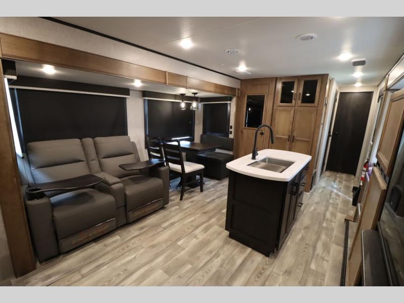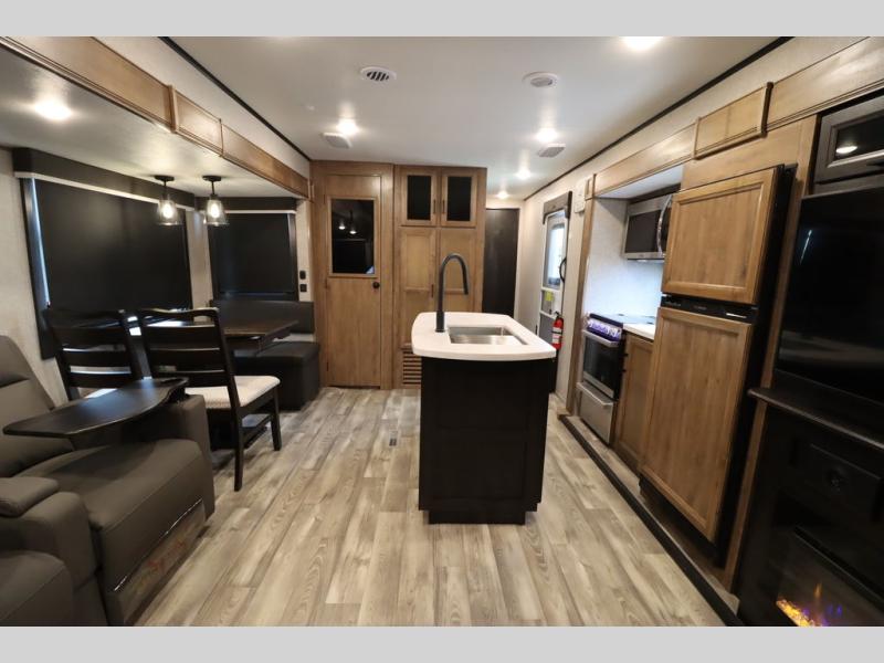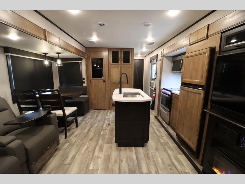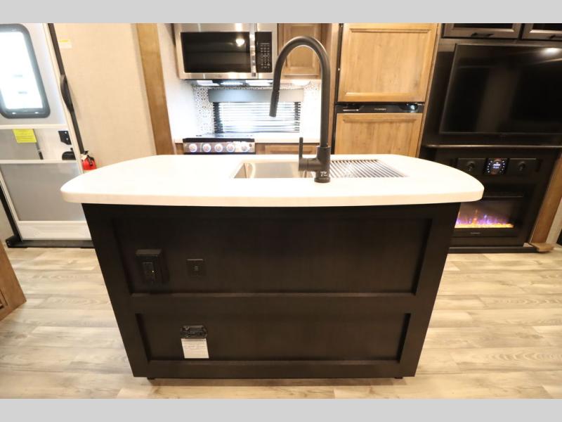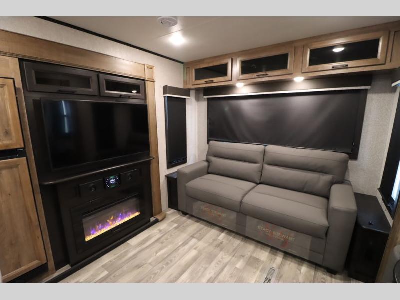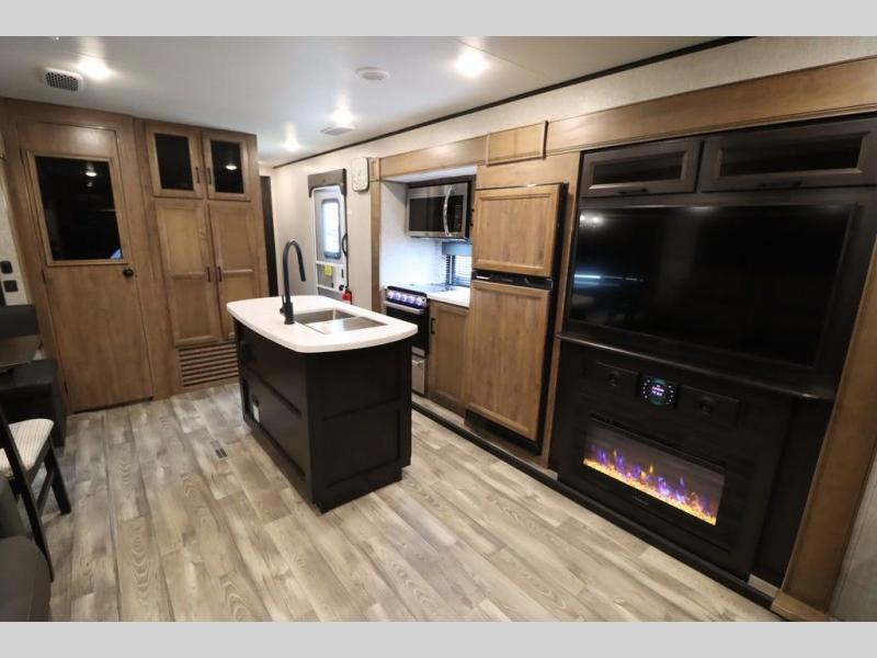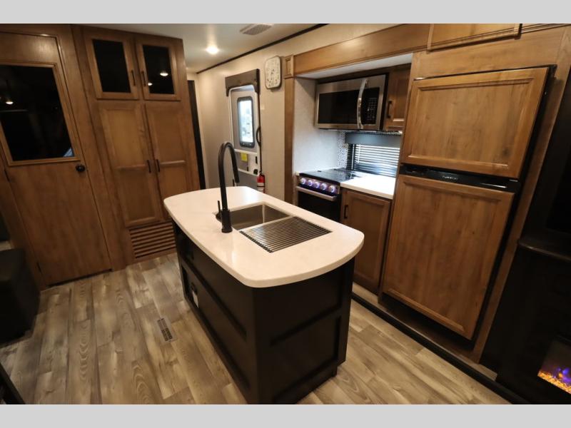 This travel trailer is perfect for two people who love to go on adventures! Start each morning feeling recharged after sleeping on the queen bed in the front private bedroom, and there is a wardrobe/linen closet with washer/dryer prep if you plan to add a washer and dryer. The coat closet/pantry serves a dual purpose and there is an additional pantry next to it for the rest of your canned goods. The chef can choose to either cook indoors with the three burner stainless steel range and kitchen island or at the outside kitchen with a refrigerator to keep their beverage cold and overhead cabinets for their cooking essentials. Relax each evening in the rear living area with the tri-fold sofa and the theater seating across from an entertainment center with a fireplace!